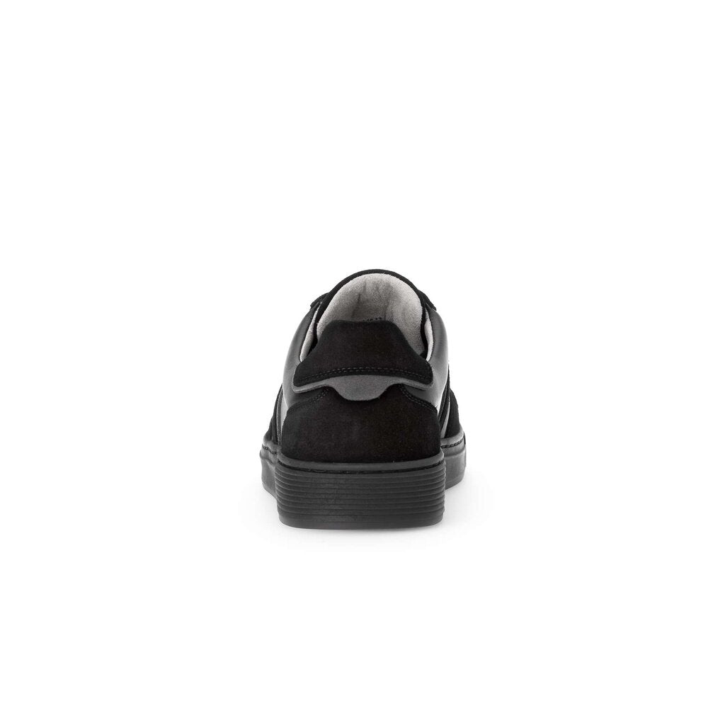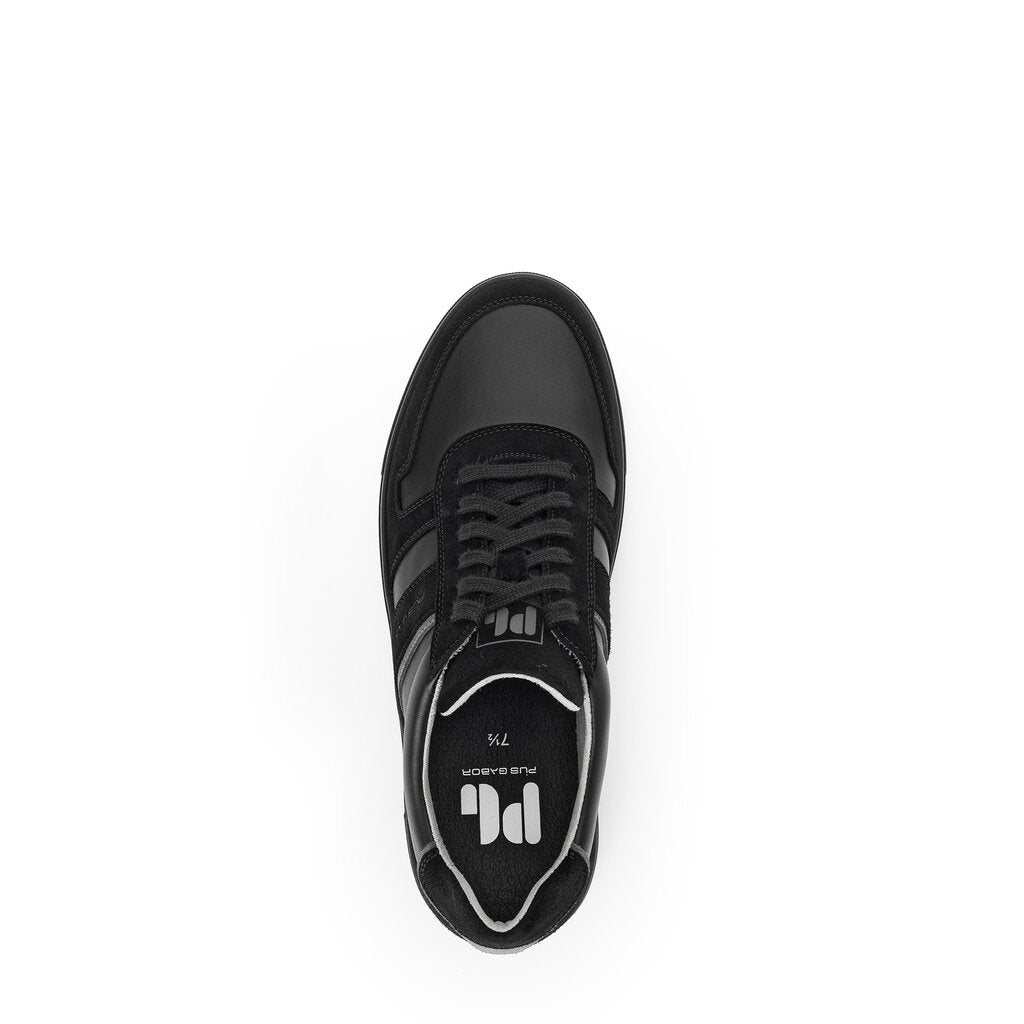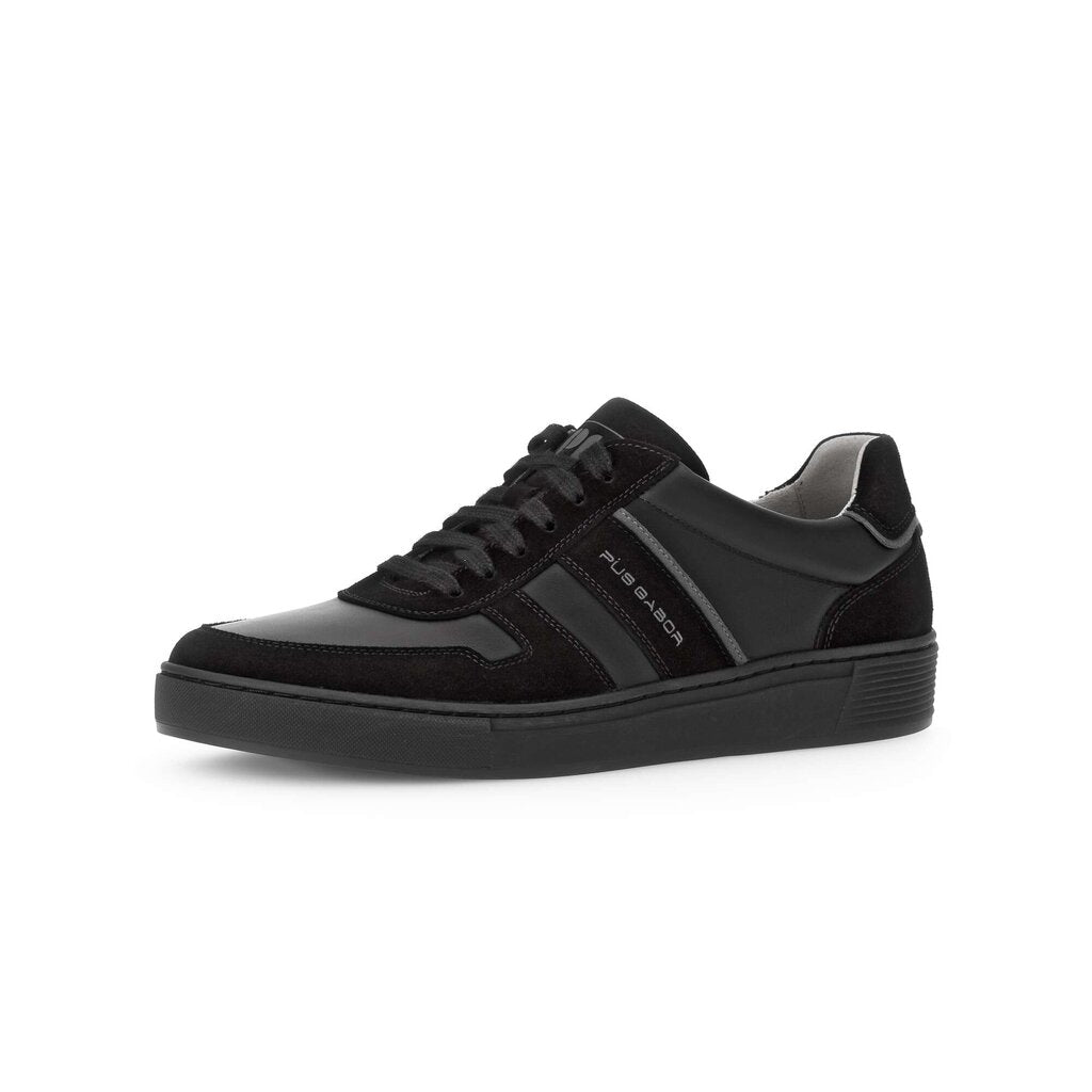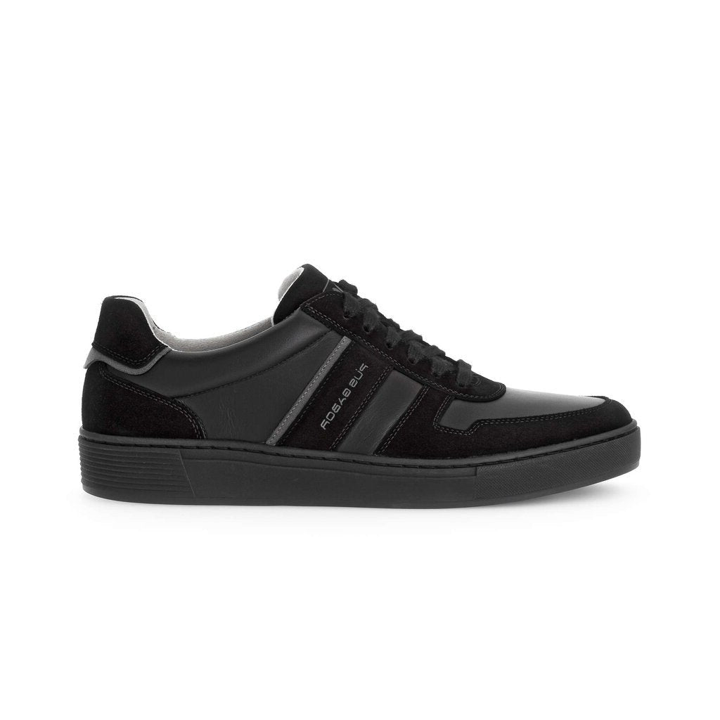 Mens high quality German designer smart casual sneakers. All black two tone suede and smooth leather sneakers with matching black soles. These comfortable soft leather shoes are made in a generous G fitting width and feature extra thick cushioned leather insoles and soft, breathable lining.