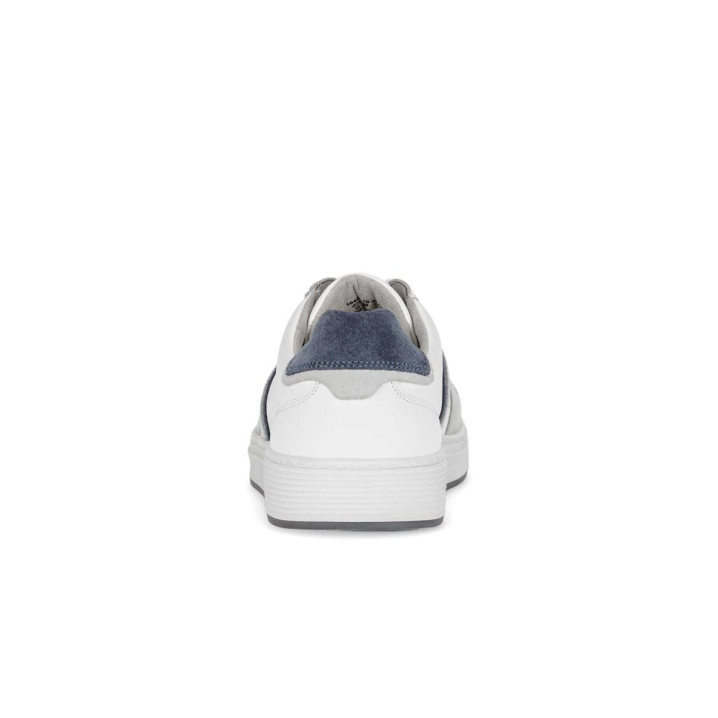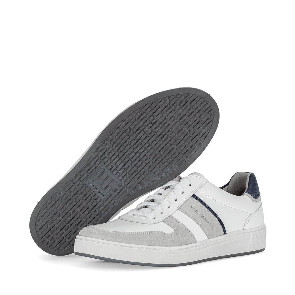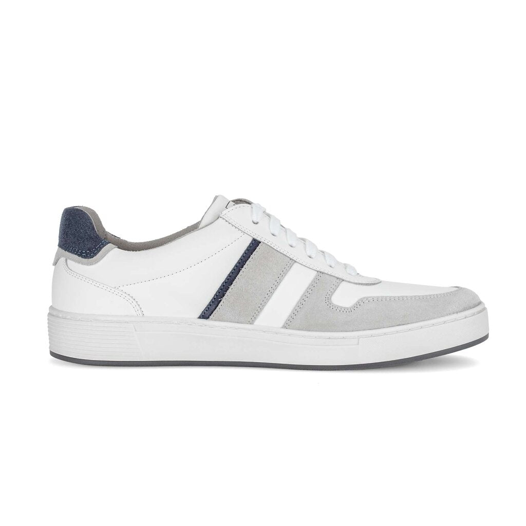Mens high quality German designer smart casual sneakers. Soft white leather sneakers with grey and blue accents. These comfortable soft leather shoes are made in a generous G fitting width and feature extra thick cushioned leather insoles and soft, breathable lining.