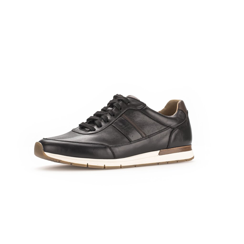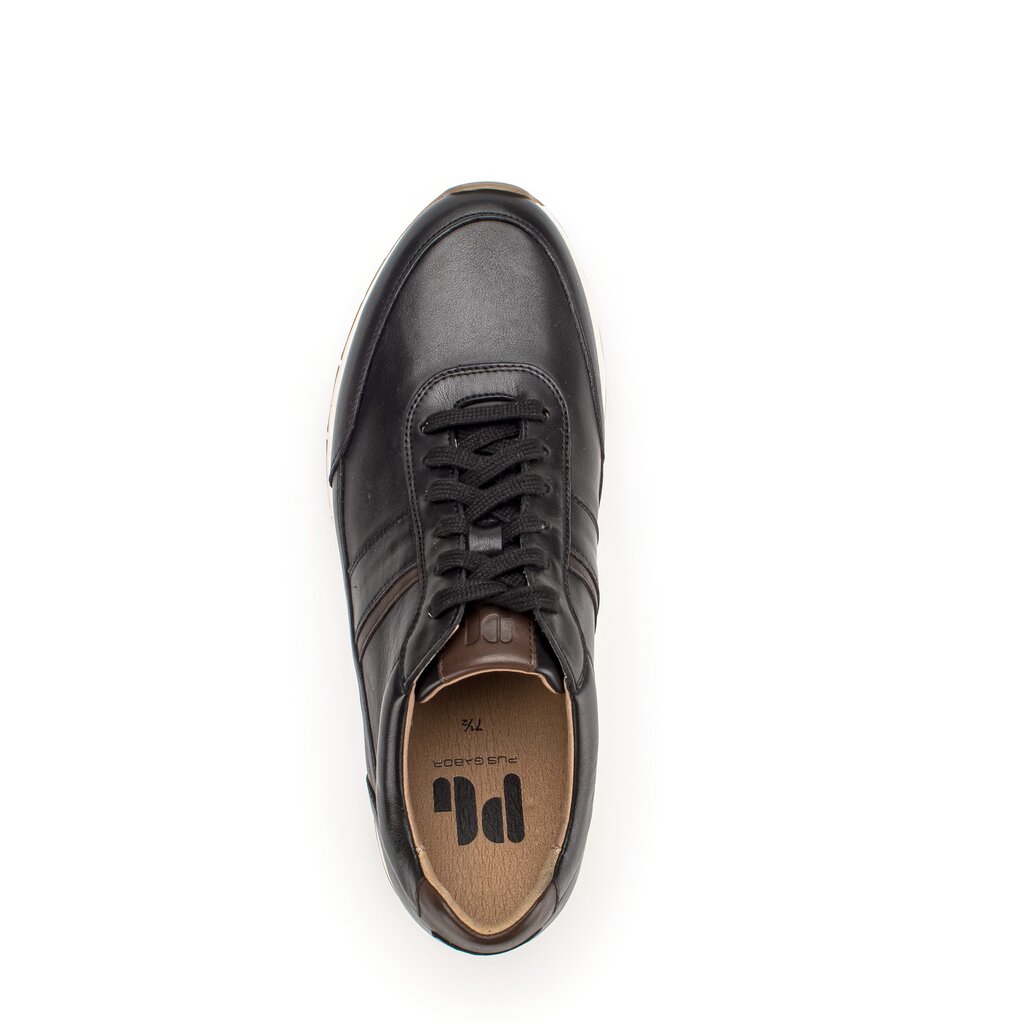 High quality smart black leather sneakers with dark brown trim and contrasting cream sole. These soft leather shoes feature a 3/4 leather lining and full leather cushioned insole. The padded heel collar and tongue ensures a comfortable fitting and minimizes slipping.