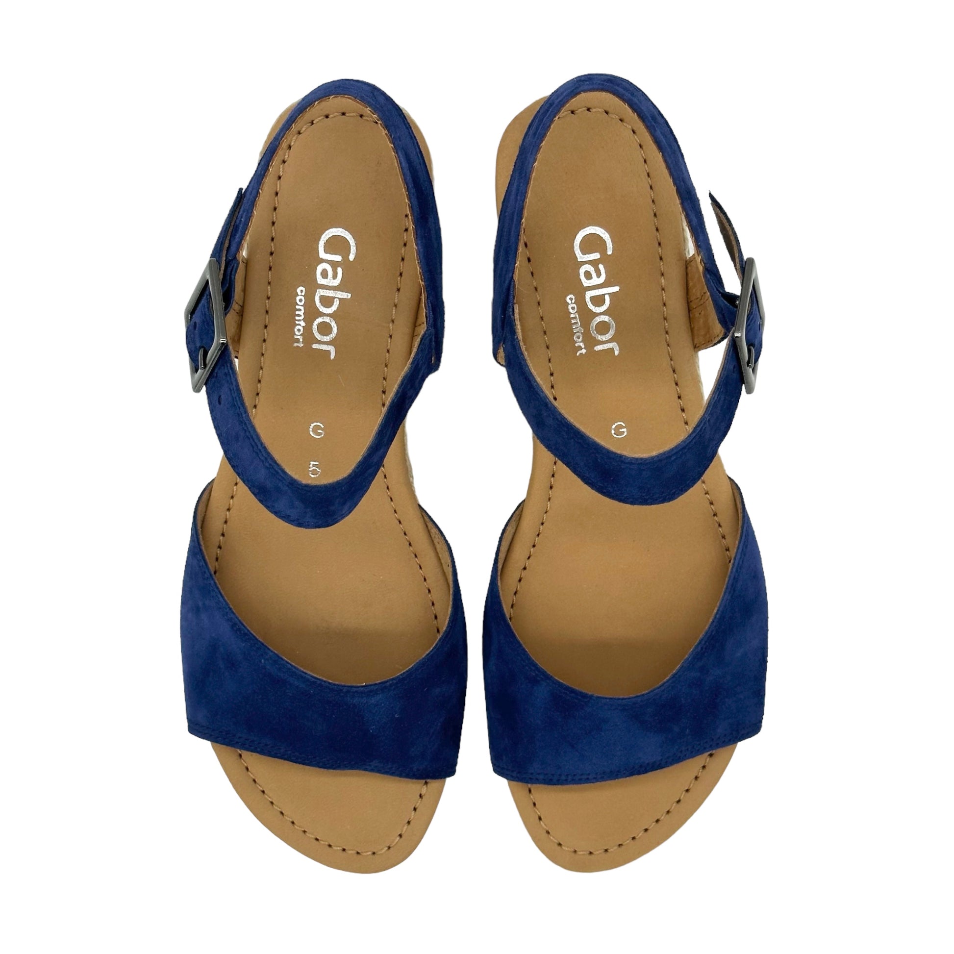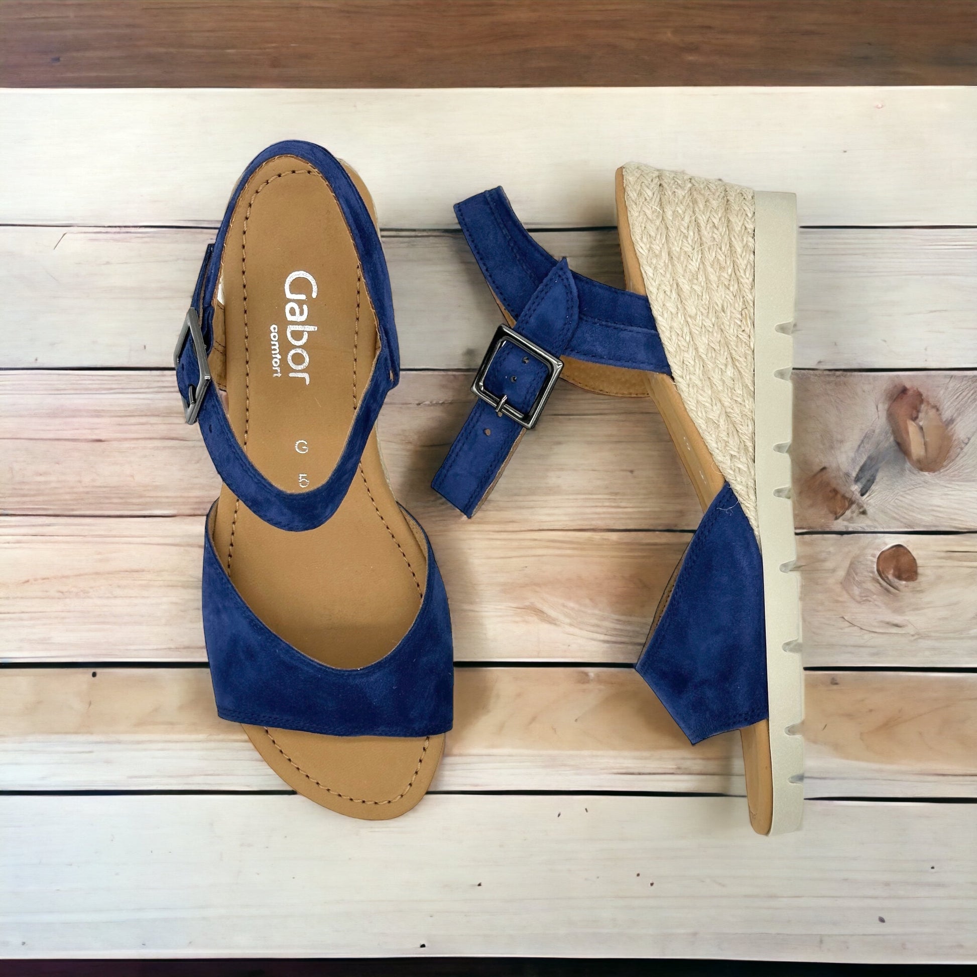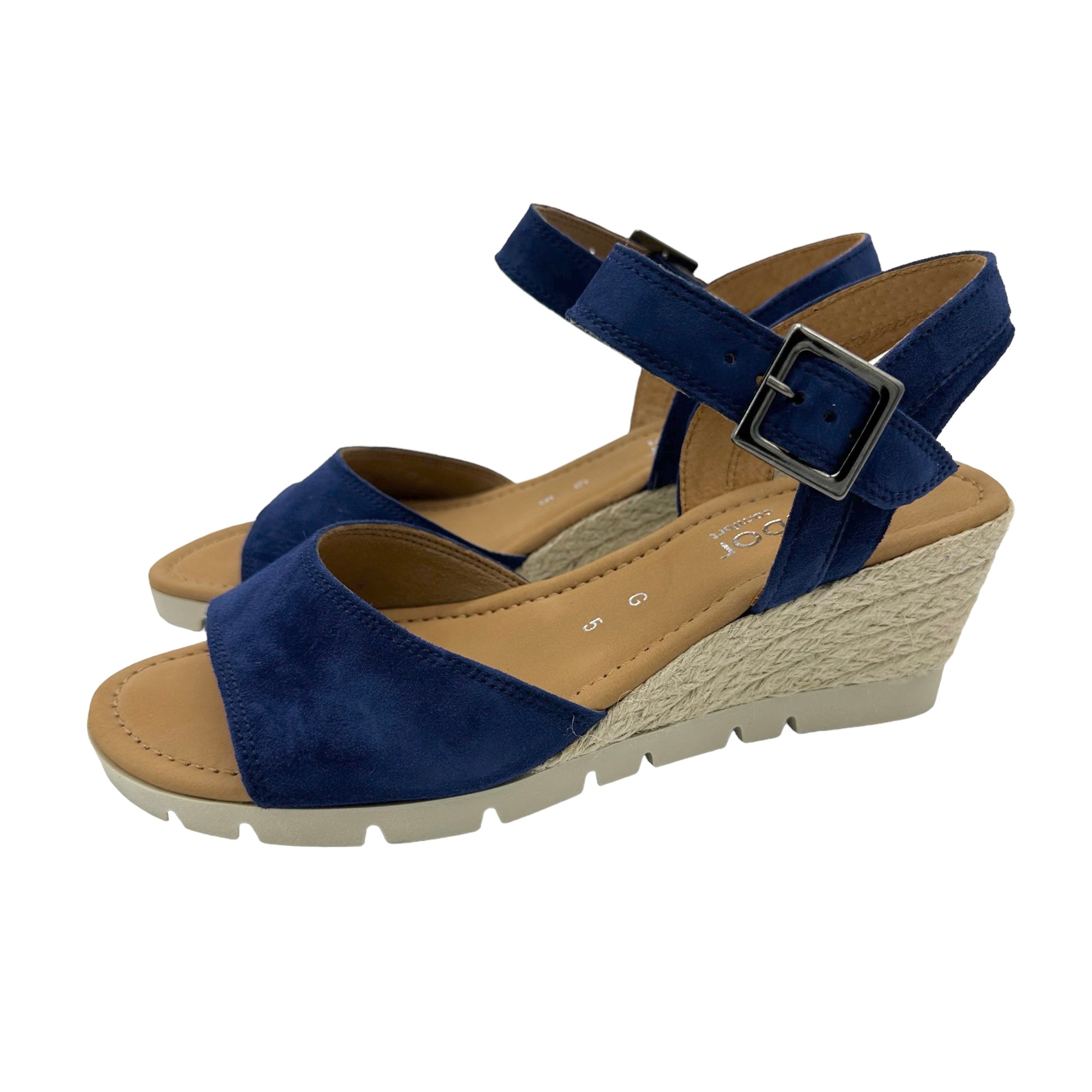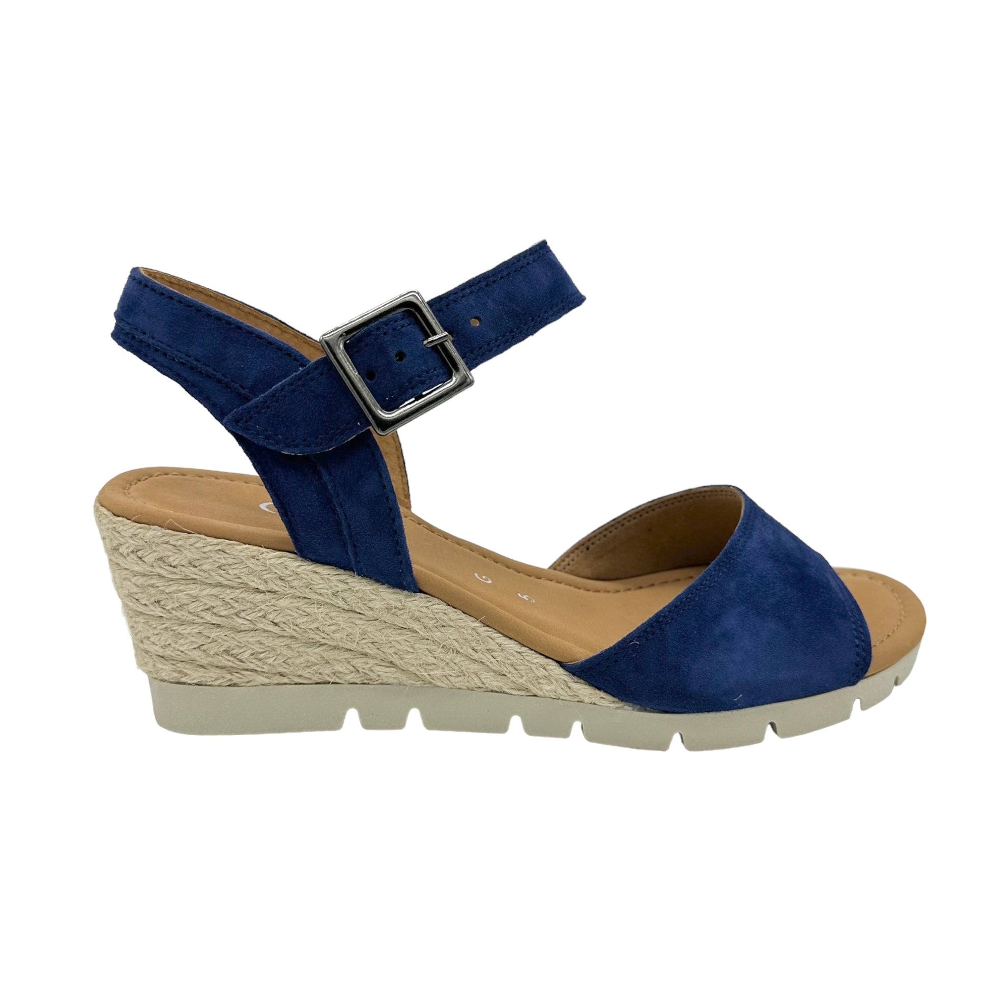 Gabor royal blue suede wedge sandals for any occasion. This ankle strap sandal is the only one you need to pack to compliment all your outfits. Made in soft suede leather with a textured rope covered wedge.