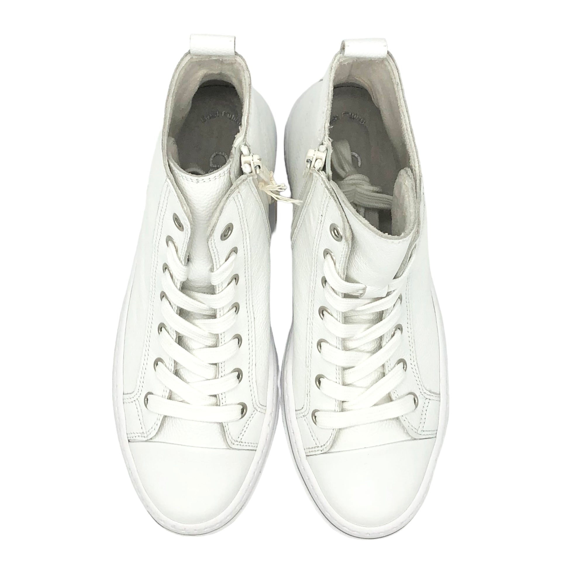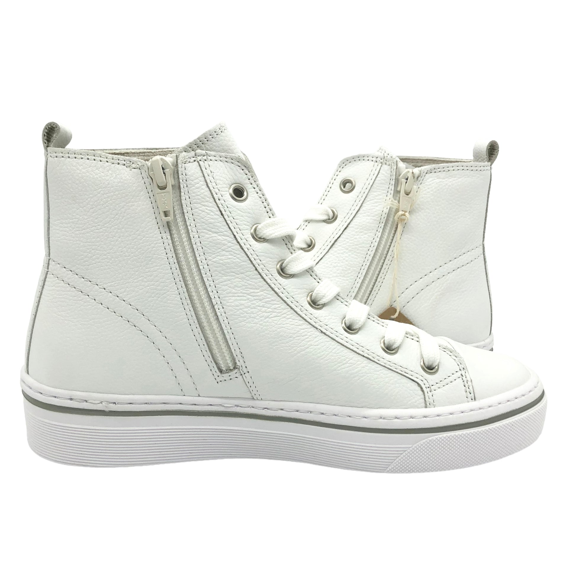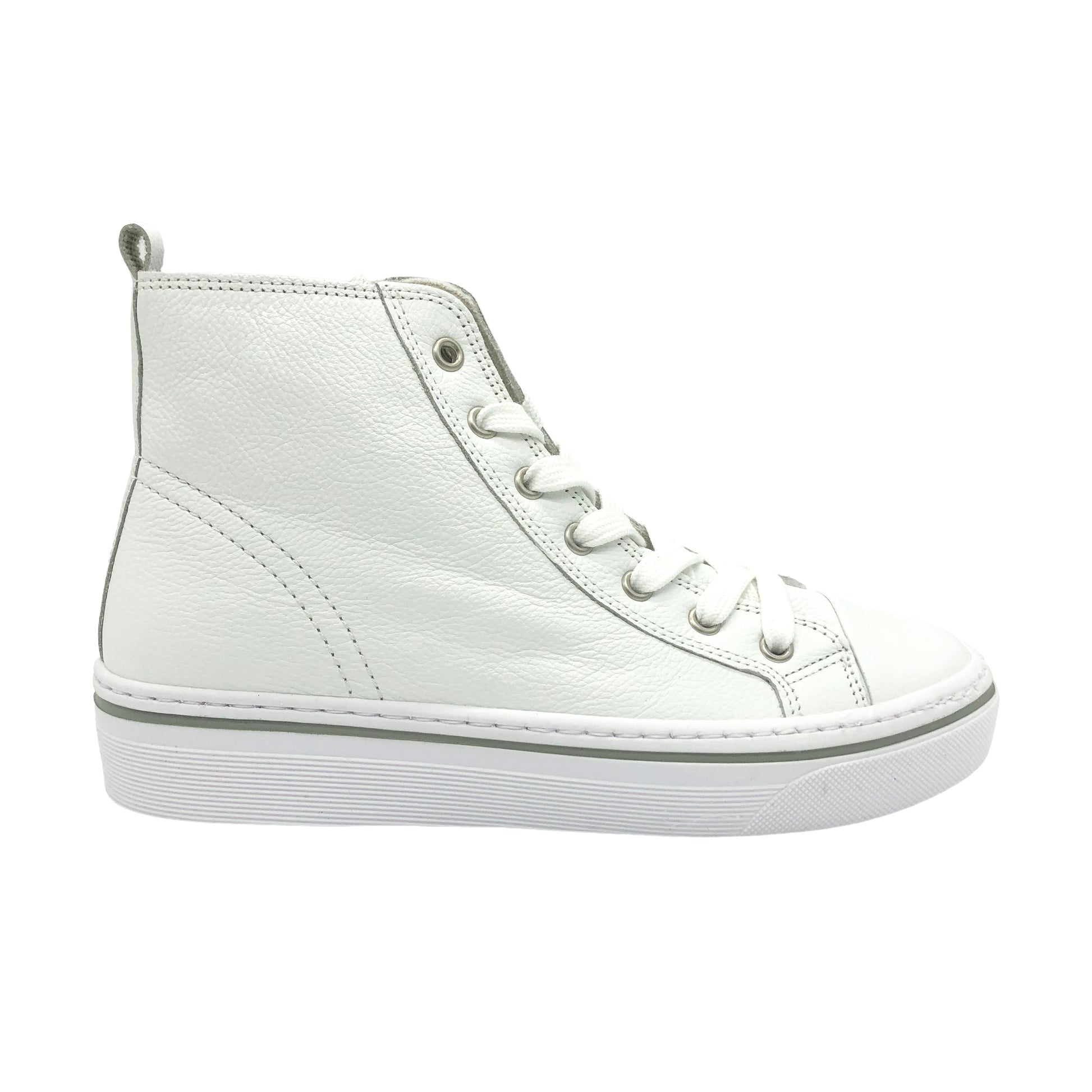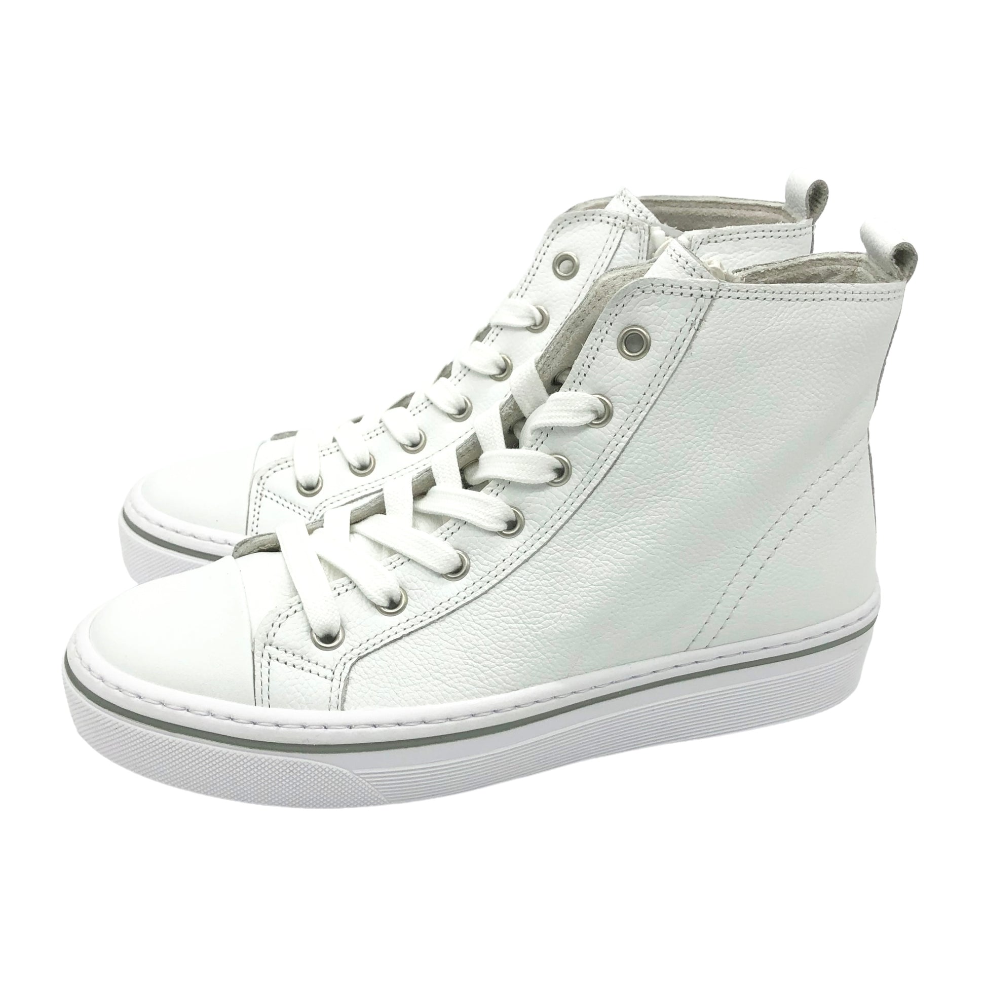 Gabor Women's white leather high top sneakers. These versatile sneakers look great with dress, short shorts or skinny jeans. The flexible mini platform is heaven to walk on and the soft leather upper makes caring for your new white sneakers much easier than their canvas counterparts.