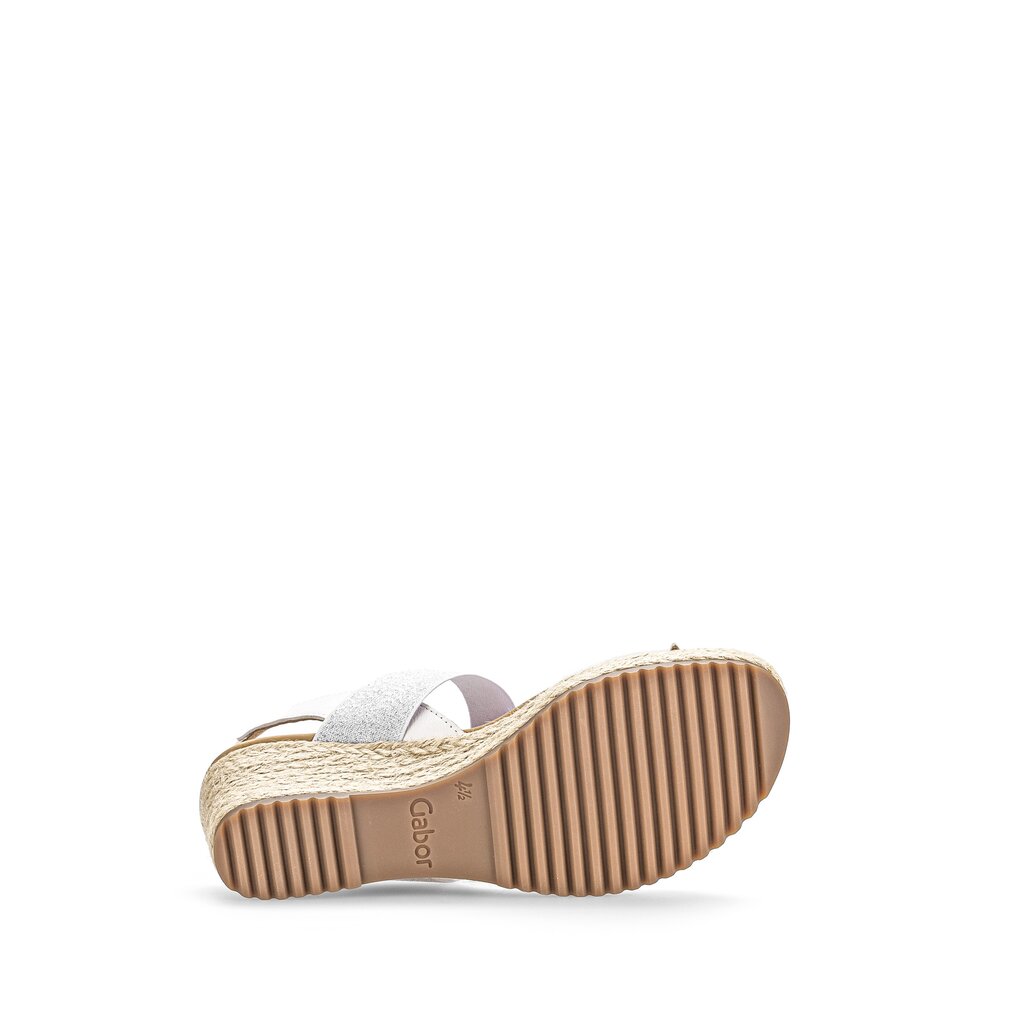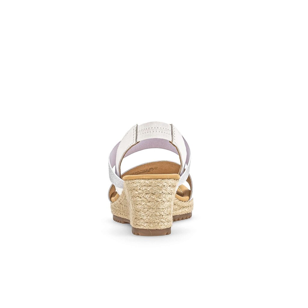 Gabor Spice in white smooth leather with a broad silver lurex effect elastic instep strap. These wedge sling back sandals are dressy enough for any occasion. This versatile sandal is the only one you need to pack to compliment all your outfits. Made in soft leather and elastic with a textured rope effect covered wedge.