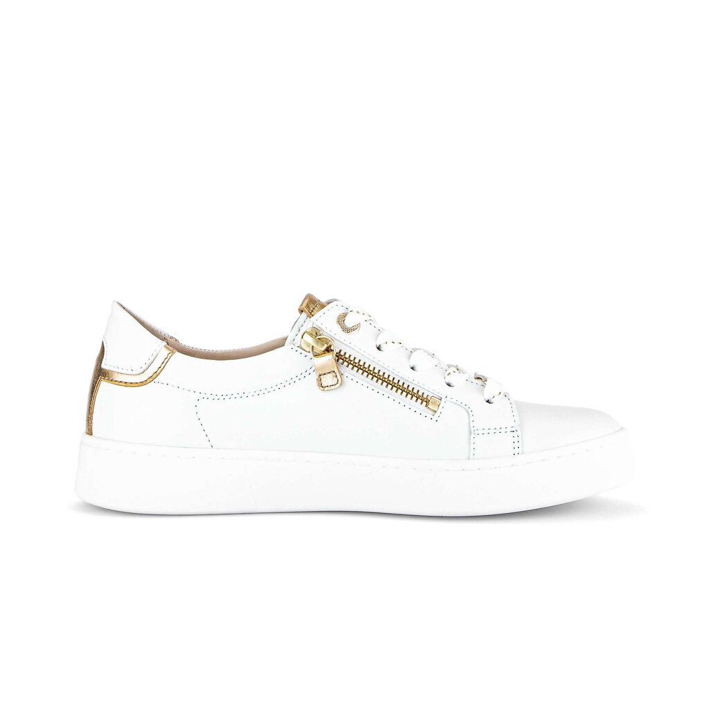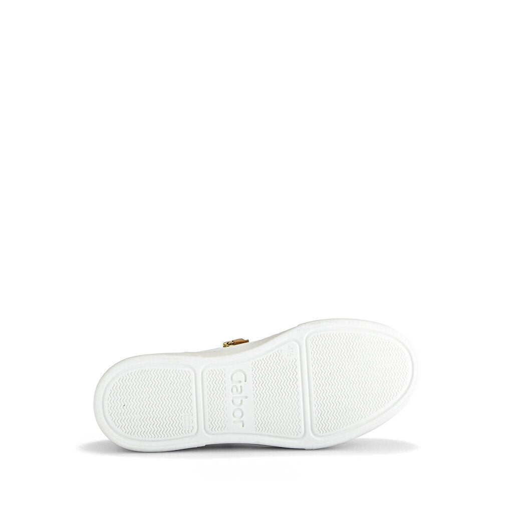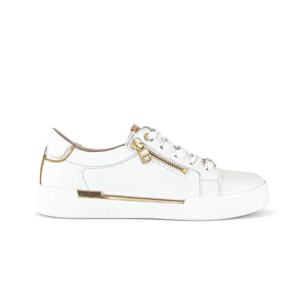 Gabor Chip modern round toe sneakers, great footwear for dresses and cut off jeans, Made in a smooth soft white leather with gold accents. Fresh white leather sneakers will combine with your pale denim cropped jeans for holidays and sight seeing. The gold accents take these sneakers to a more dressy level so they can traverse from day to evening wear easily.