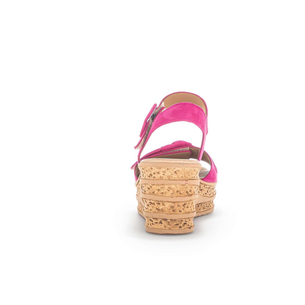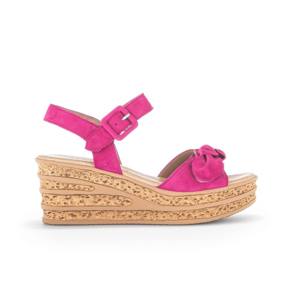 Golden fuchsia pink suede leather sandals with a sculpted cork effect wedge heel. Why not make a statement with these comfy wedge sandals which look great with a summer dress and are still comfy enough for all day wear and long walks. Please note: the adjustable straps are hook and loop fastening disguised as a buckle and as a soft bow.