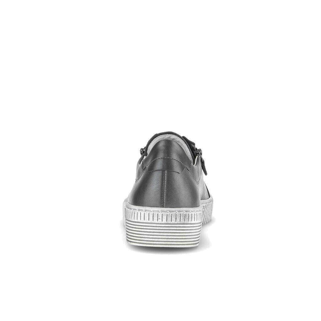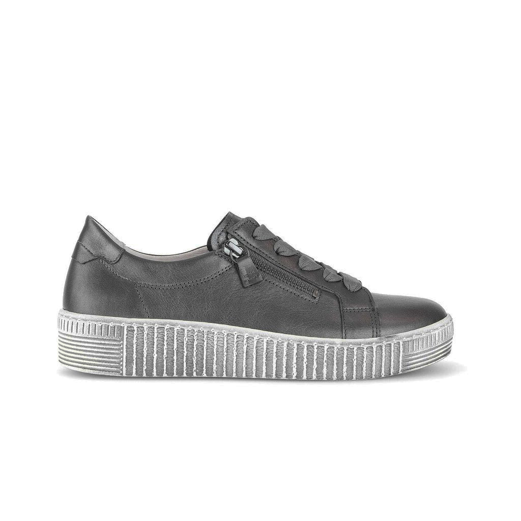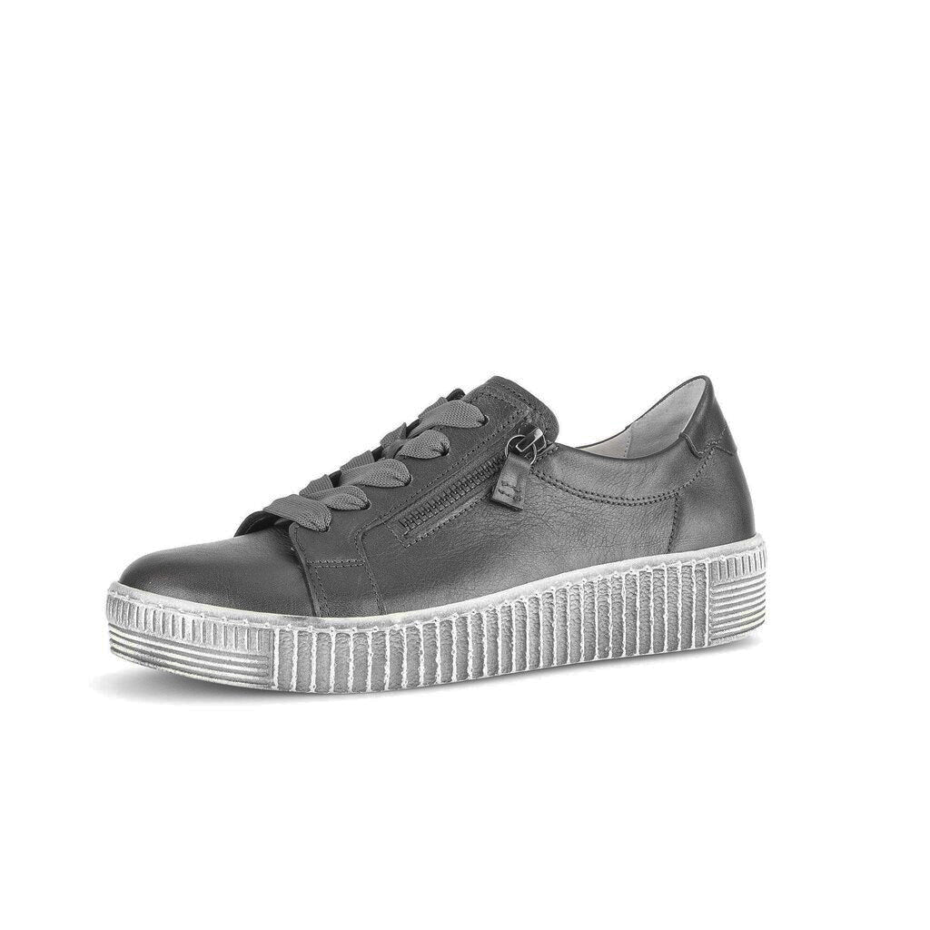 Gabor Wisdom classic round toe sneakers with neat low profile platform sole. This limited edition version of Gabor wisdom is made from a dark grey metallic leather upper. The manufacturers name for this colour is 'Antique Silver'.