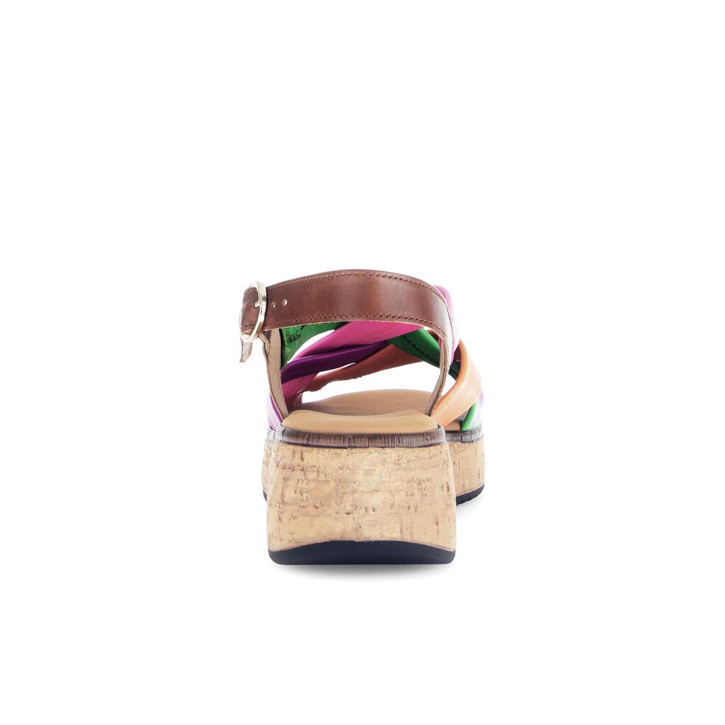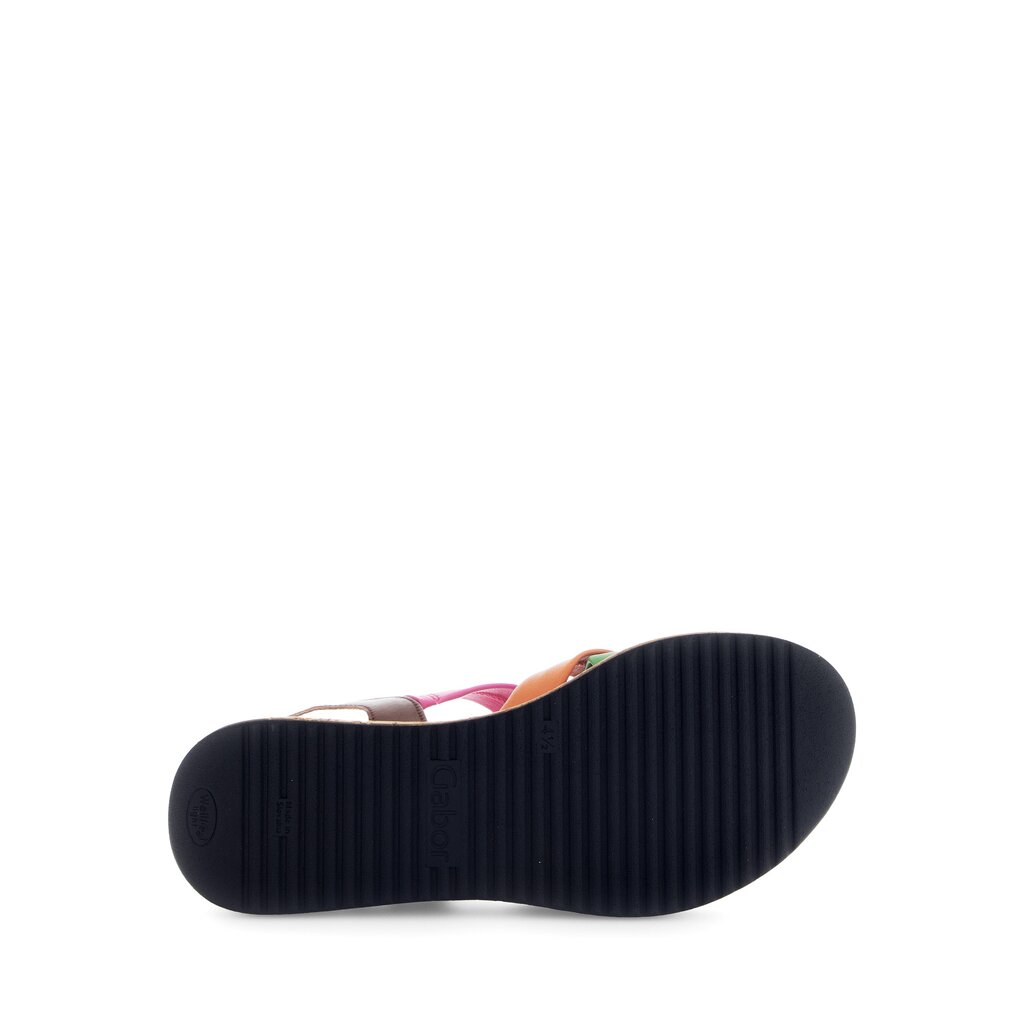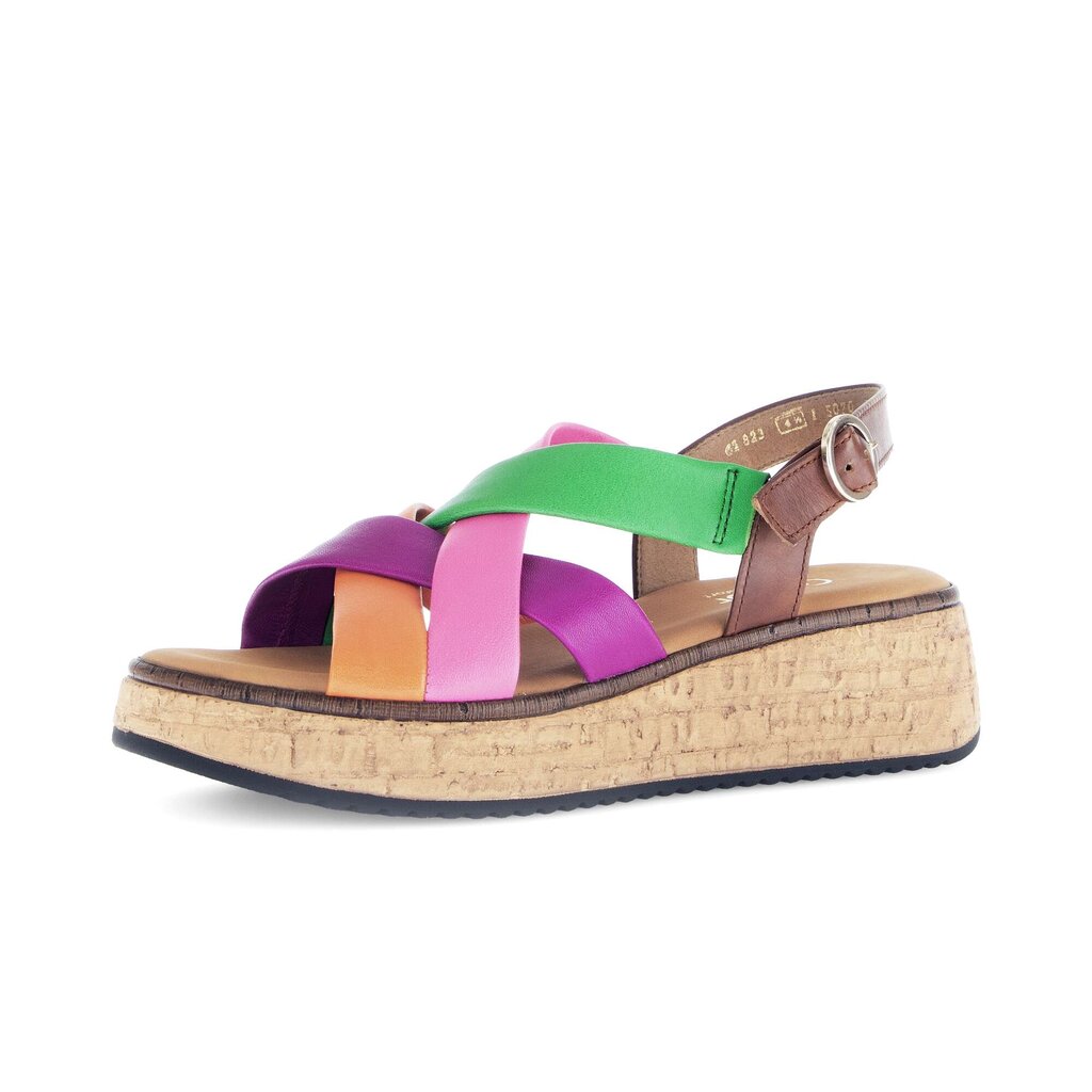 A festival of brightly coloured, super soft leather straps make this sandal one of a kind. With a 2 inch wedge and 1 inch platform, you can gain a little height and still walk comfortably all day.