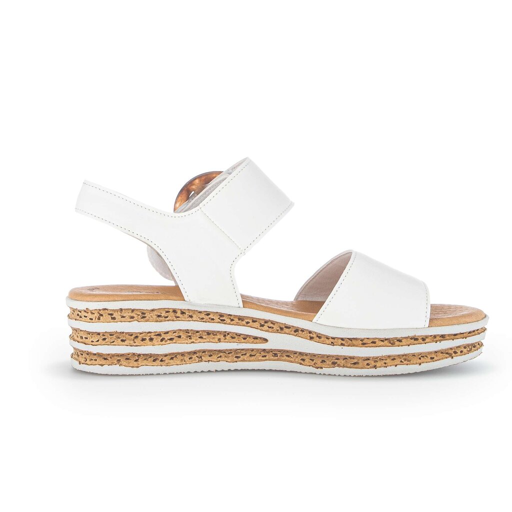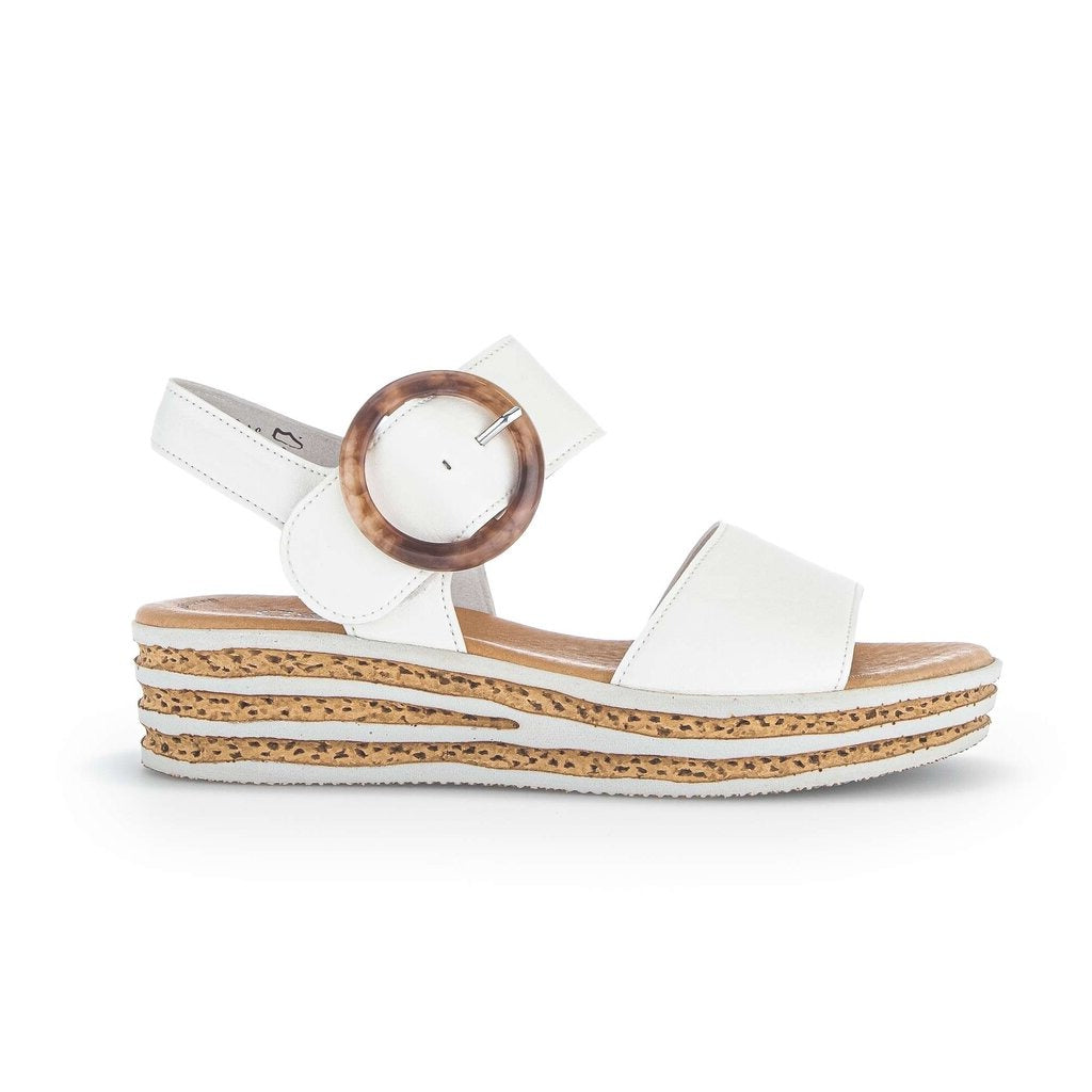 Gabor André medium wedge off white latte leather sandals with soft leather top and adjustable touch close strap with faux shell buckle detail. André has a generous 2 inch heel height which is compensated with 1 inch platform making this sandal dressy enough for special outfits yet comfortable for all day wear.