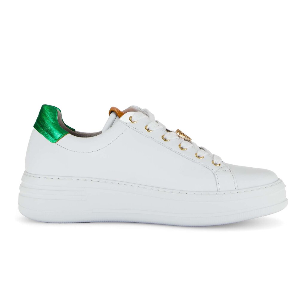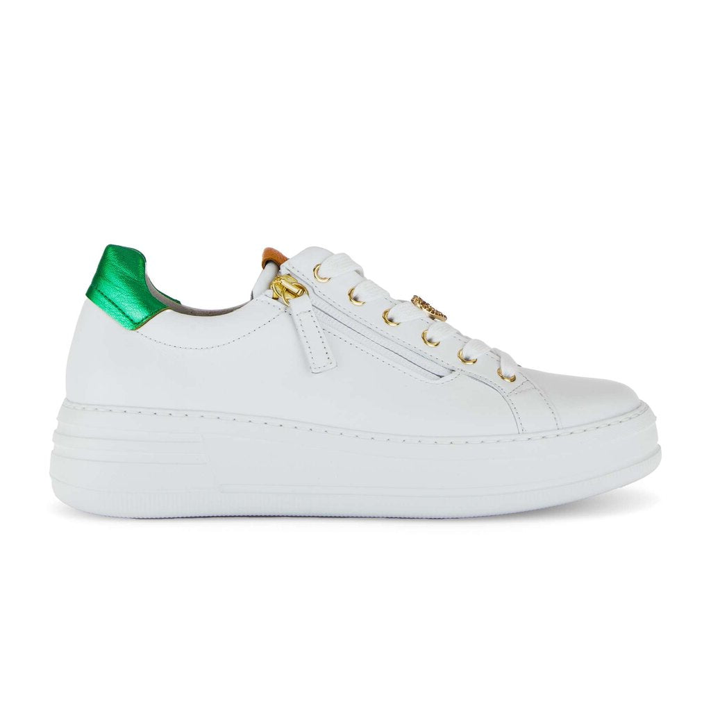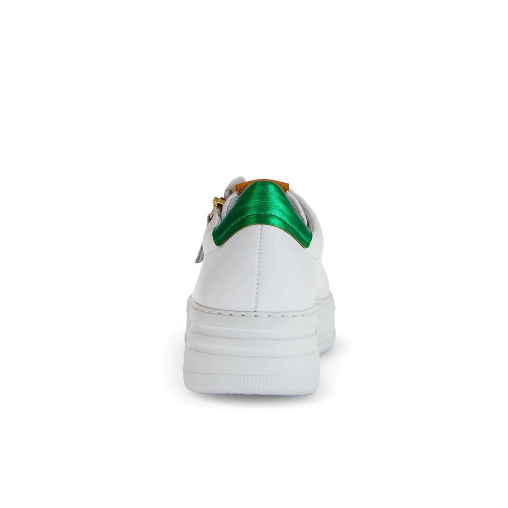 Gabor Kara white leather sneakers with metallic foil green and orange charm trims. Add some zing into your wardrobe with these fresh white sneakers for the new season.