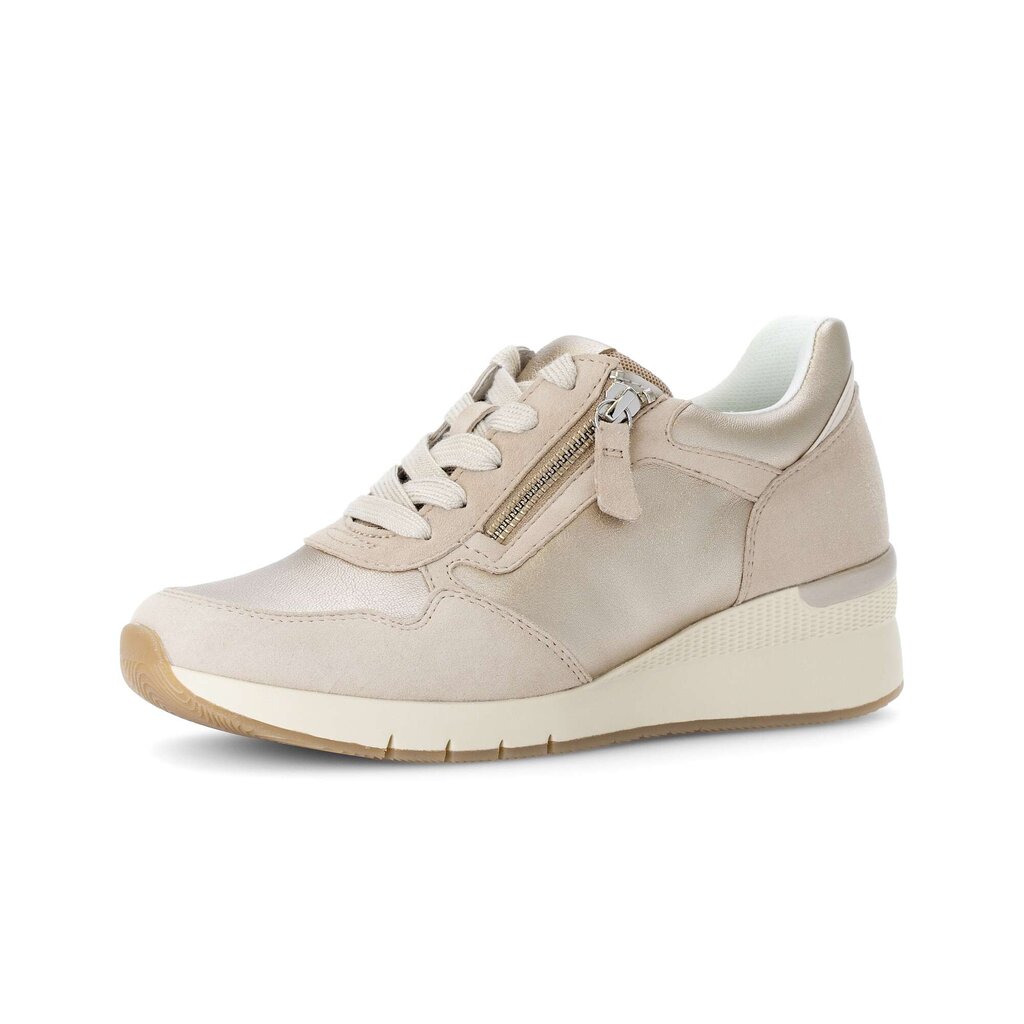 wedge heel sneakers in neutral multi tonal metallic and latte suede and leathers. The 1 3/4 inch wedge gives a comfortable height boost and the soft trainer lining is great for all day comfortable wear.