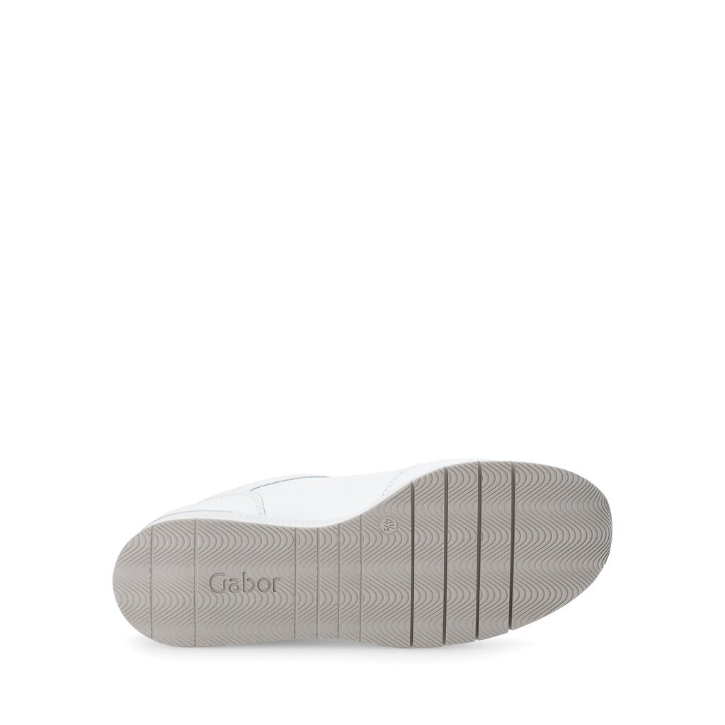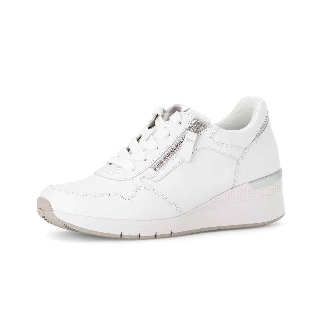 Wedge heel sneakers in pure white leather with silver accents. The 1 3/4 inch wedge gives a comfortable height boost and the soft trainer lining is great for all day comfortable wear.