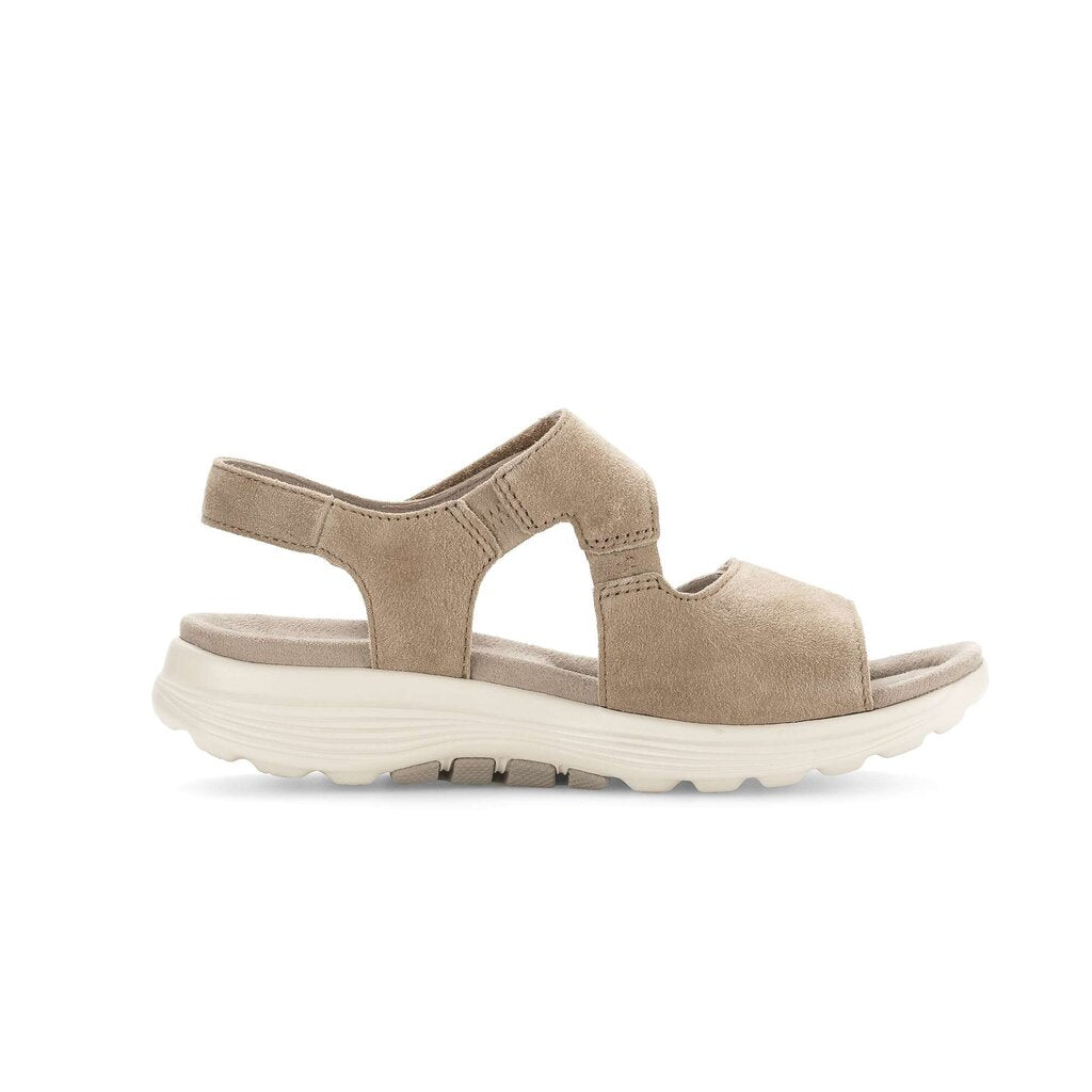 Gabor Trickle soft sand suede natural gait sandal. Lightweight rolling soft Trickle has a cushioned footbed with two broad hook and loop straps which are fully adjustable. Gabor rolling soft sandals incorporate a rocking mechanism into the sole reducing impact on your heel and supporting your arch. Excellent footwear for people who have struggled with plantar fasciitis.