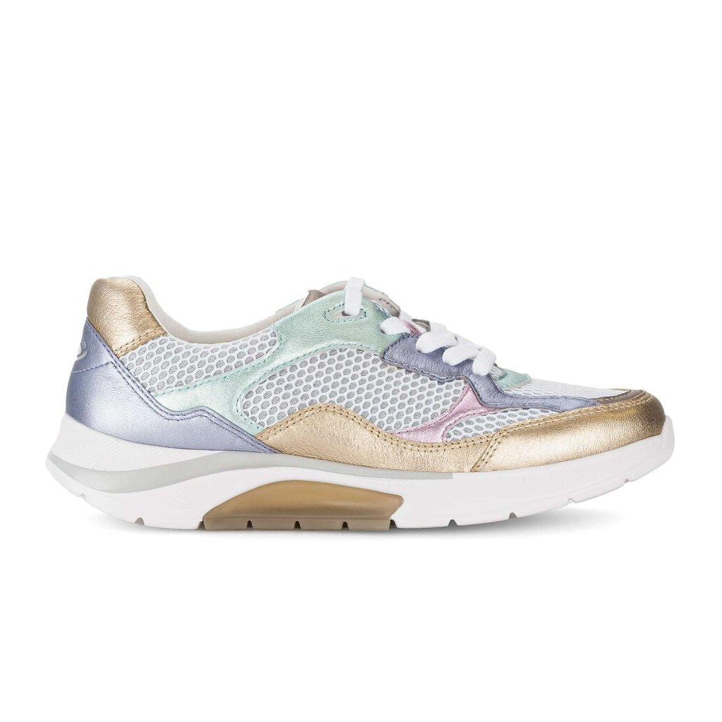 New Gabor Garland, lightweight rolling soft trainers with mesh panels and beautiful pastel metallic leather accents. Gabor rolling soft sneakers incorporate a rocking mechanism into the sole reducing impact on your heel and supporting you arch. Excellent footwear for people who have struggled with plantar fasciitis.
