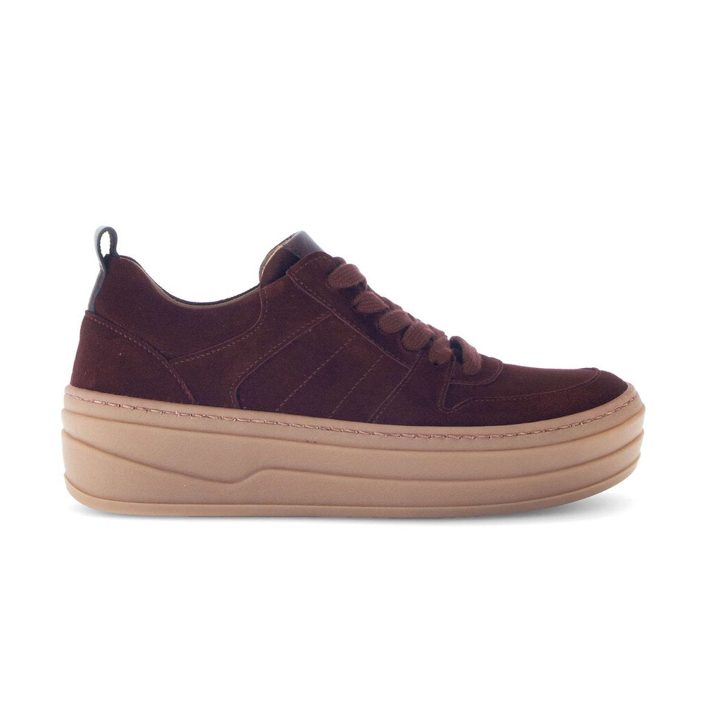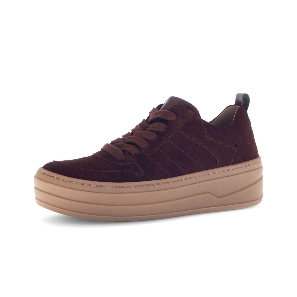 Gabor Story mulberry suede leather sneakers with natural gum rubber sole. Extra thick cushioned insoles support your feet and the padded tongue ensures a secure fit which makes these sneakers perfect for a long day on your feet. Perfect for work wear or smart casual wear.