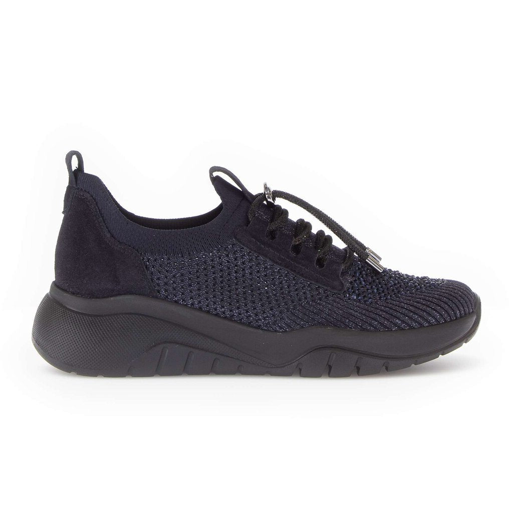 Super comfy Gabor slip on sneakers. These navy blue metallic fabric sneakers are jewlled with matching rhine stones for a more glamorous look. The no-tie lace front has a quick and easy toggle if adjustment is needed. Standing tall on a 2 inch wedge heel, this is a dressy take on a classic comfy look.