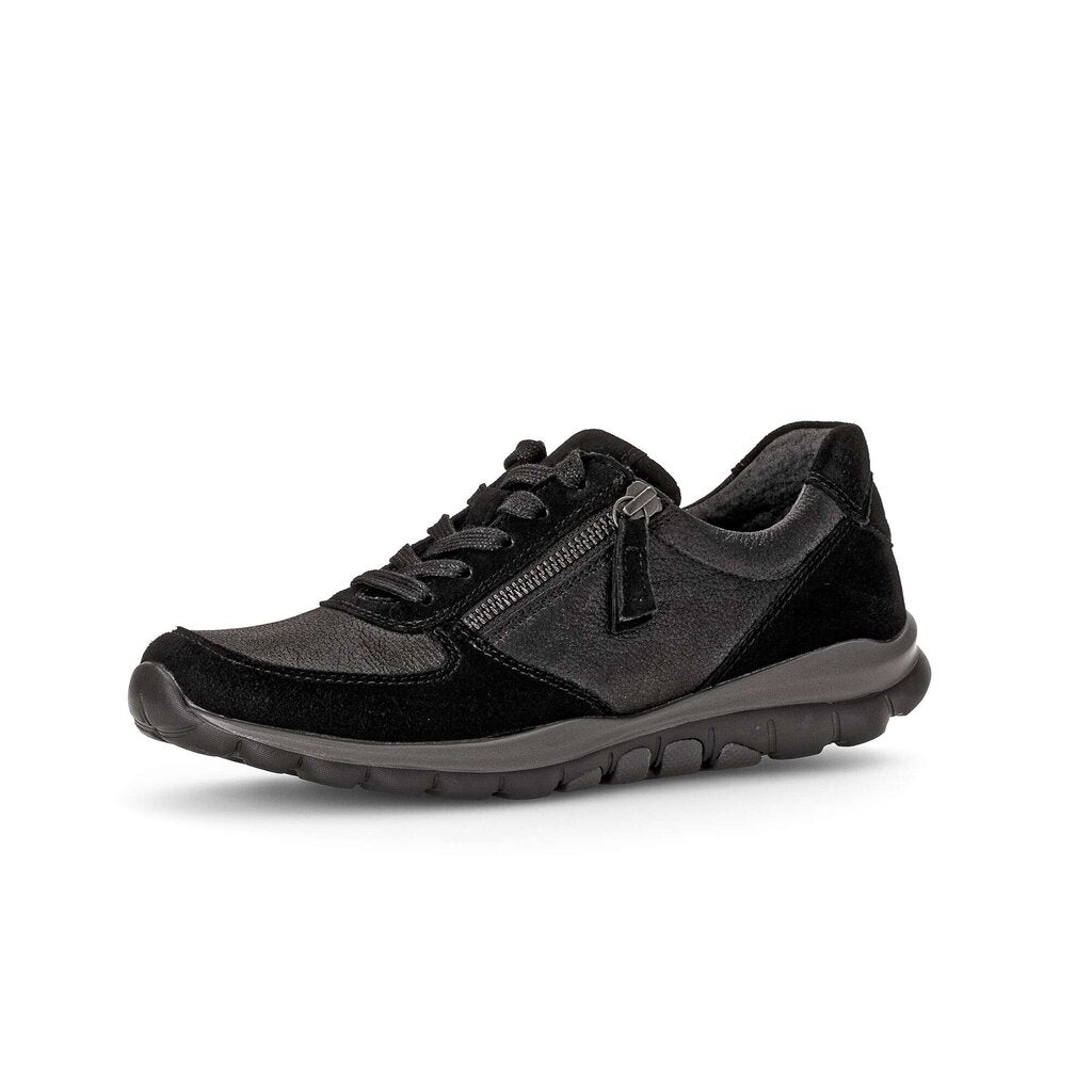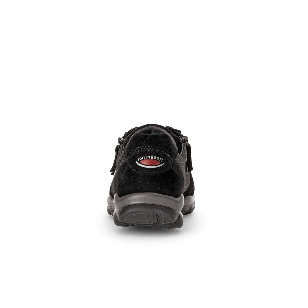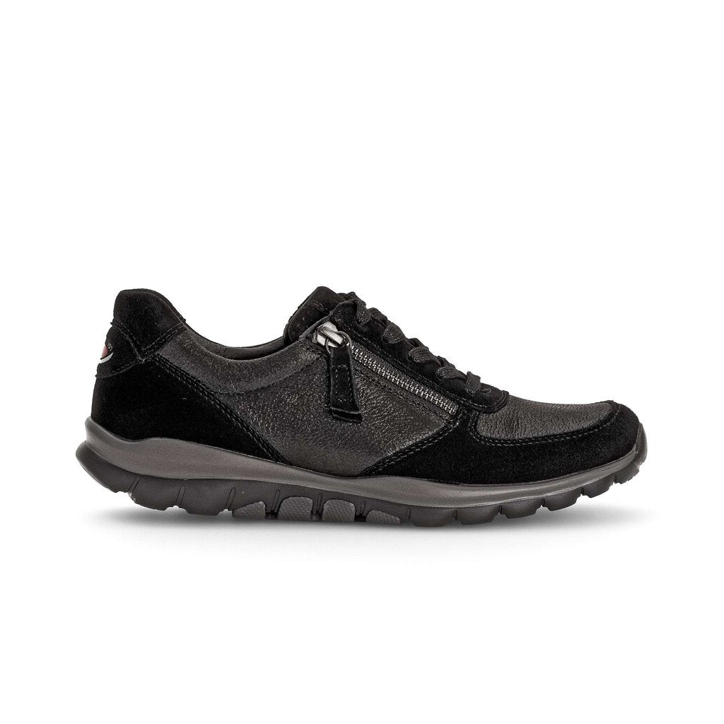 Gabor Fantastic black suede and anthrcite metalic leather sneakers. Gabor rolling soft sneakers incorporate a rocking mechanism into the sole reducing impact on your heel and supporting you arch. Excellent footwear for people who have struggled with plantar fasciitis.