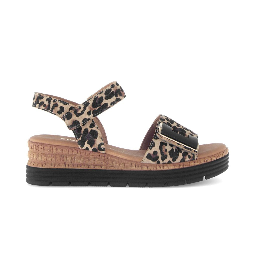 Shout is a funky leopard print sandal with a two tone sculpted cork effect and co ordinated colour wedge heel. These comfy wedge sandals look great with a summer dress and are still comfy enough for all day wear and long walks. The adjustable straps are a hook and loop fastening, ideal for a slimmer ankle.