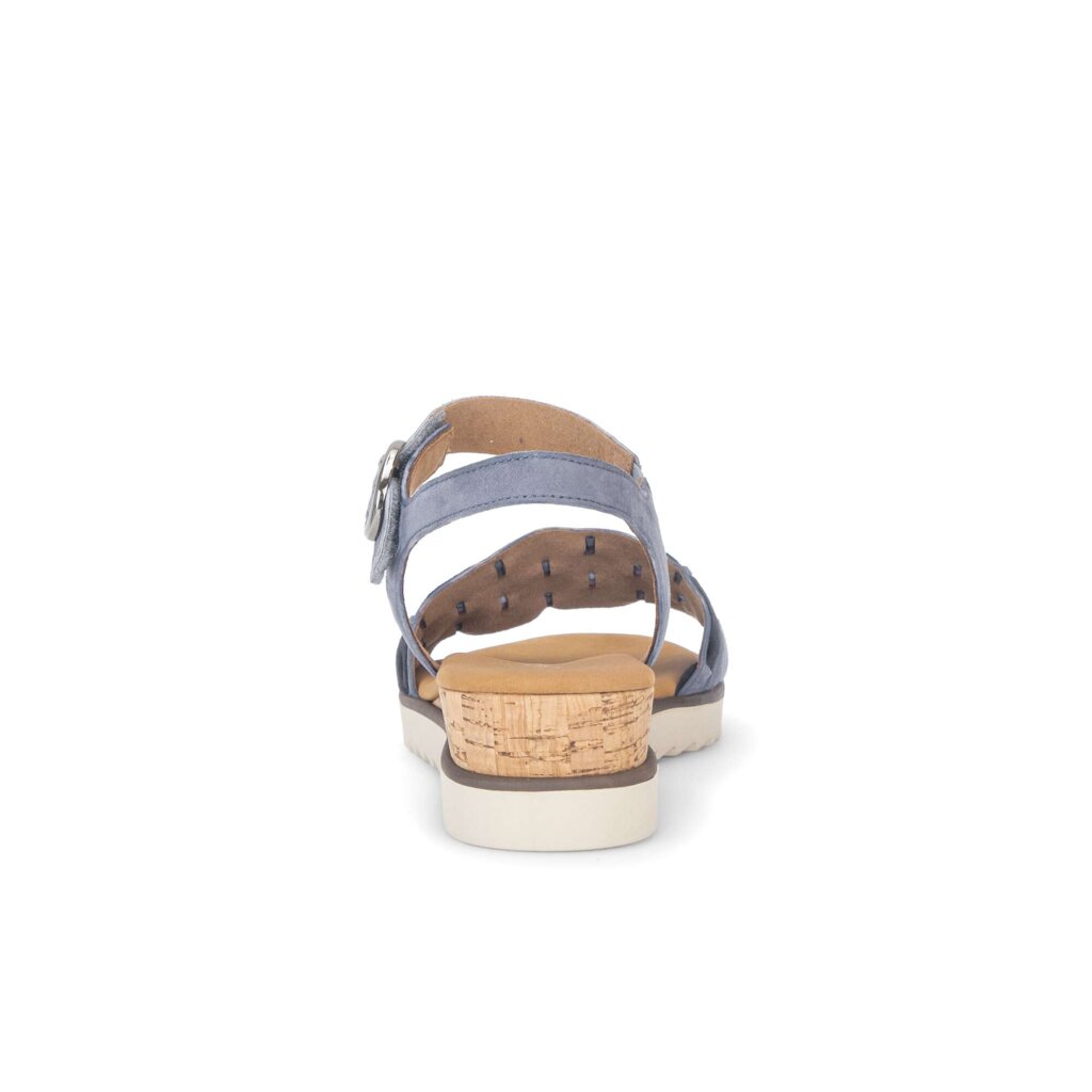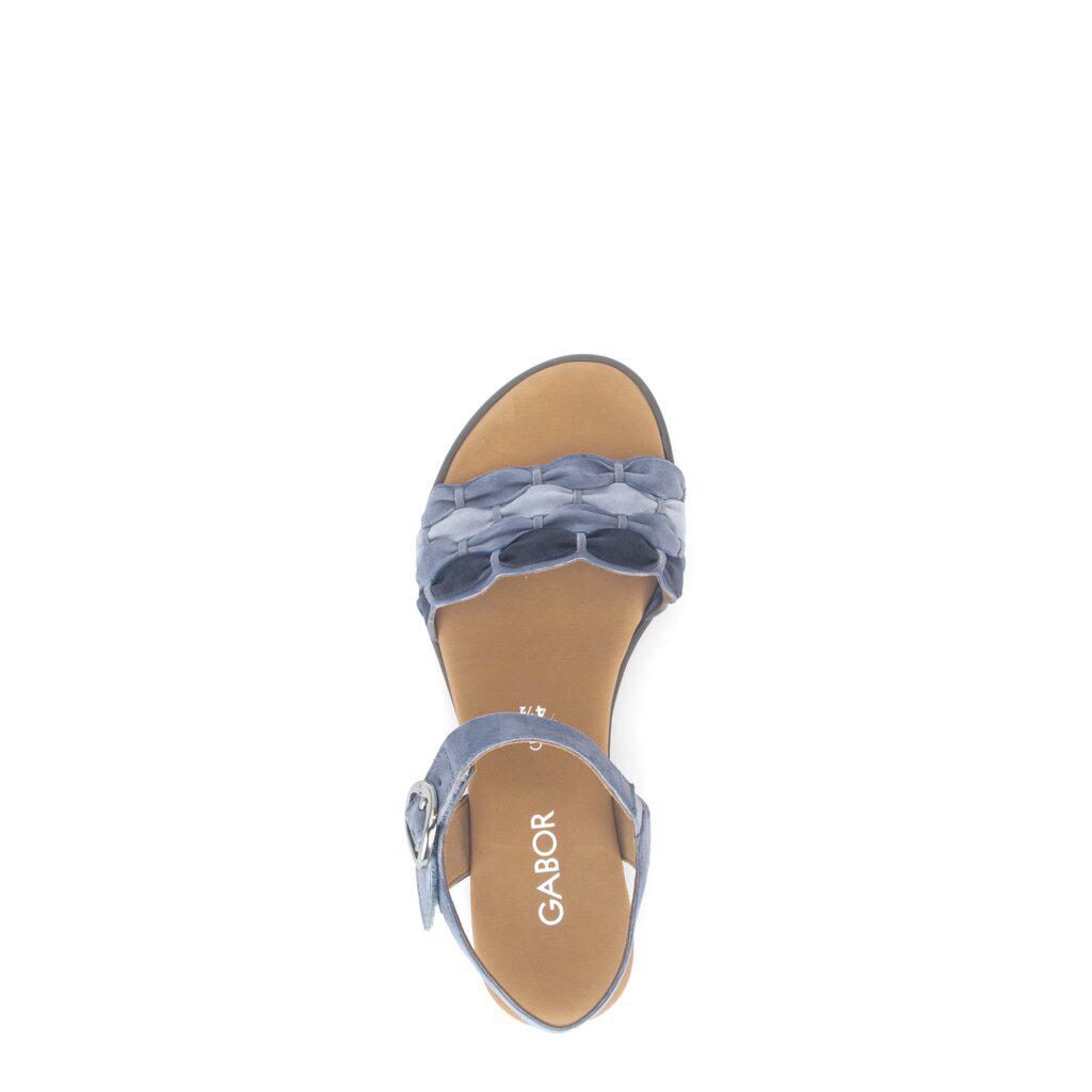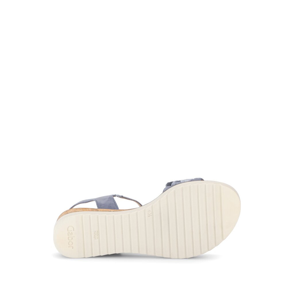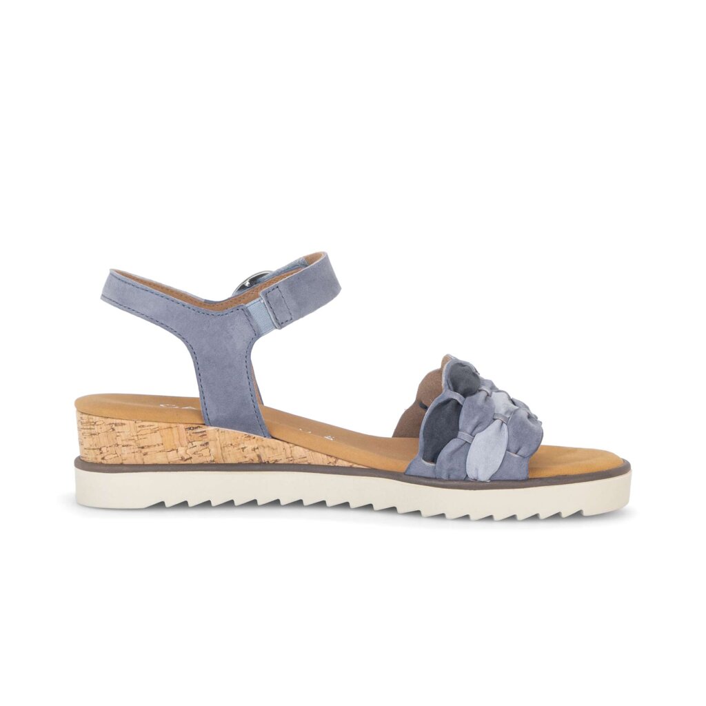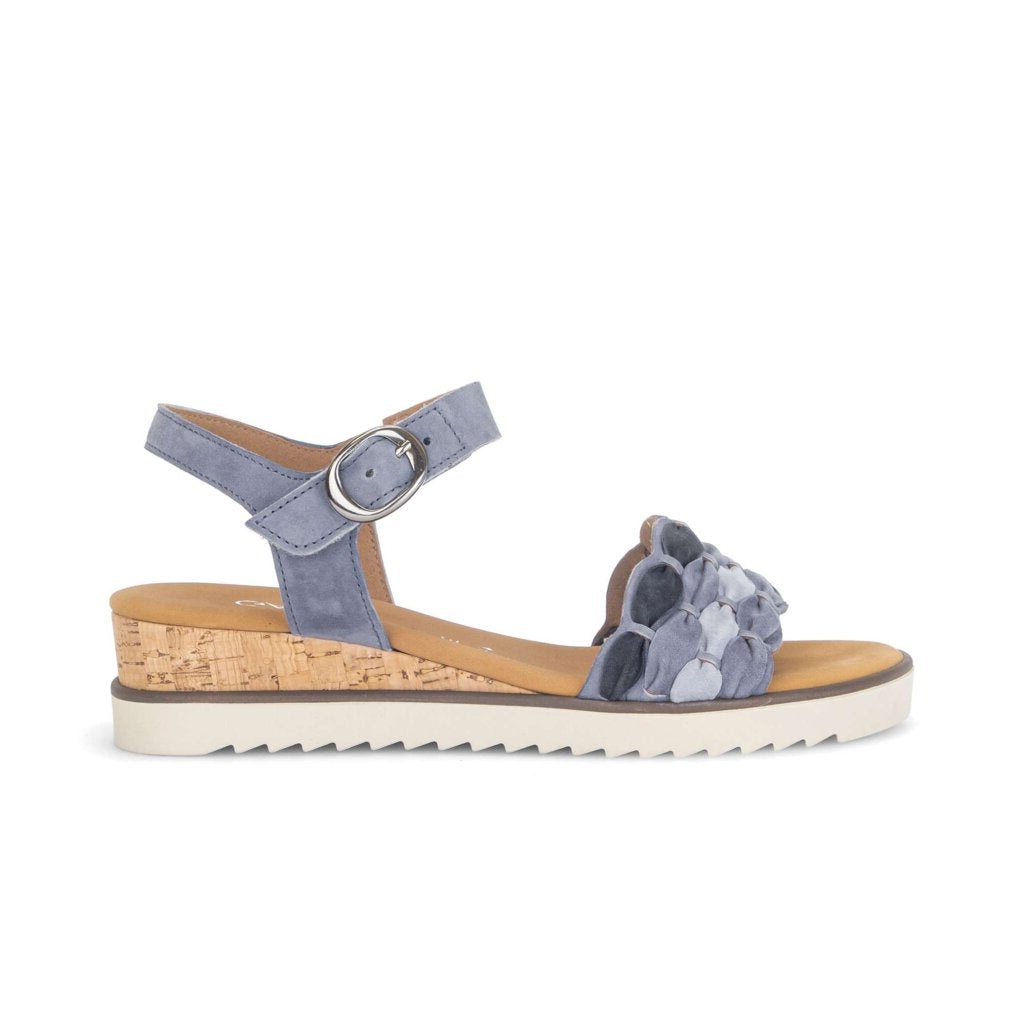 Gabor Revo soft denim blue suede wedge heel sandals with adjustable ankle straps. These comfy walking sandals give a little height boost and feature a soft metallic leather woven pattern into the front of the sandal.
