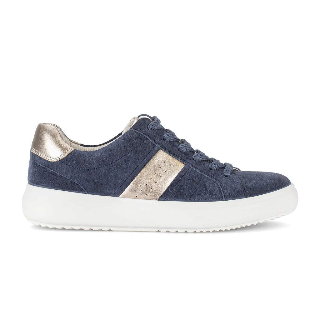 Gabor Jade super soft denim blue suede sneakers. Jade is one of the latest injection molded sneakers brining a whole new level of cushioning previous unseen in the Gabor range. The lightweight PU sole units are both springy and durable.