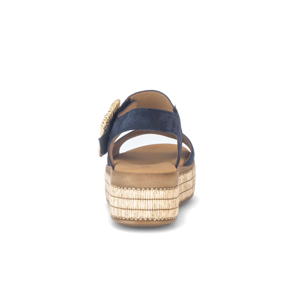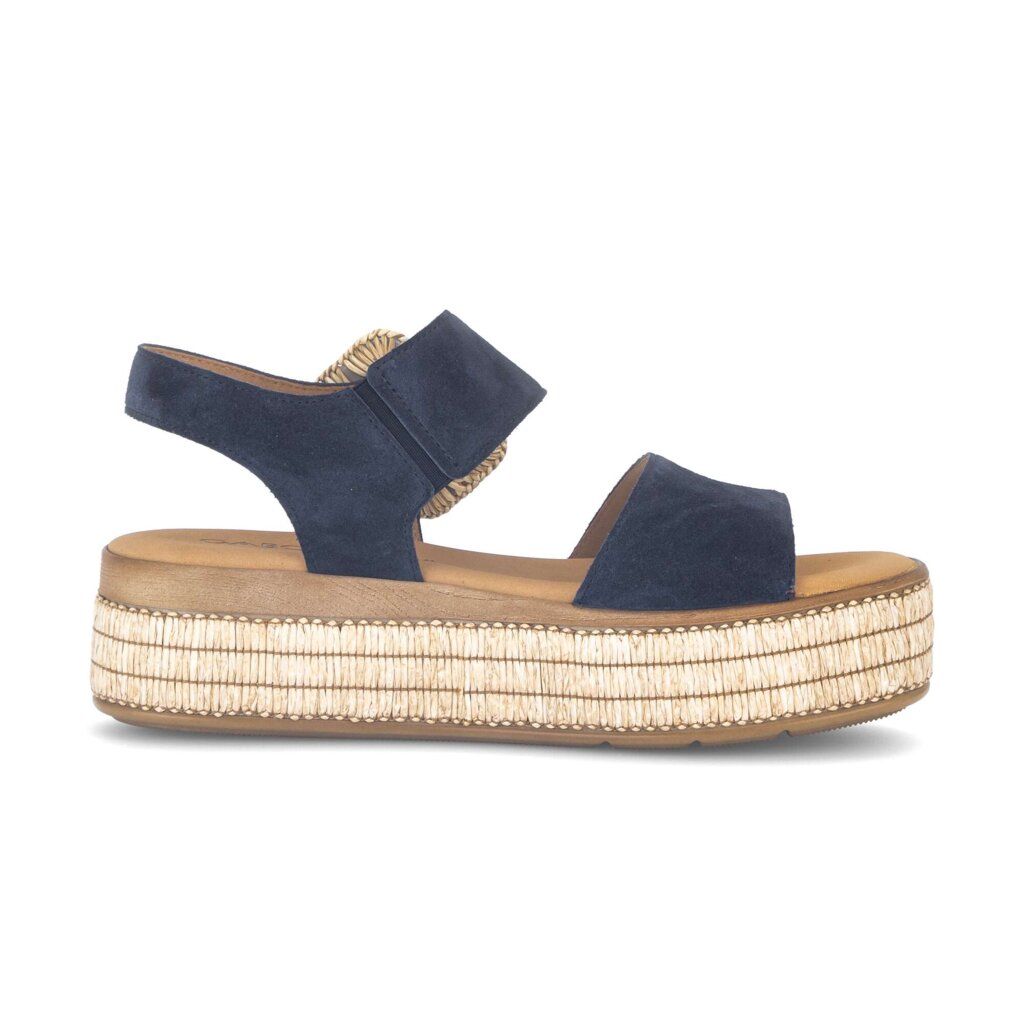 Gabor navy blue suede platform sandals with a basket weave buckle and palm parasol trim.
