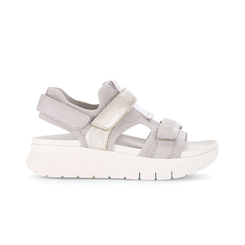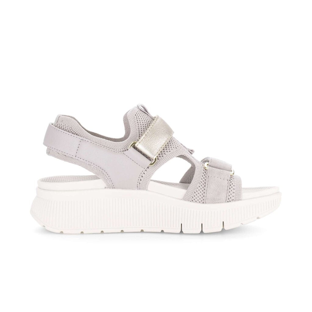 Gabor funky grey suede and fabric walking sandals. These chunky sandals are exceptionally lightweight and comfy. The knitted upper hugs your foot and has no seams to rub or cause blisters and the twin adjustable straps ensure a perfect fit. The sandal has no leather lining so you sit directly onto the eva sole material which makes cleaning this sandal much easier as you can scrub the synthetic material clean without damaging the sandals.