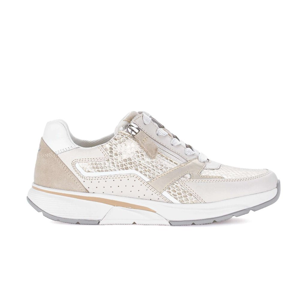 Gabor Adora in luxurious cream tones for a glamorous looking trainer. The cushioned heel cuff is a pale gold leather and fine nubuck textured leather which is echoed further along this sleek style. The pale gold and silver accents are attractive but discrete. Gabor rolling soft sneakers incorporate a rocking mechanism into the sole reducing impact on your heel and supporting your arch. Excellent footwear for people who have struggled with plantar fasciitis.