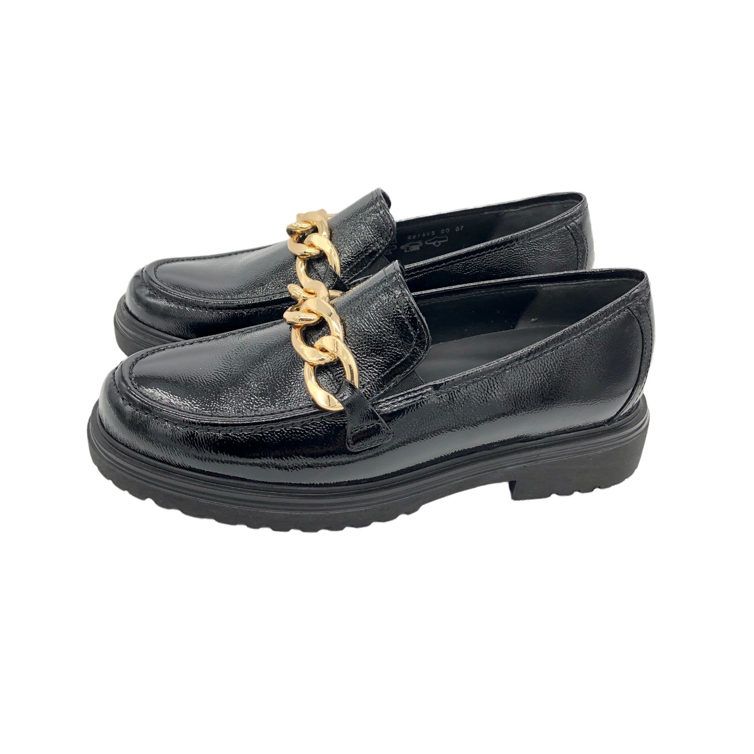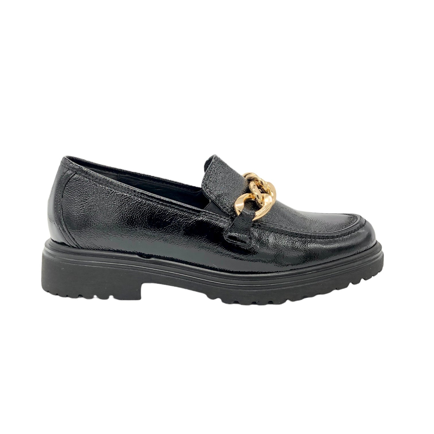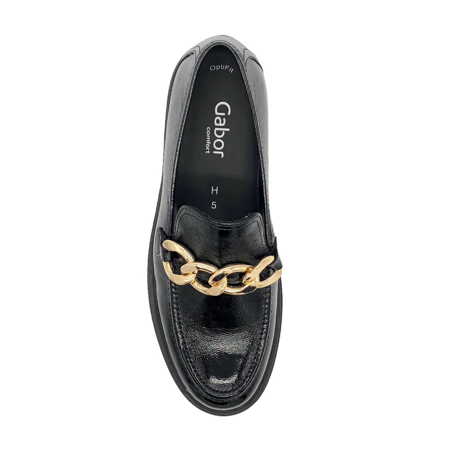 Gabor black patent leather loafers with gold chain detail. These smart loafers look sharp with a trouser suit and the block heel gives you an extra inch of height. This classic leather loafer is built for durability, the upper is made of high quality bovine leather which will require a period of breaking in.