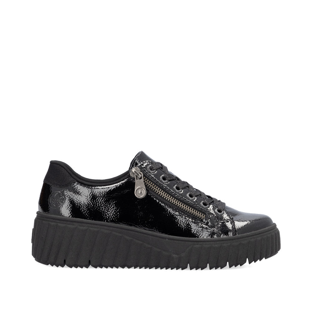 High shine black lace up shoes with zip fastening. These smart patent sneakers have an almond shaped toe for a smart casual look with an adjustable fitting.