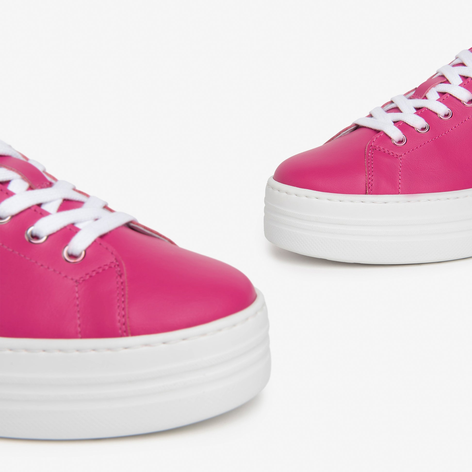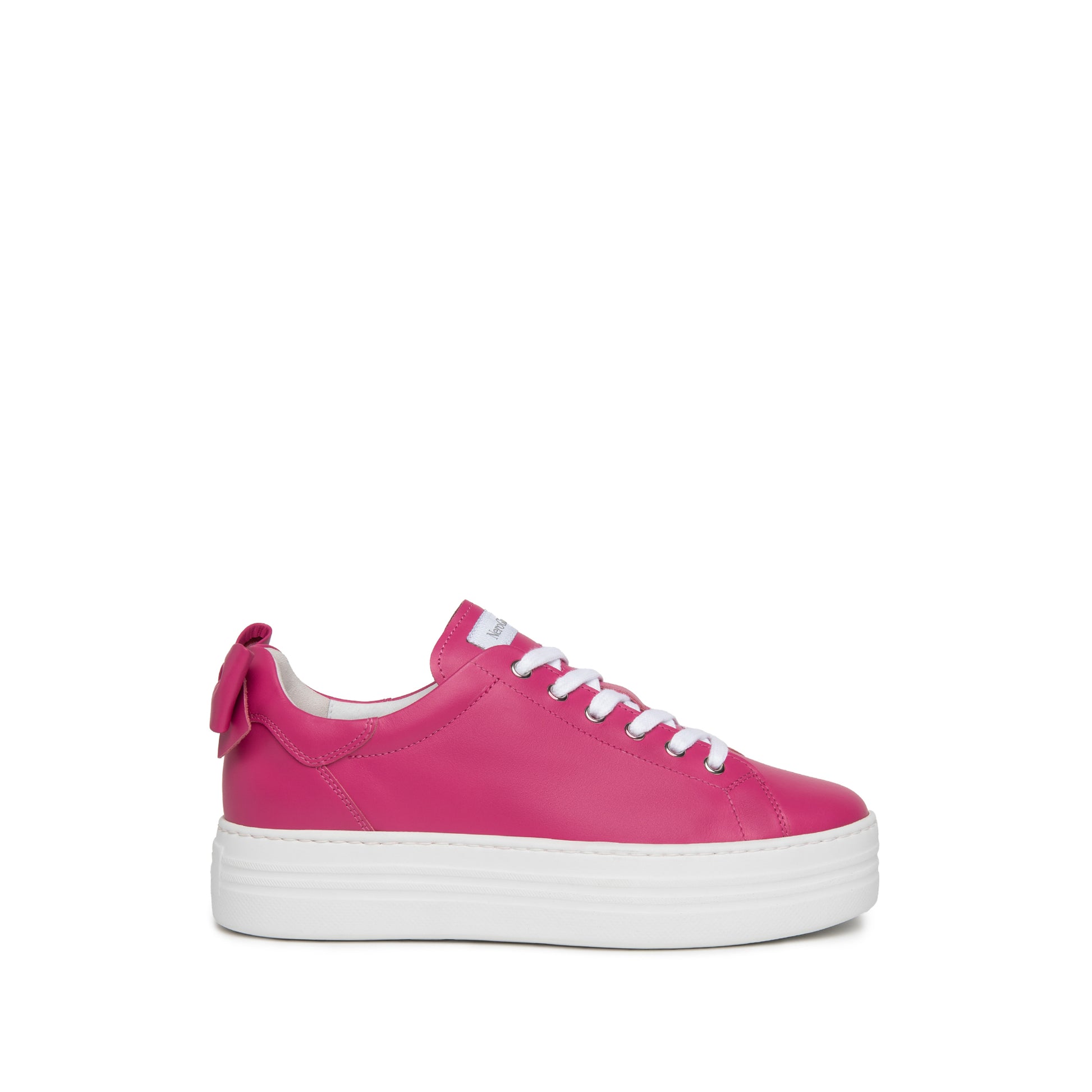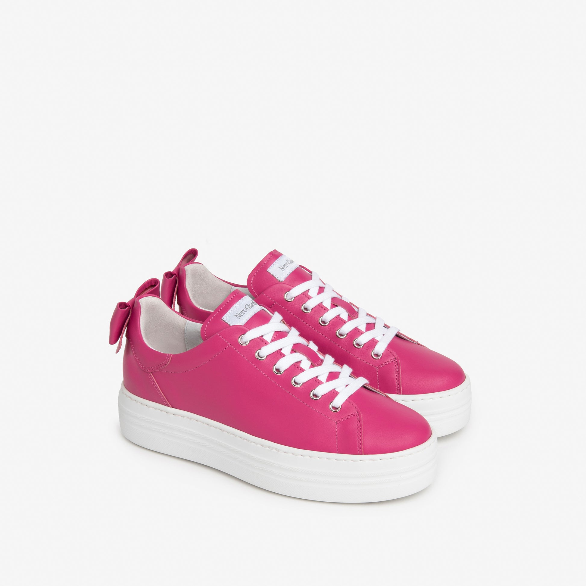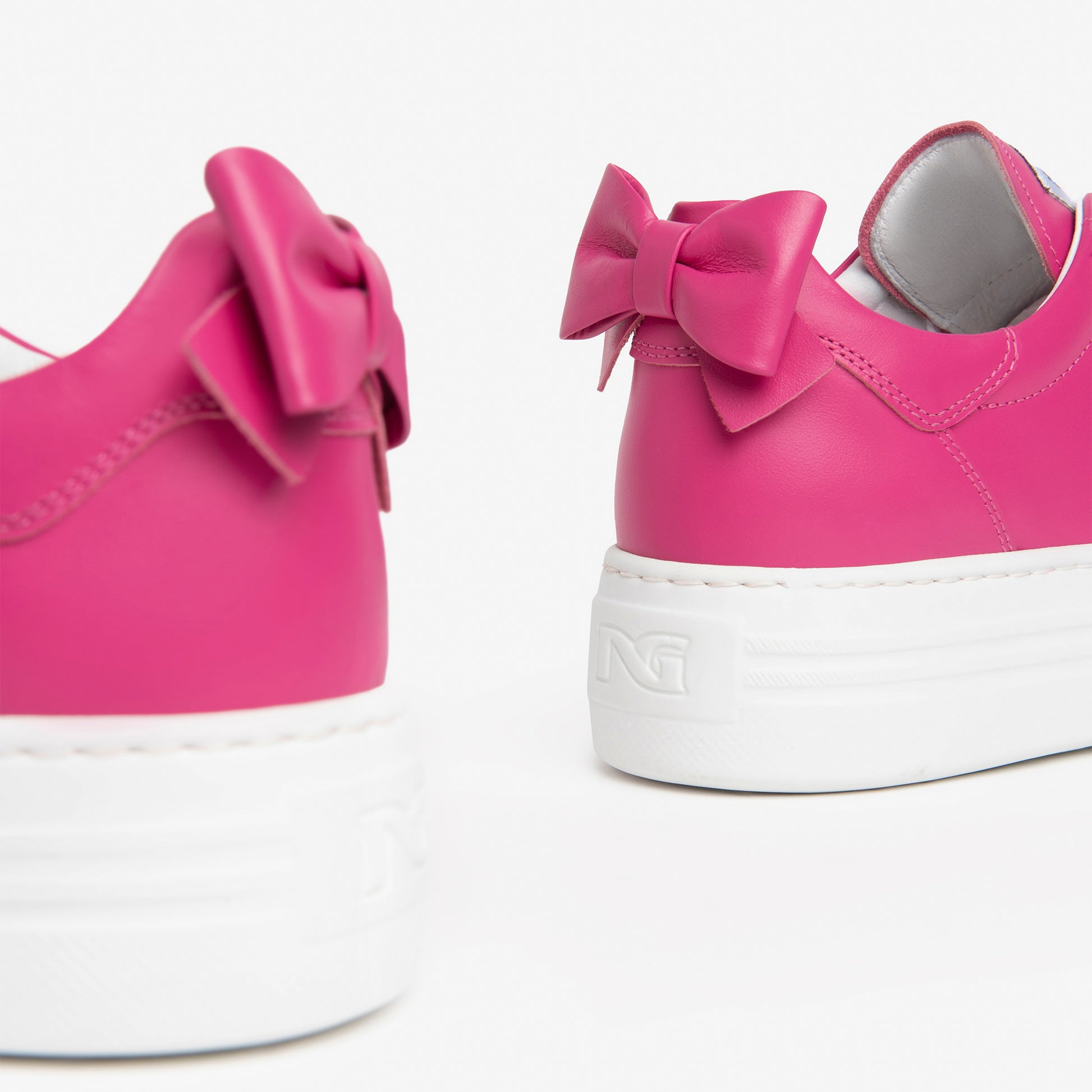 Vibrant fuchsia soft Italian leather sneakers with a cute leather bow at the heel. Make a statement with these on trend comfortable mini platform trainers and be the envy of your friends.