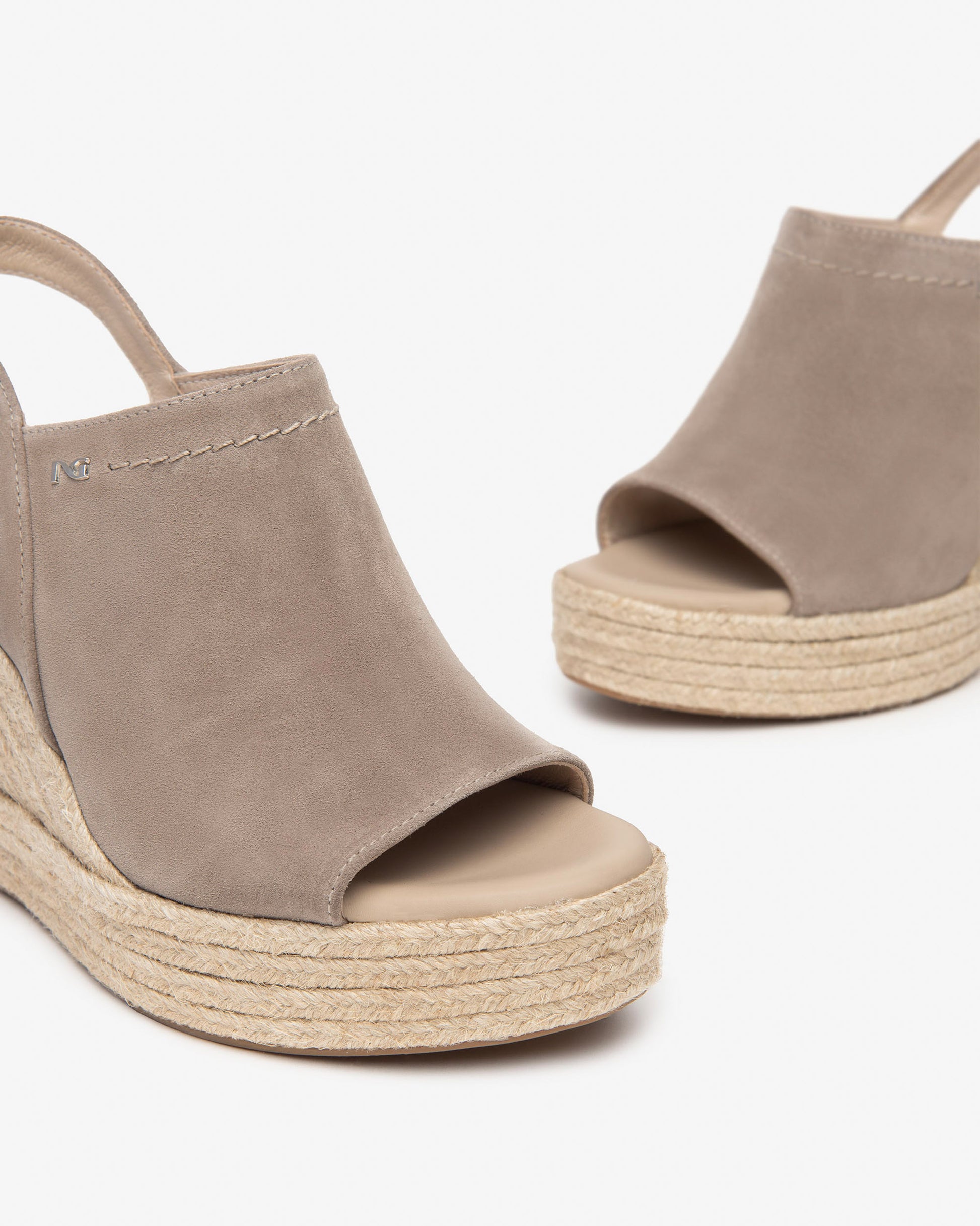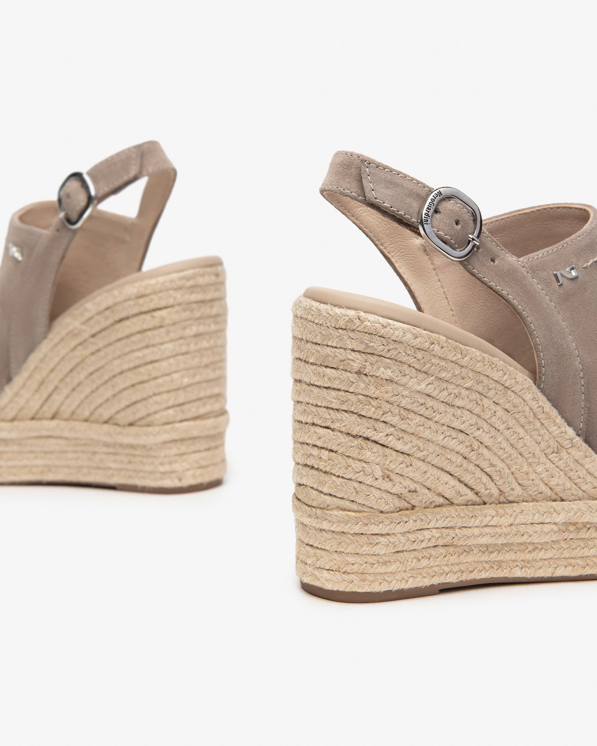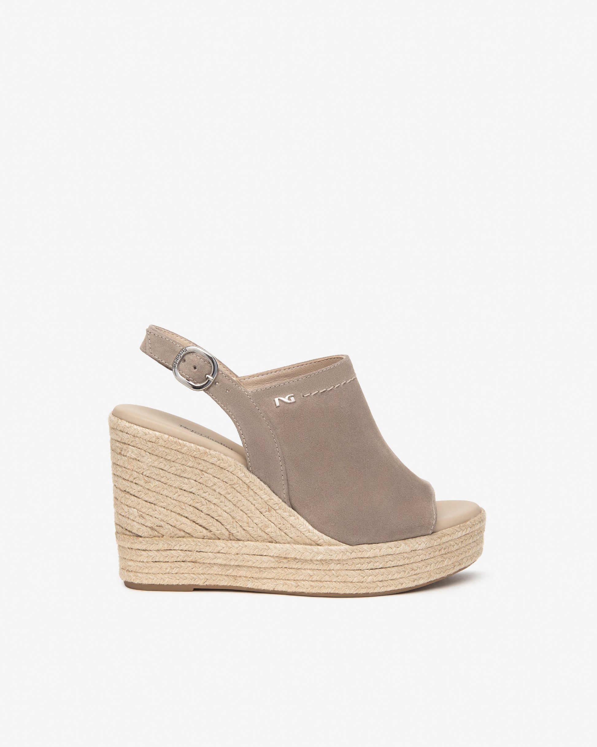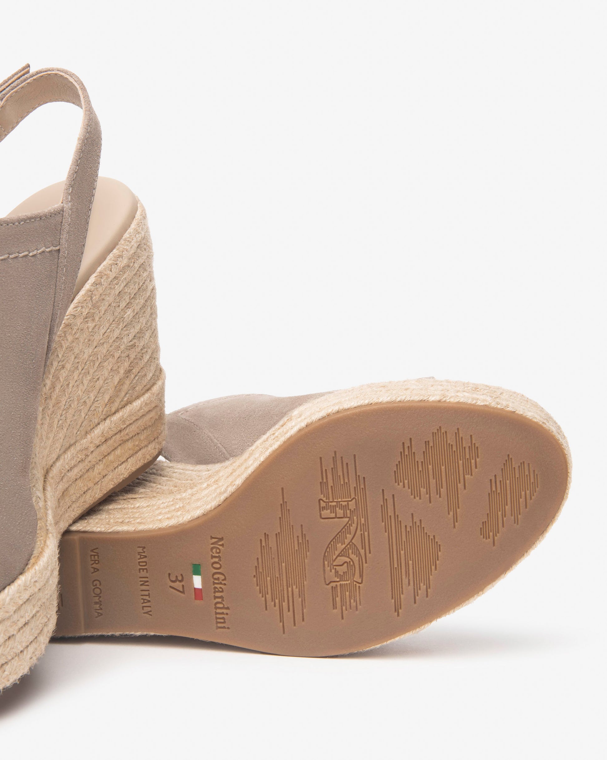 NeroGiardini high wedge taupe suede sandals with tall 120 mm wedge heel and a 35 mm platform. These soft suede wedge sandals have a traditional rope covered sole which pairs well with the natural taupe suede upper.