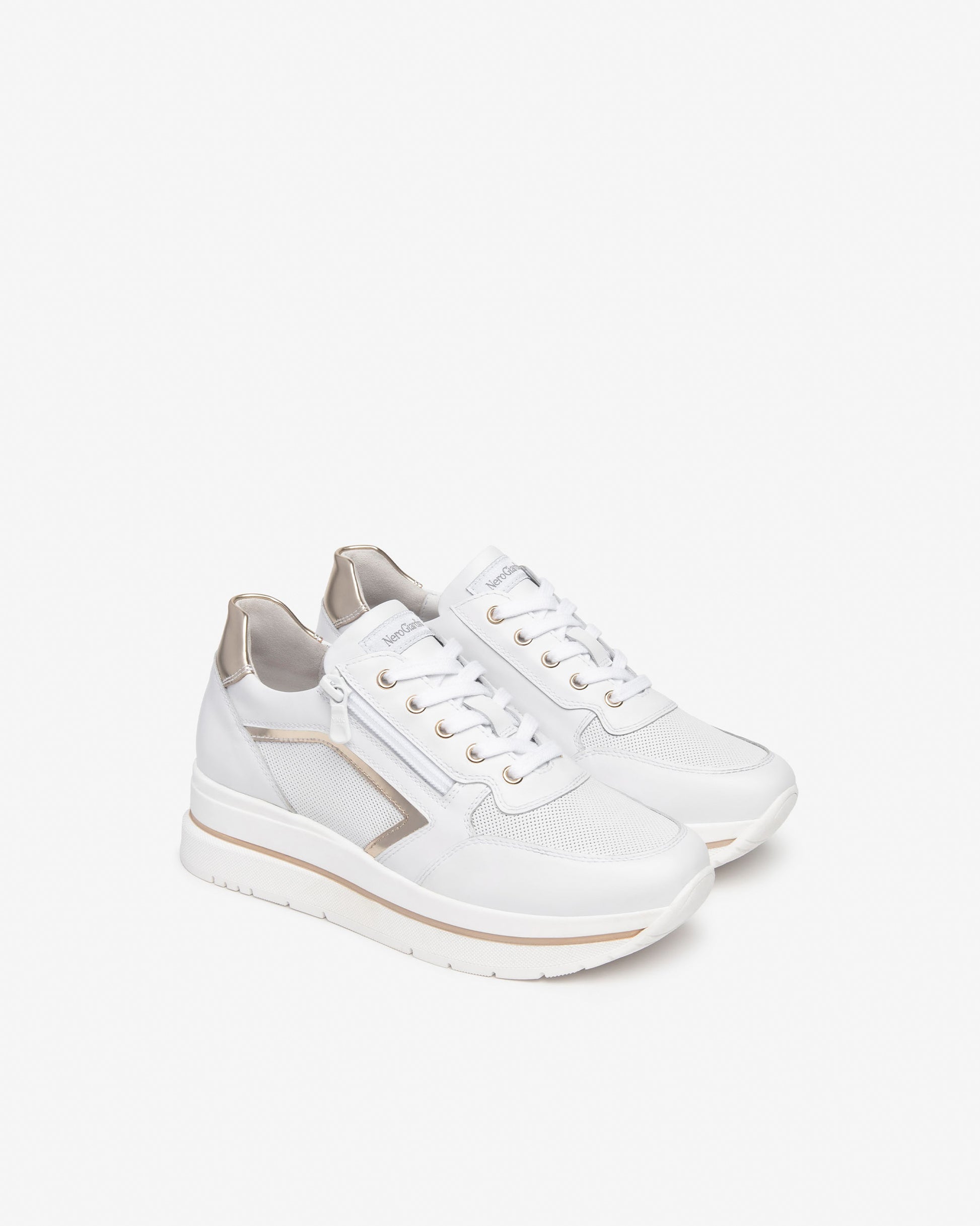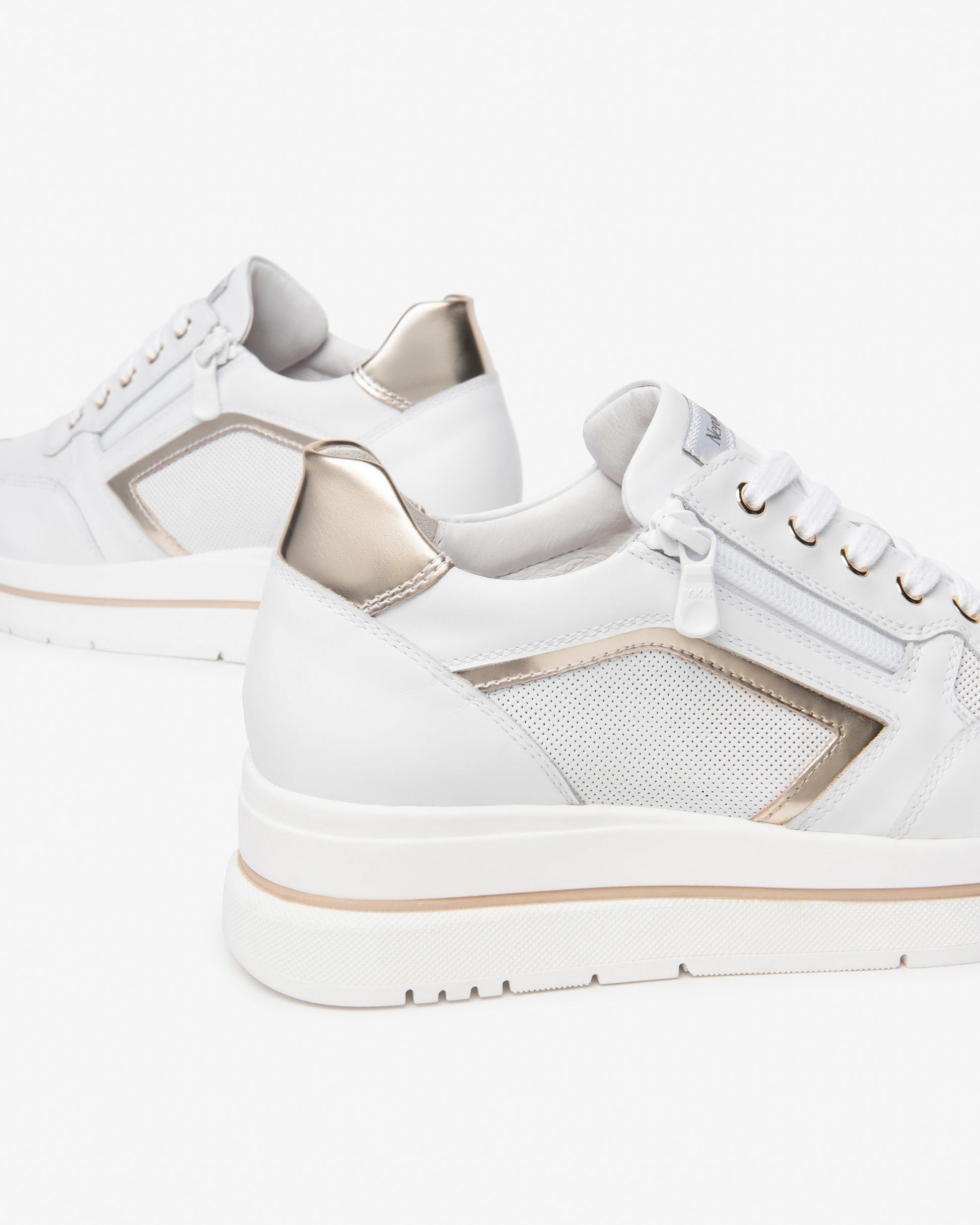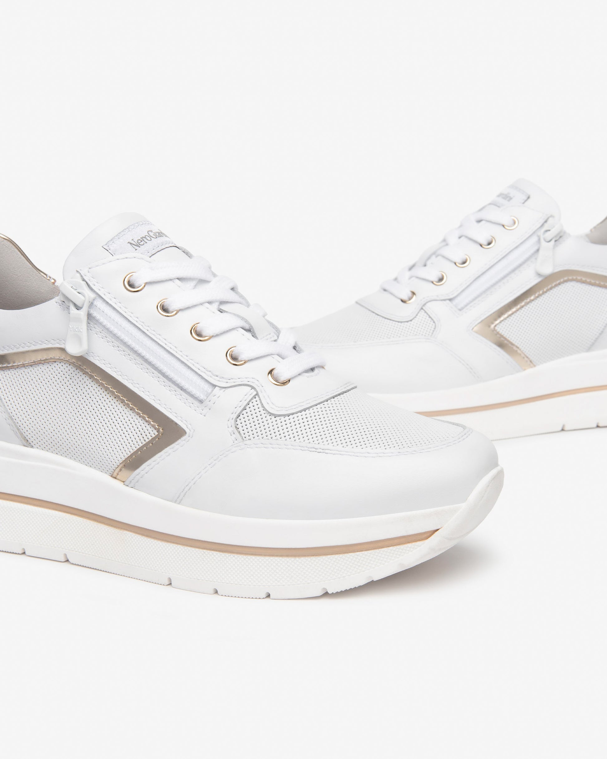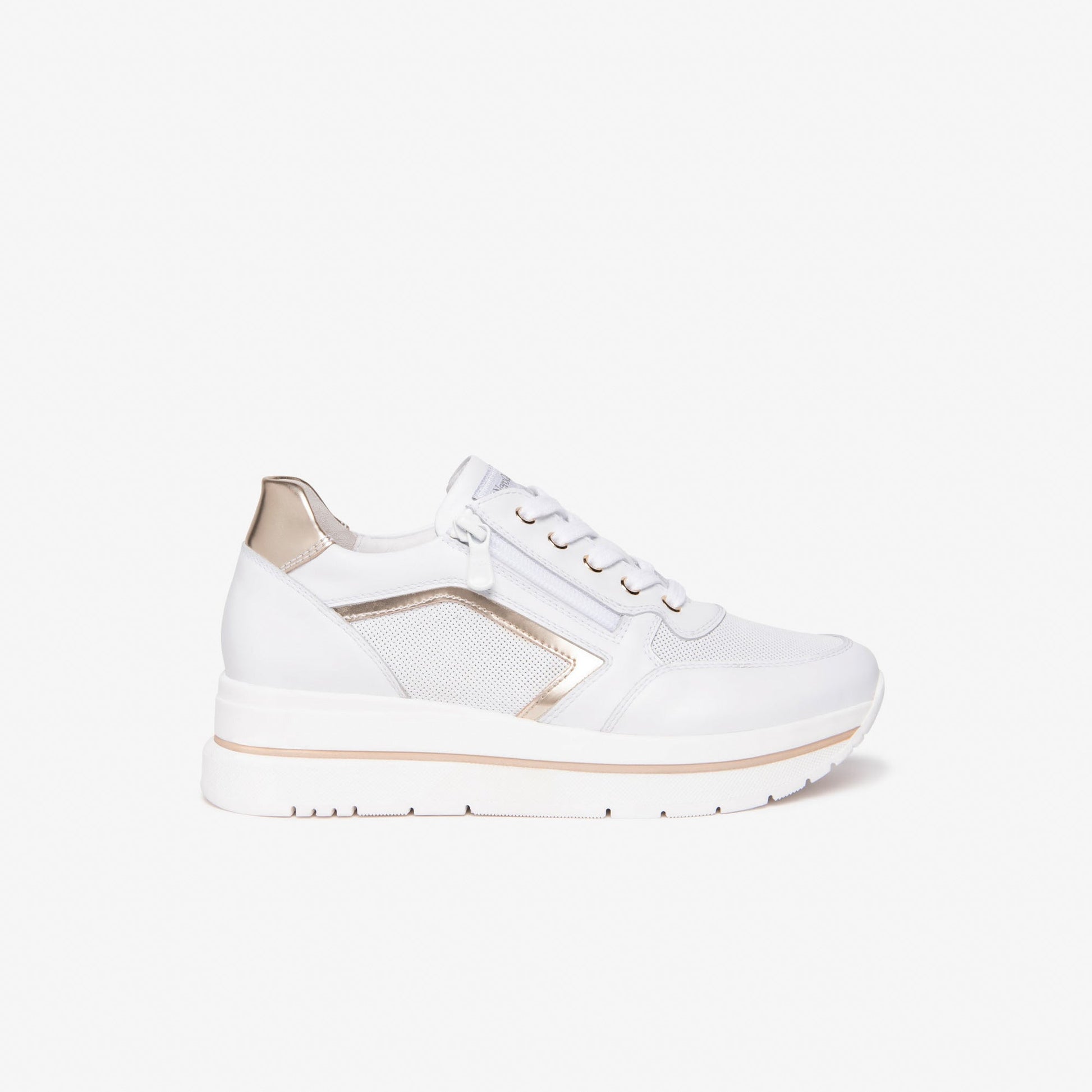 Stand tall in white leather platform sneakers with soft gold accents. A wardrobe essential. Made in Italy, NeroGiardini offer beautifully crafted footwear with exclusive designs and true leather craftsmanship.