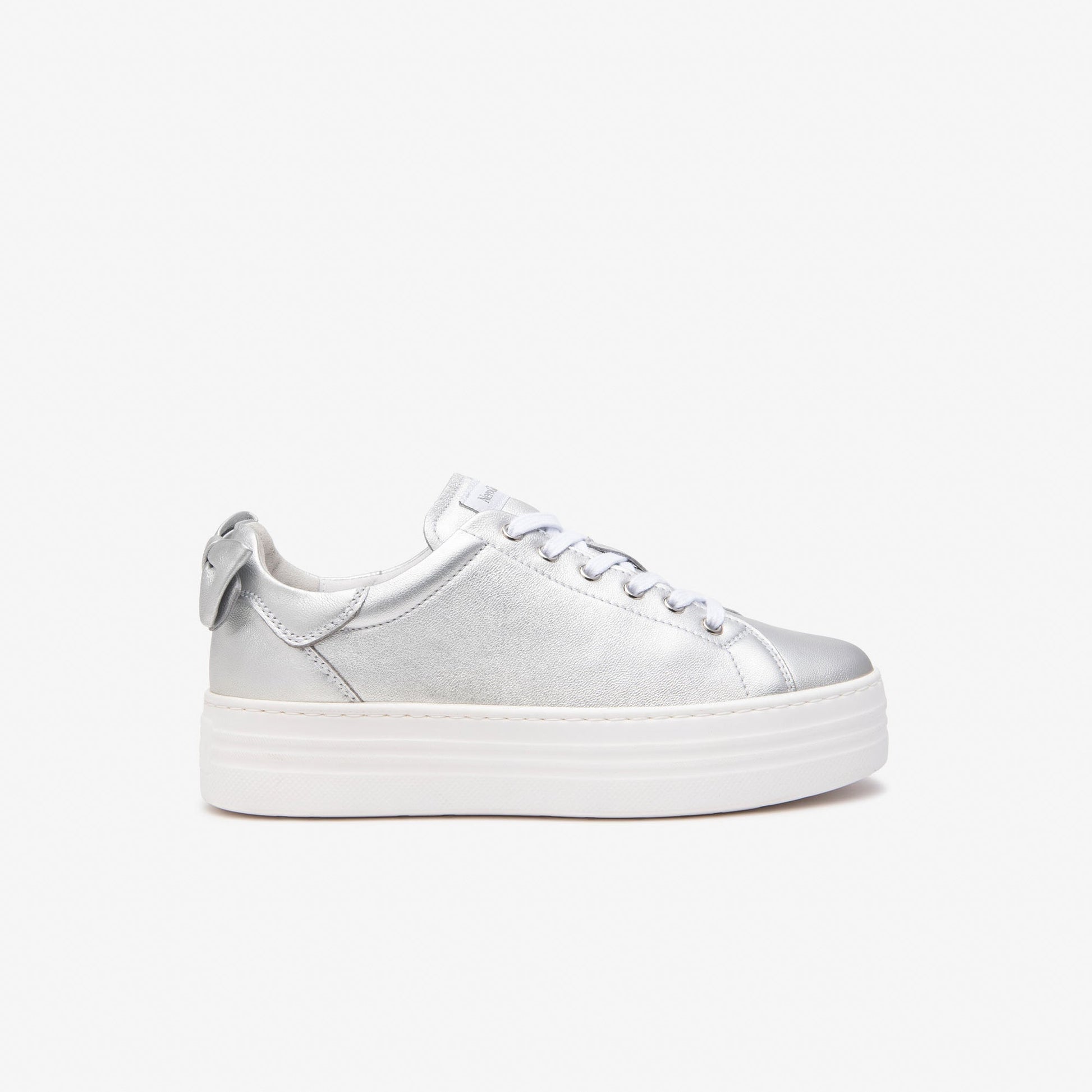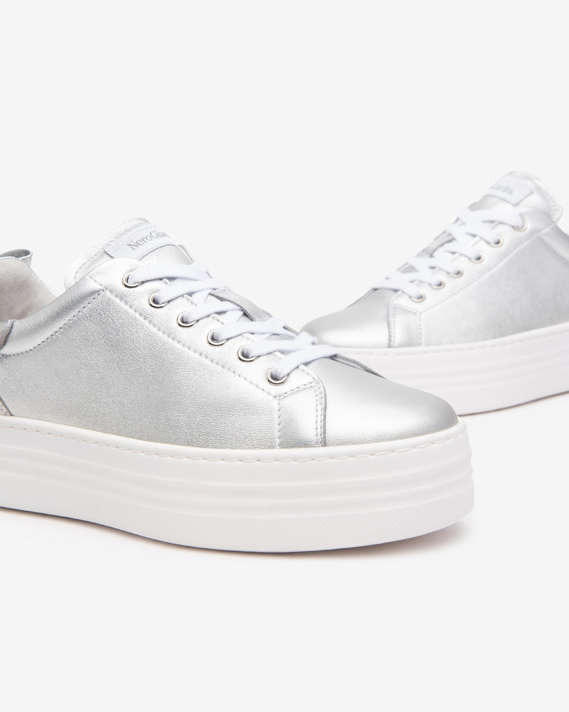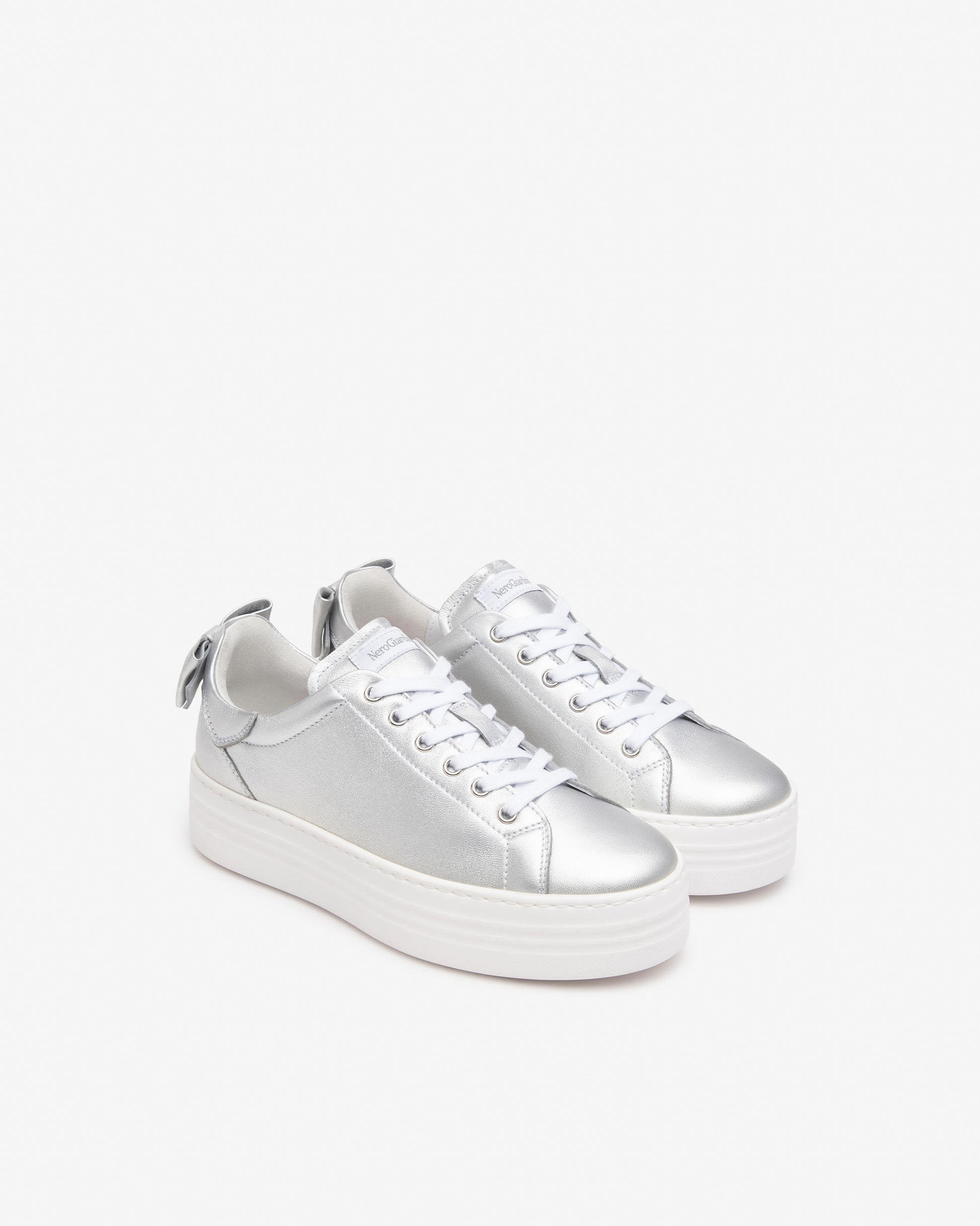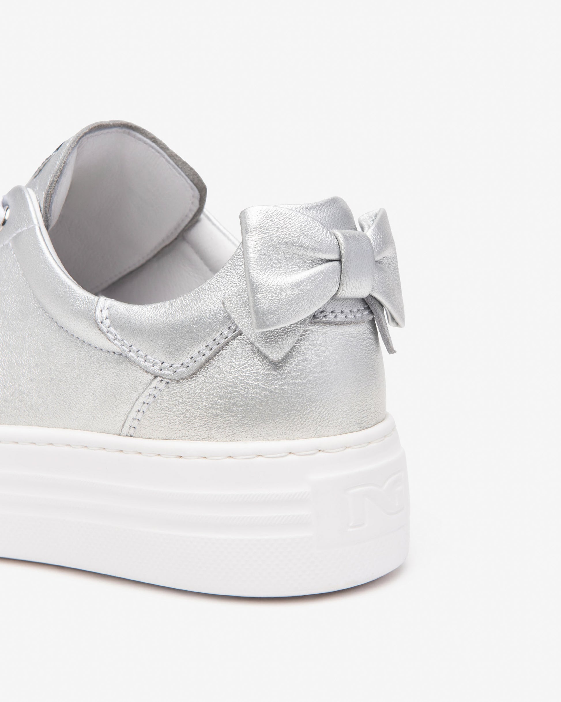 Cool silver metallic leather sneakers with cute bow detail at the heel. Pair with all the same outfits as your regular white sneakers for a on-trend wardrobe update. Made in Italy, NeroGiardini offer beautifully crafted footwear with exclusive designs and true leather craftsmanship.