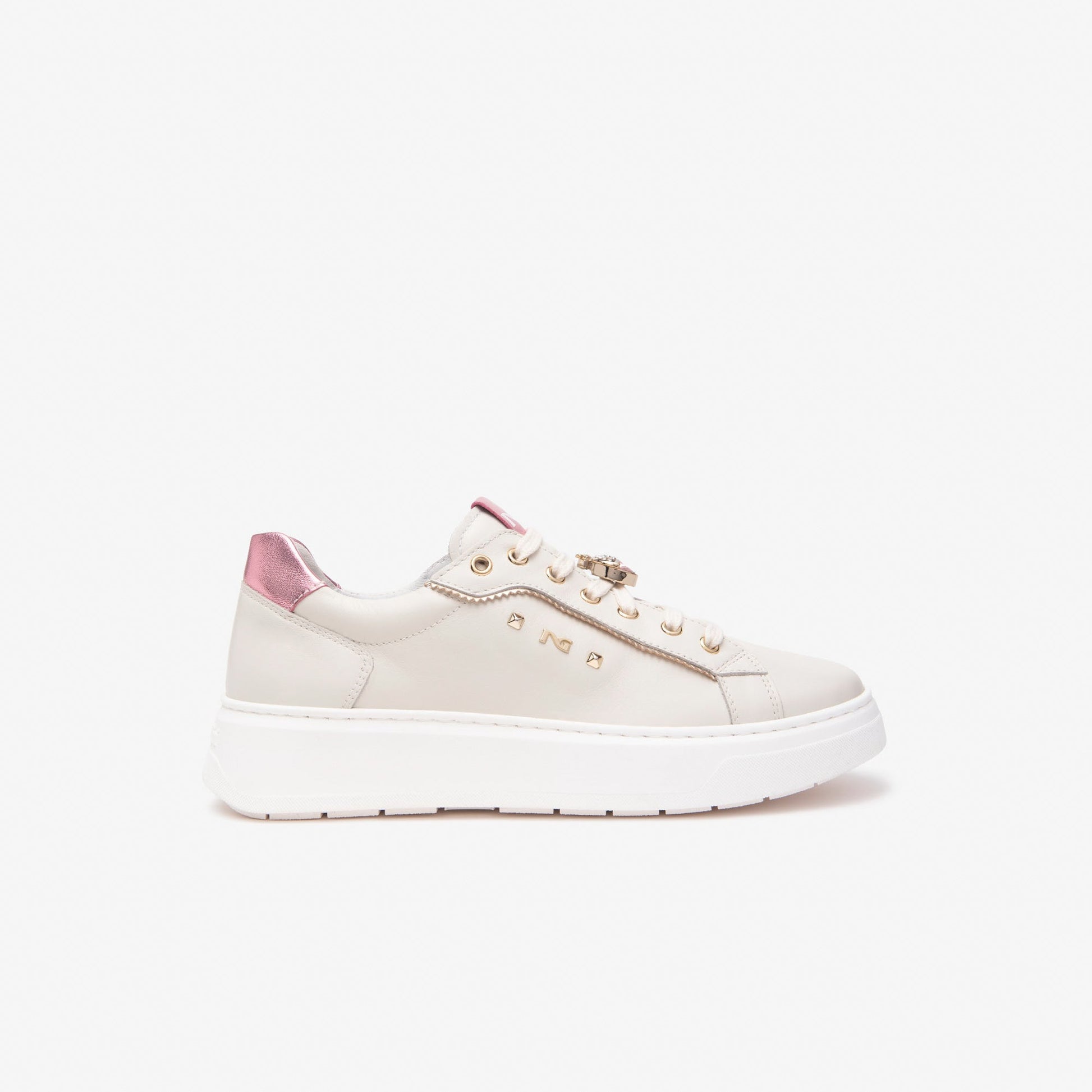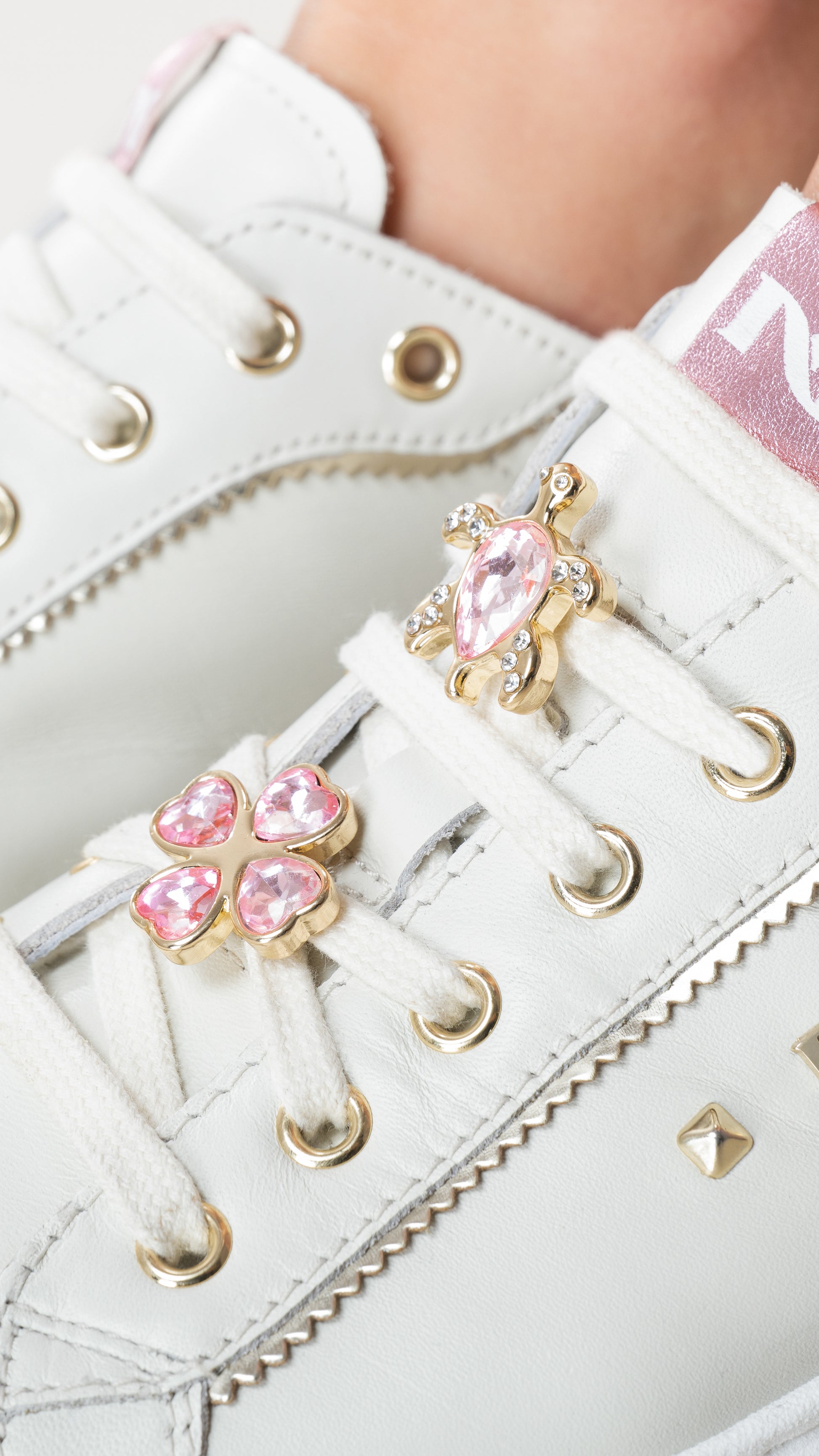 Prepared to be dazzled with these bejeweled ivory leather sneakers. Featuring a treasure collection of turtle, clover and jewel bug charms that echo the metallic pink accents and contrast against the smooth ivory leather upper of these show piece stunners. Made in Italy, NeroGiardini offer beautifully crafted footwear with exclusive designs and true leather craftsmanship.
