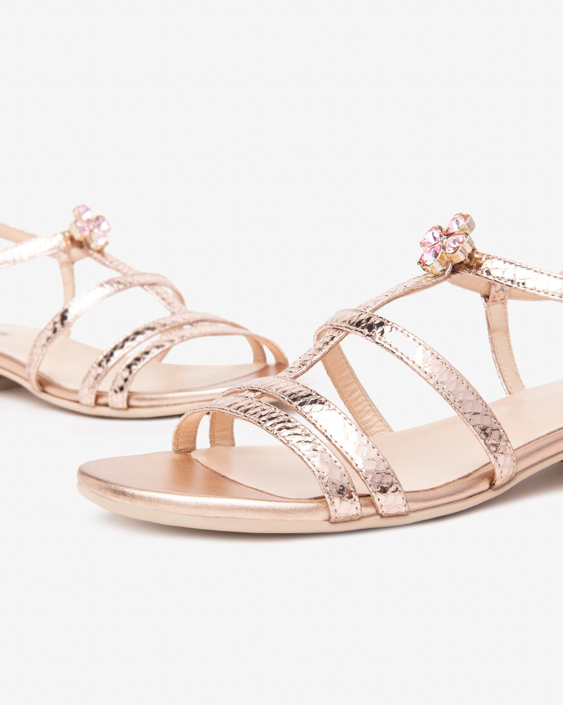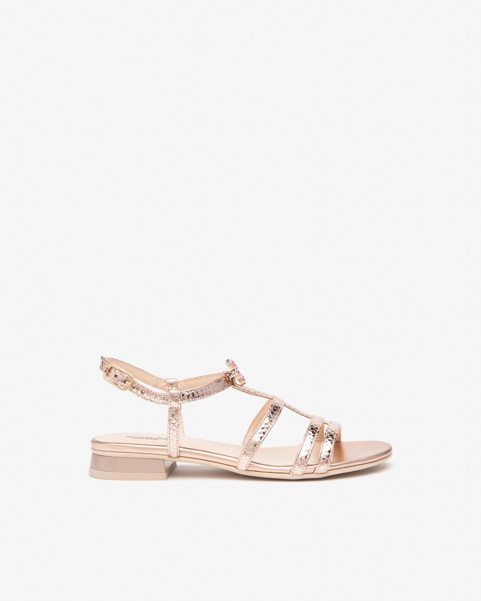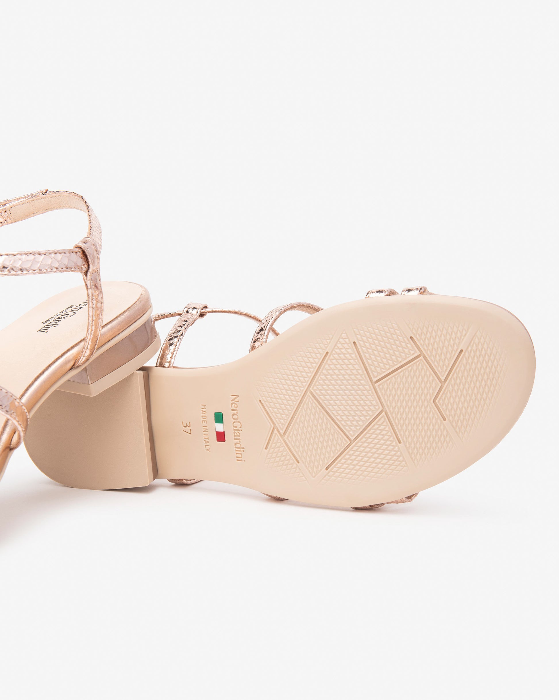 NeroGiardini strappy rose gold sandals with pink clover jeweled charms. These dressy sandals have a low block heel measuring slightly over 1 inch in height.