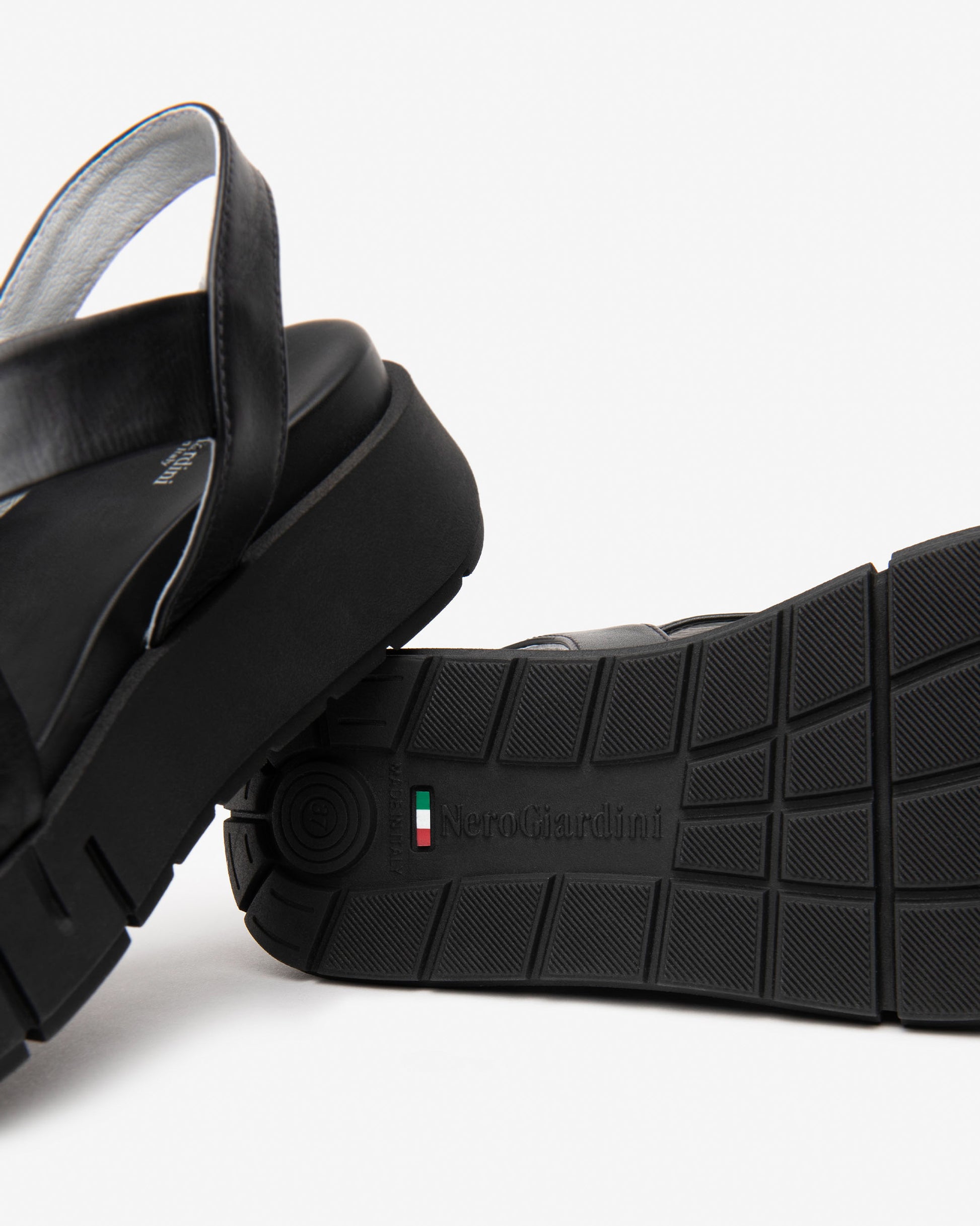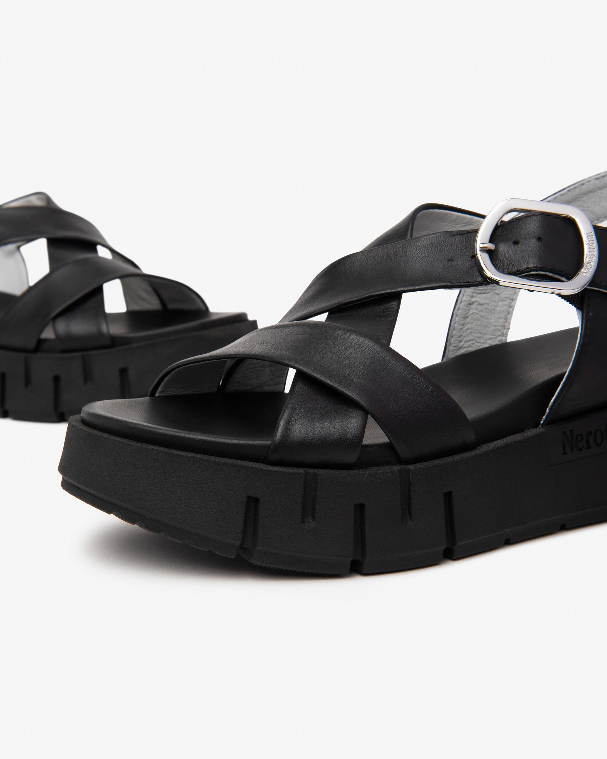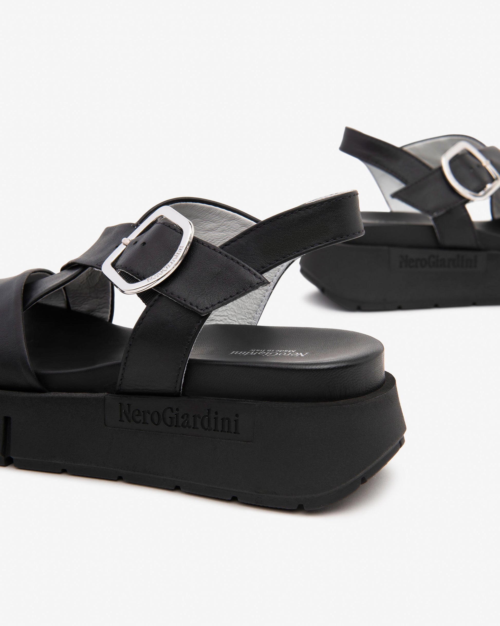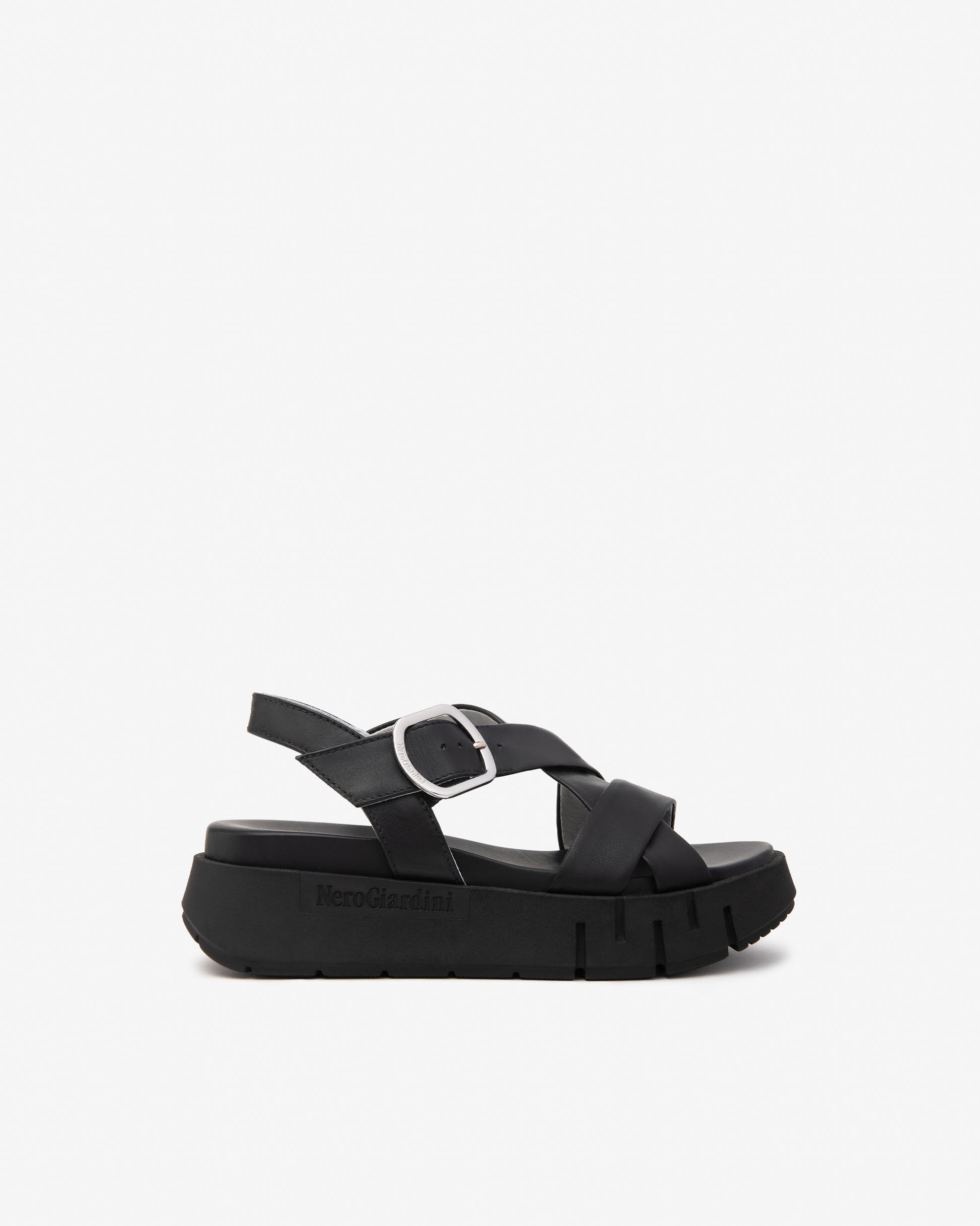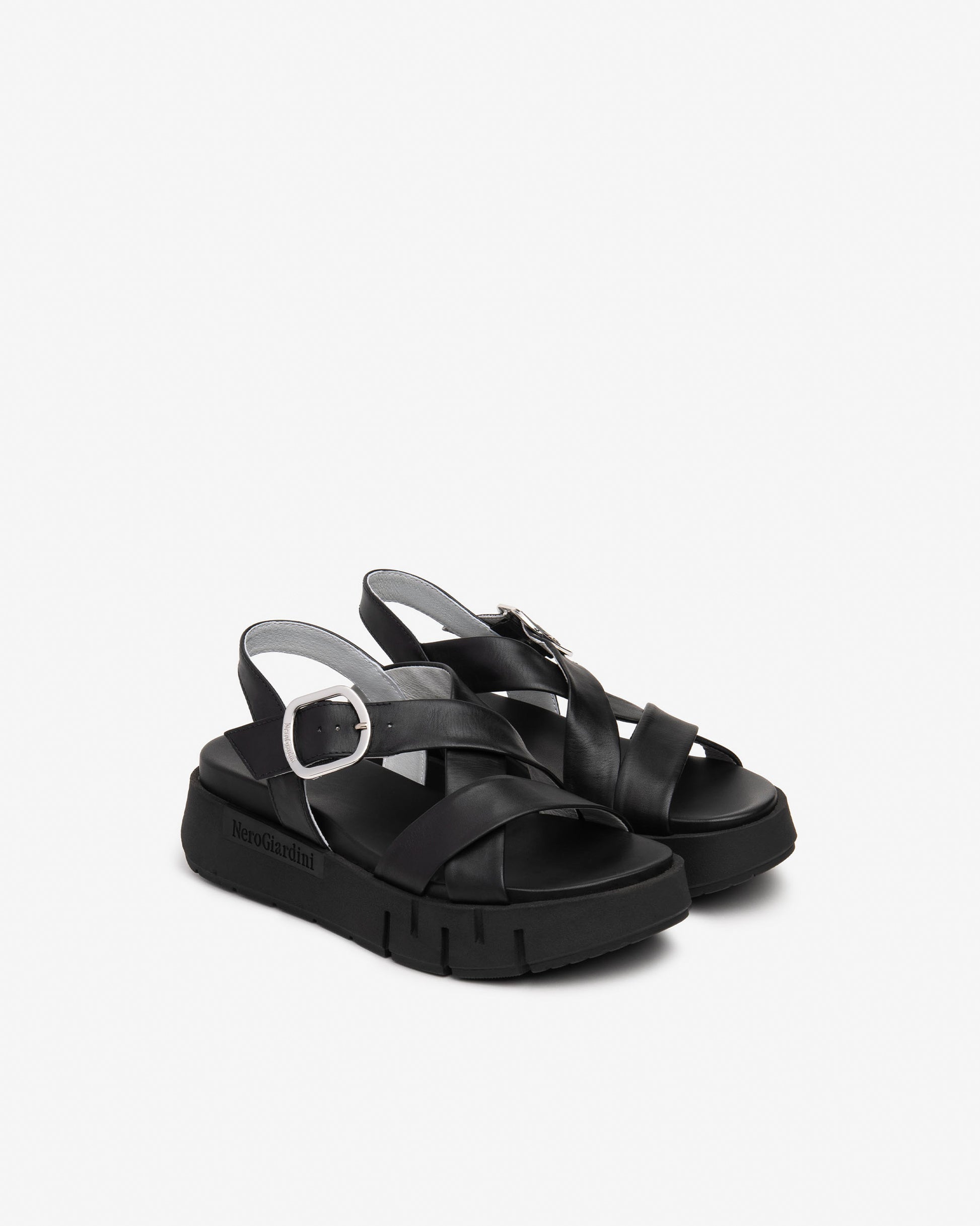 NeroGiardini chunky black leather sandals with tall 60mm wedge heel and a 40 mm platform to maintain a comfortable angle for your foot. These soft leather strappy sandals add that designer edge to a comfy all day wearable style.