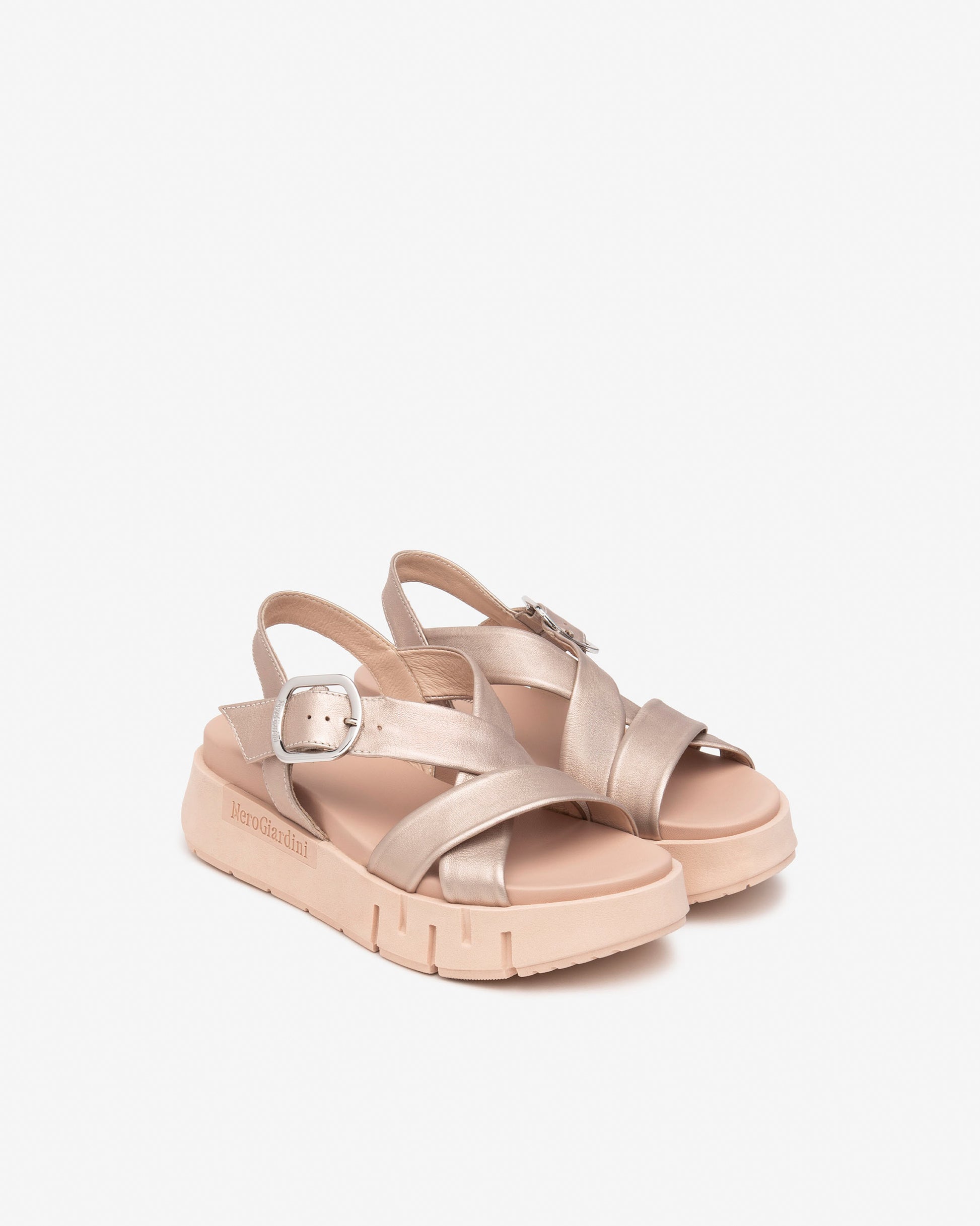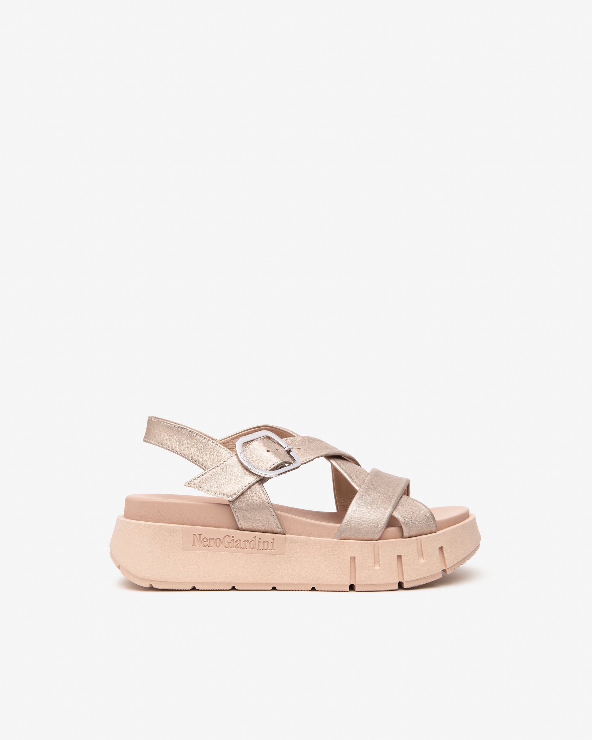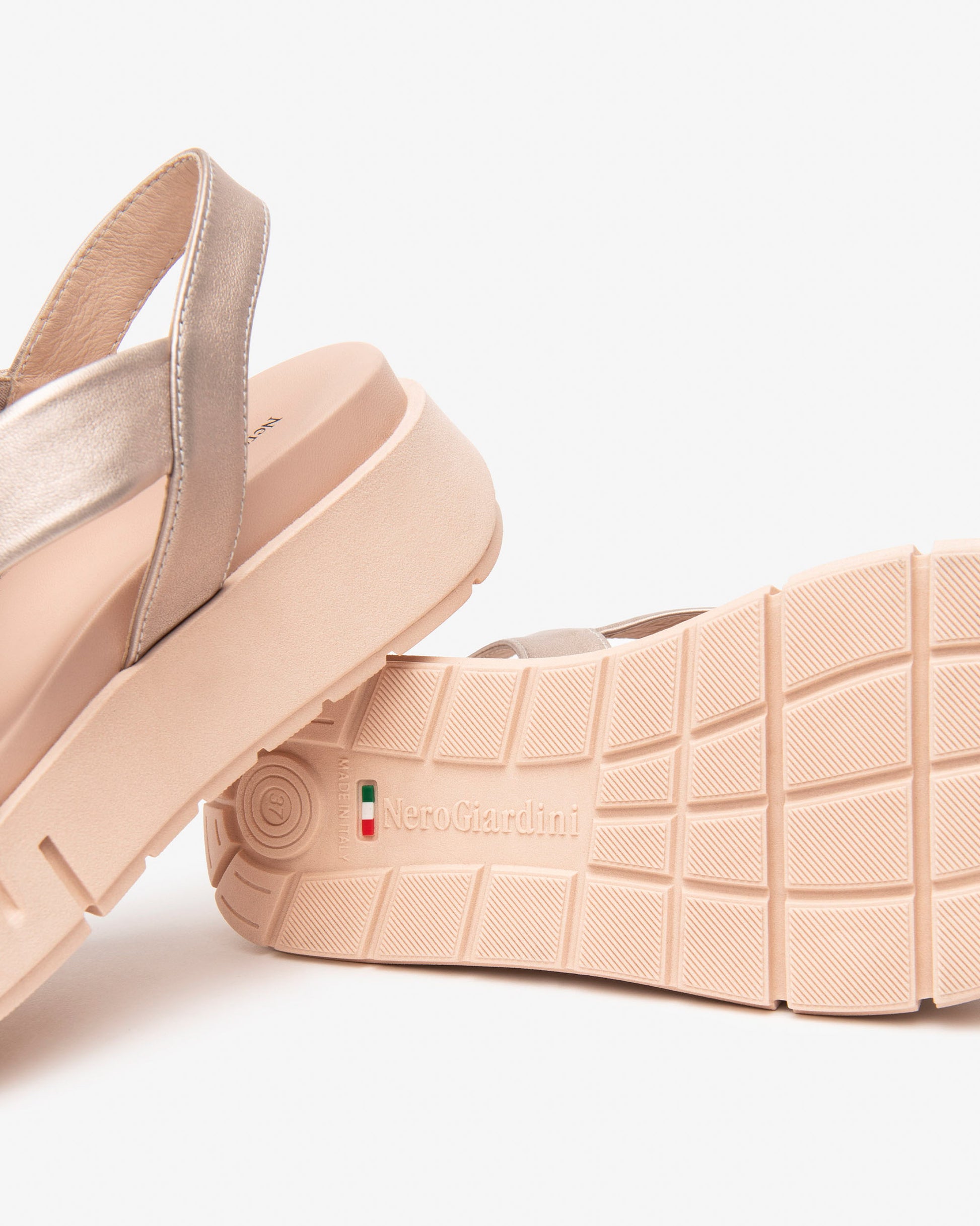 NeroGiardini chunky sand metallic leather sandals with tall 60mm wedge heel and a 40 mm platform to maintain a comfortable angle for your foot. These soft leather strappy sandals add that designer edge to a comfy all day wearable style.