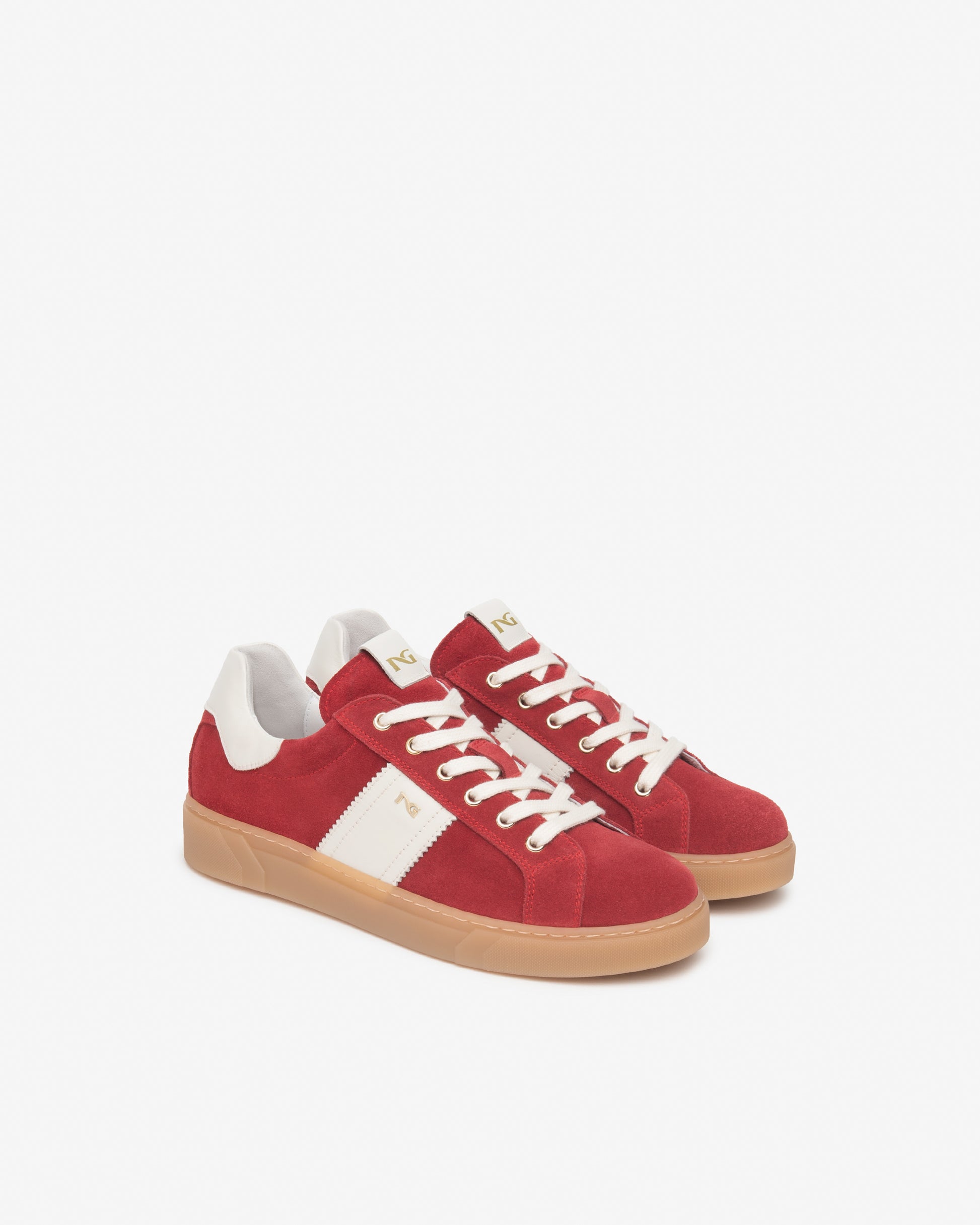 Round toes style sneakers meet dressy Italian design. Malaga red suede sneakers with soft gold accents pair beautifully with all lighter clothing colours. Made in Italy, NeroGiardini offer beautifully crafted footwear with exclusive designs and true leather craftsmanship.