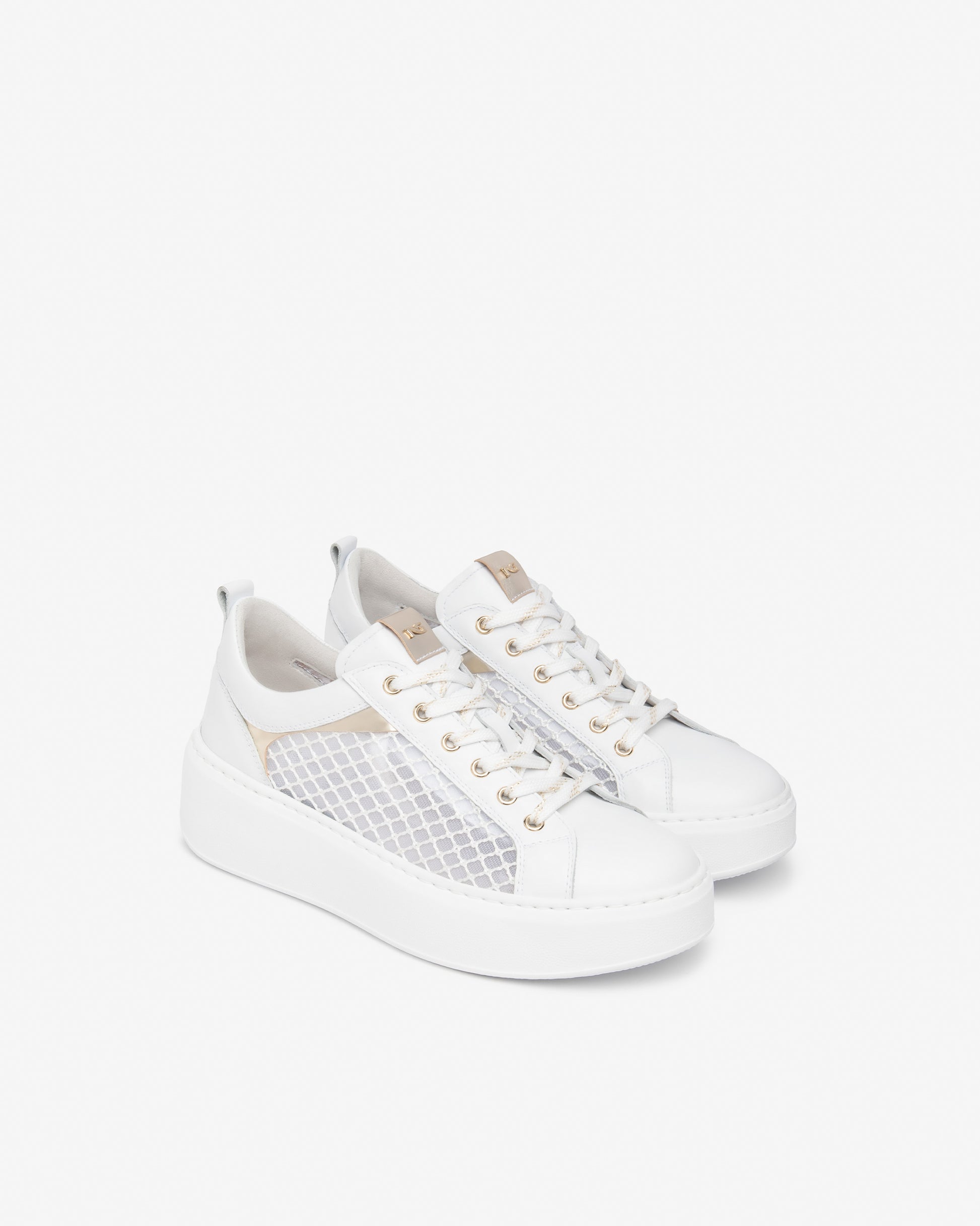 White leather platform sneakers with see through mesh panels for a cool and feminine look to balance the chunky platform sole. Made in Italy, NeroGiardini offer beautifully crafted footwear with exclusive designs and true leather craftsmanship.
