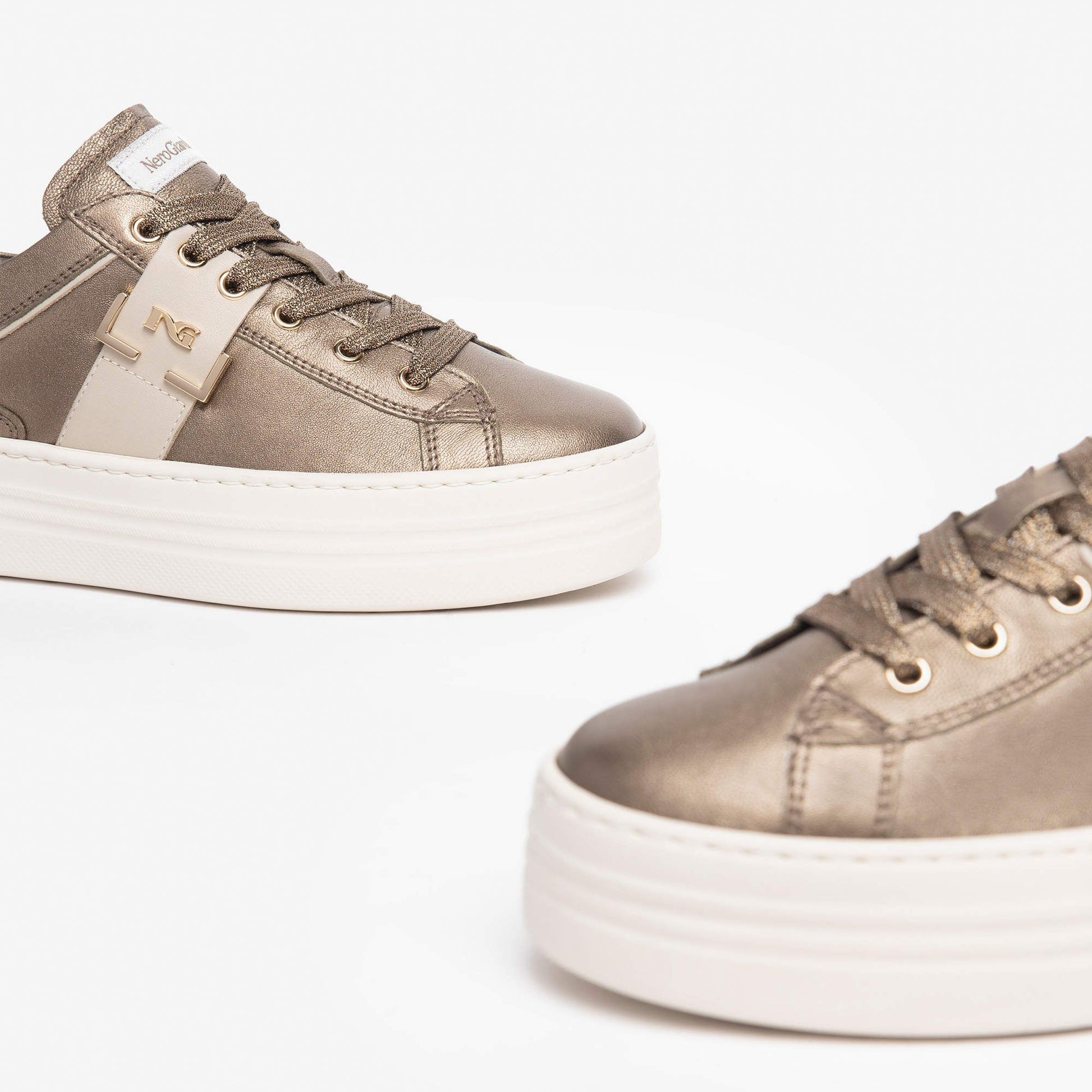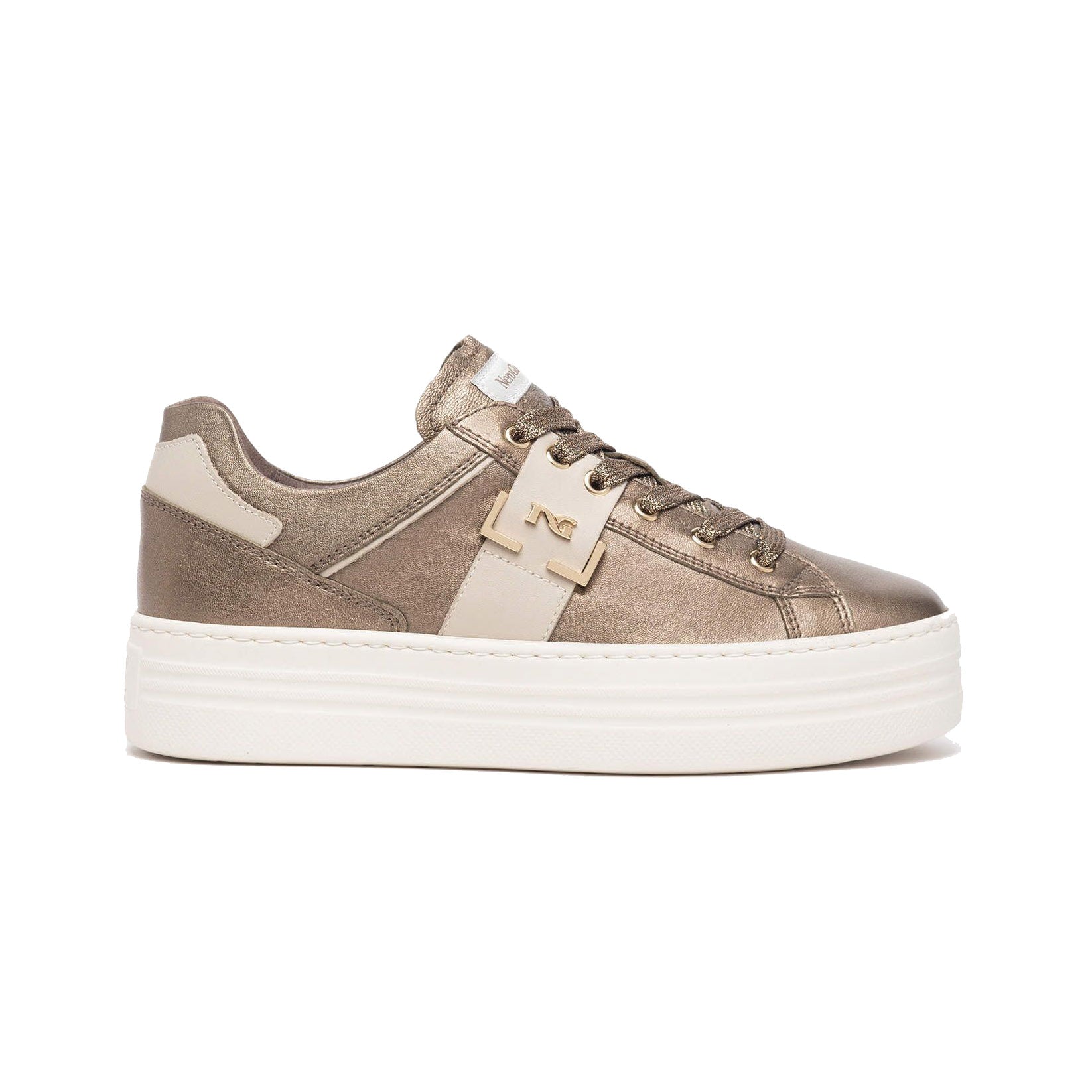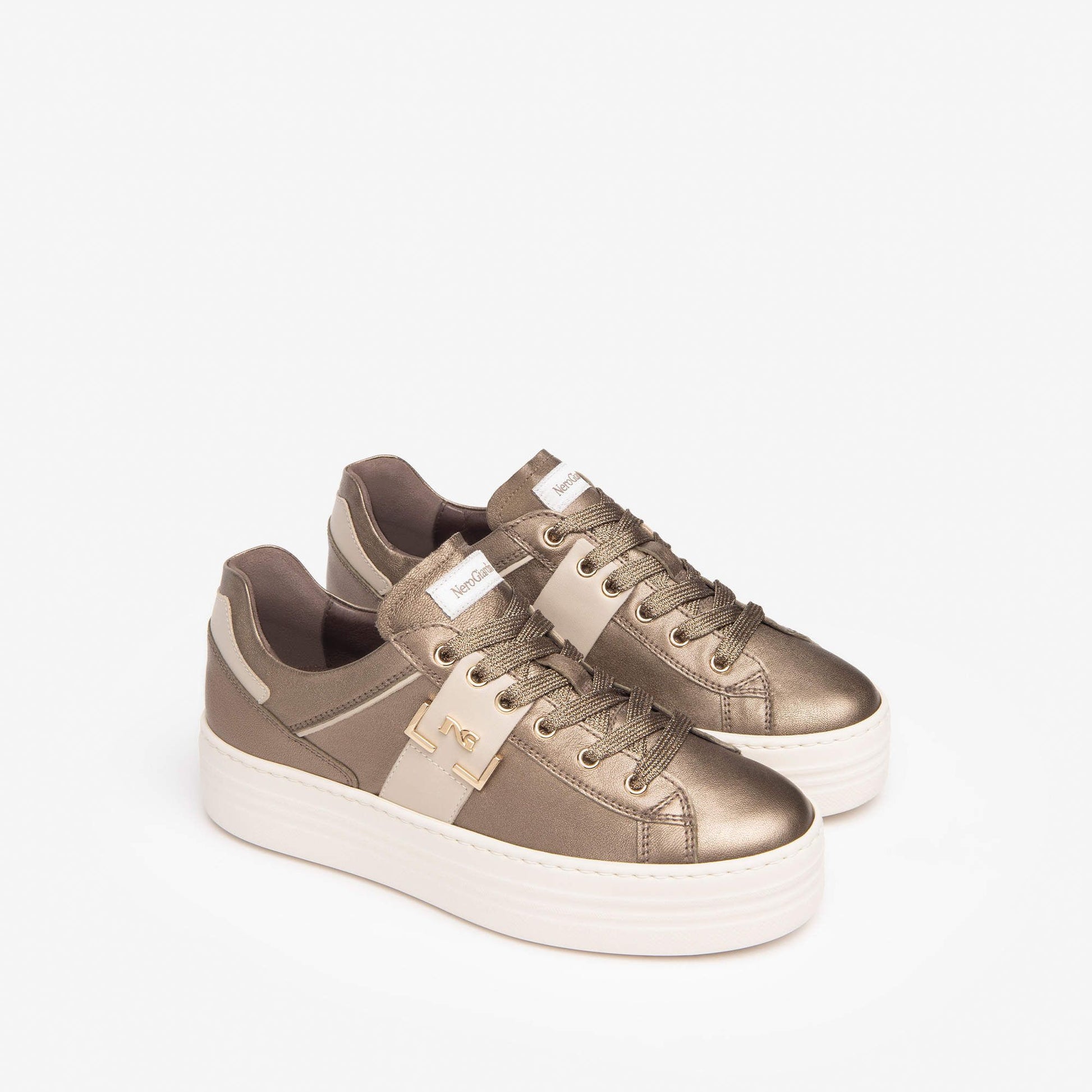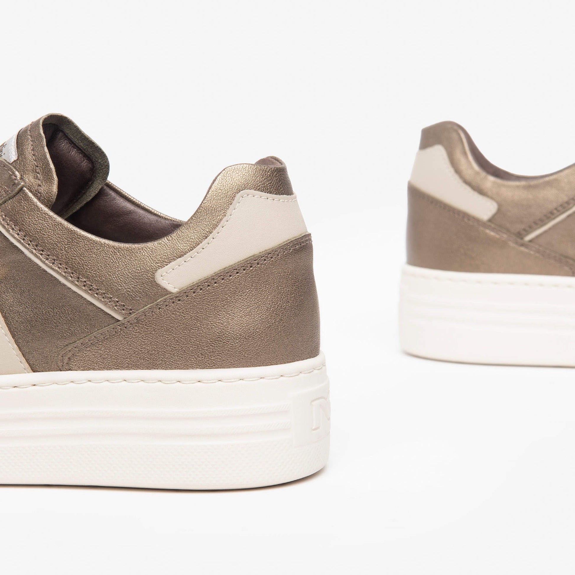 Italian soft bronze leather signature sneakers with gold leather stripe and metallic heel trim.