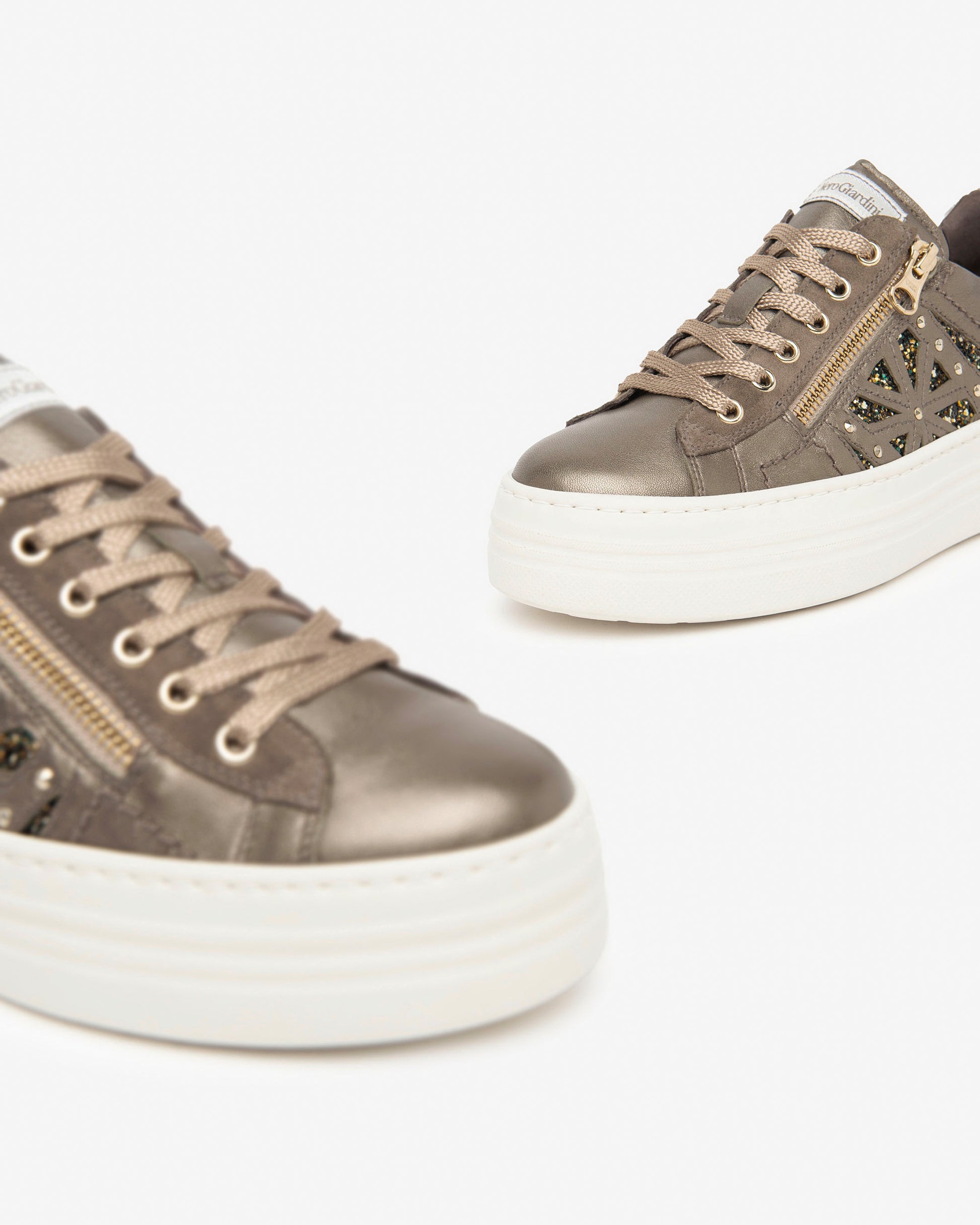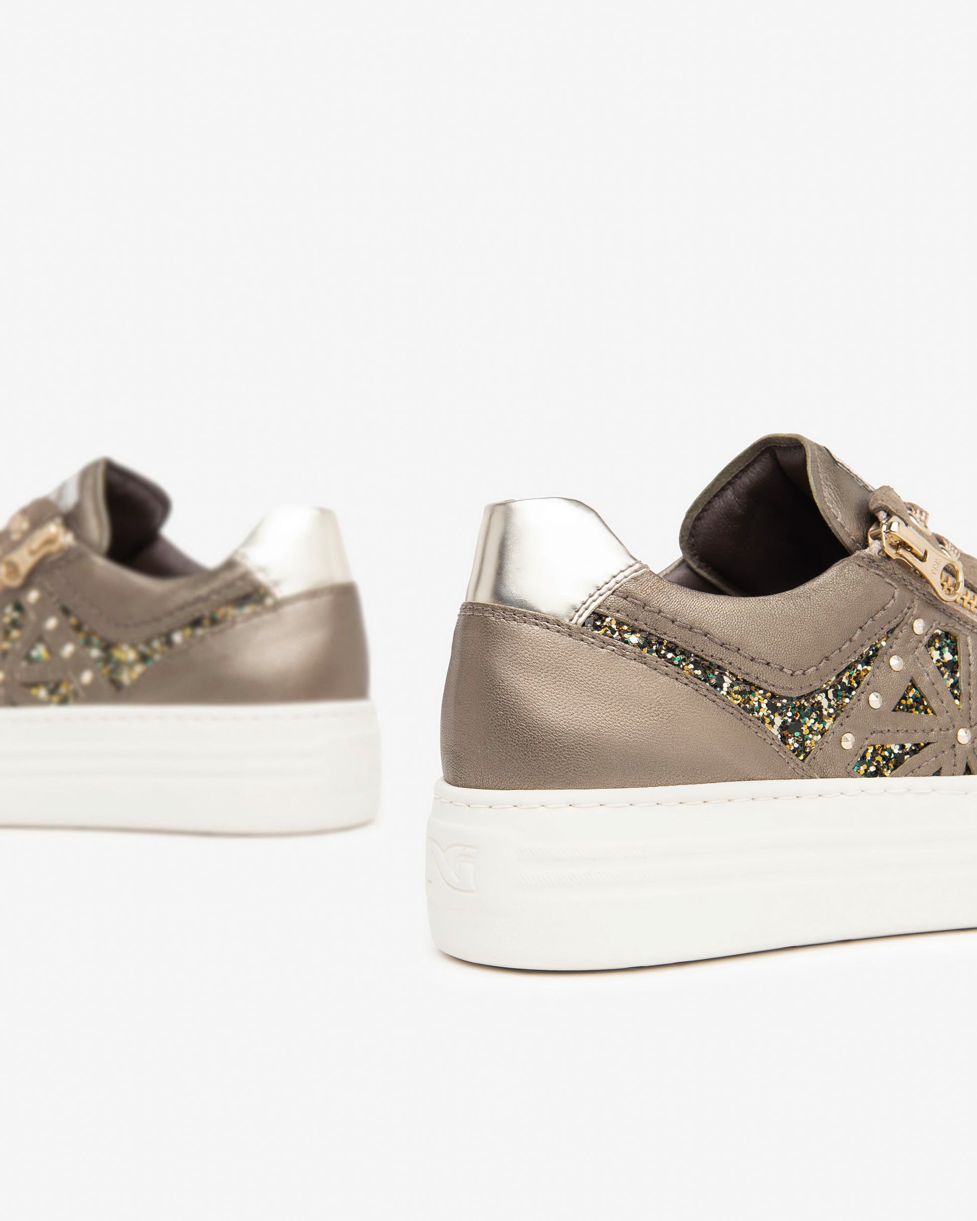 NeroGiardini neutral tone bronze leather sneaker. These beautifully crafted leather sneakers have a mini cream coloured platform sole which matches perfectly with the gold zip and trim. Pair with skinny jeans of leggings for a smart everyday look.