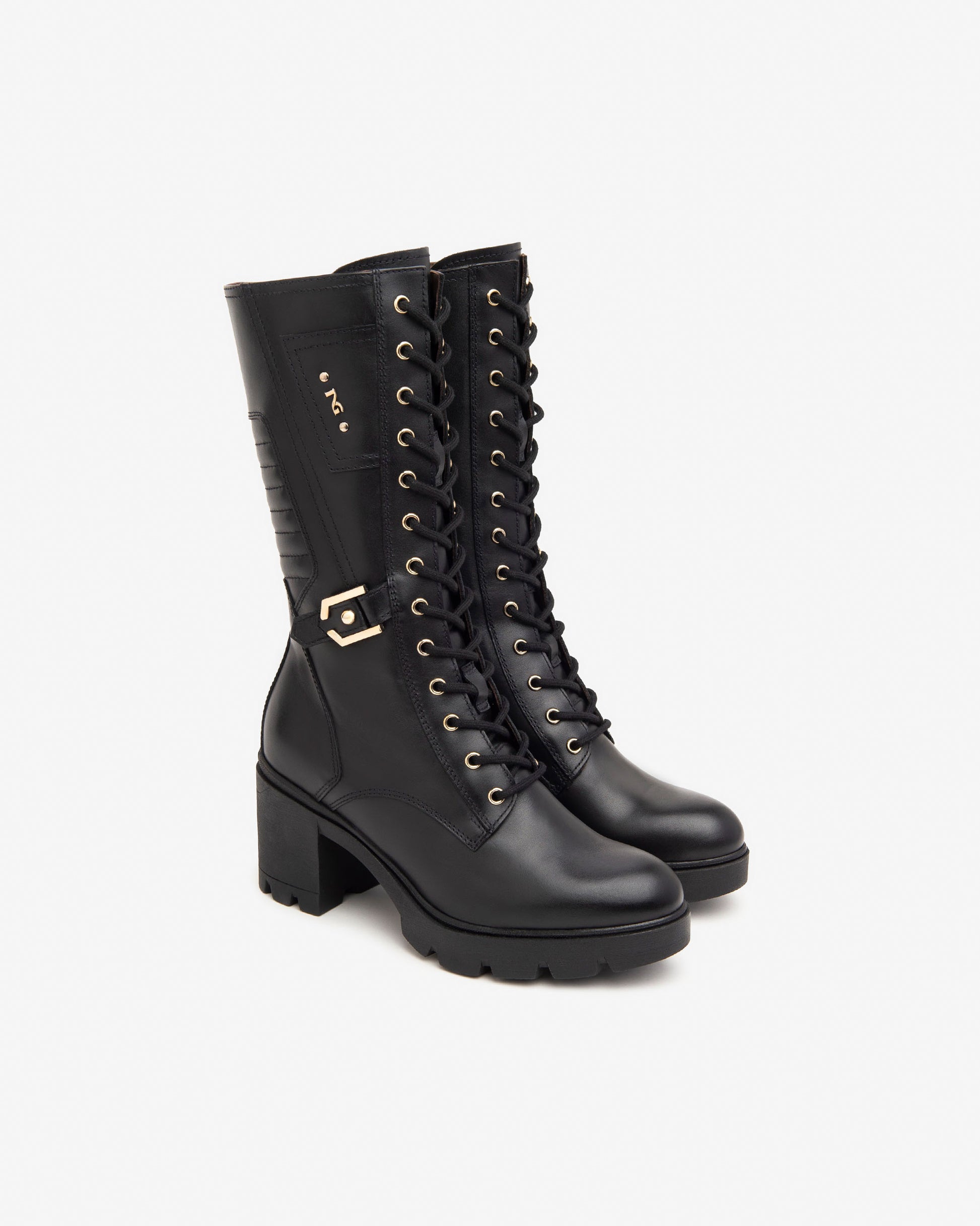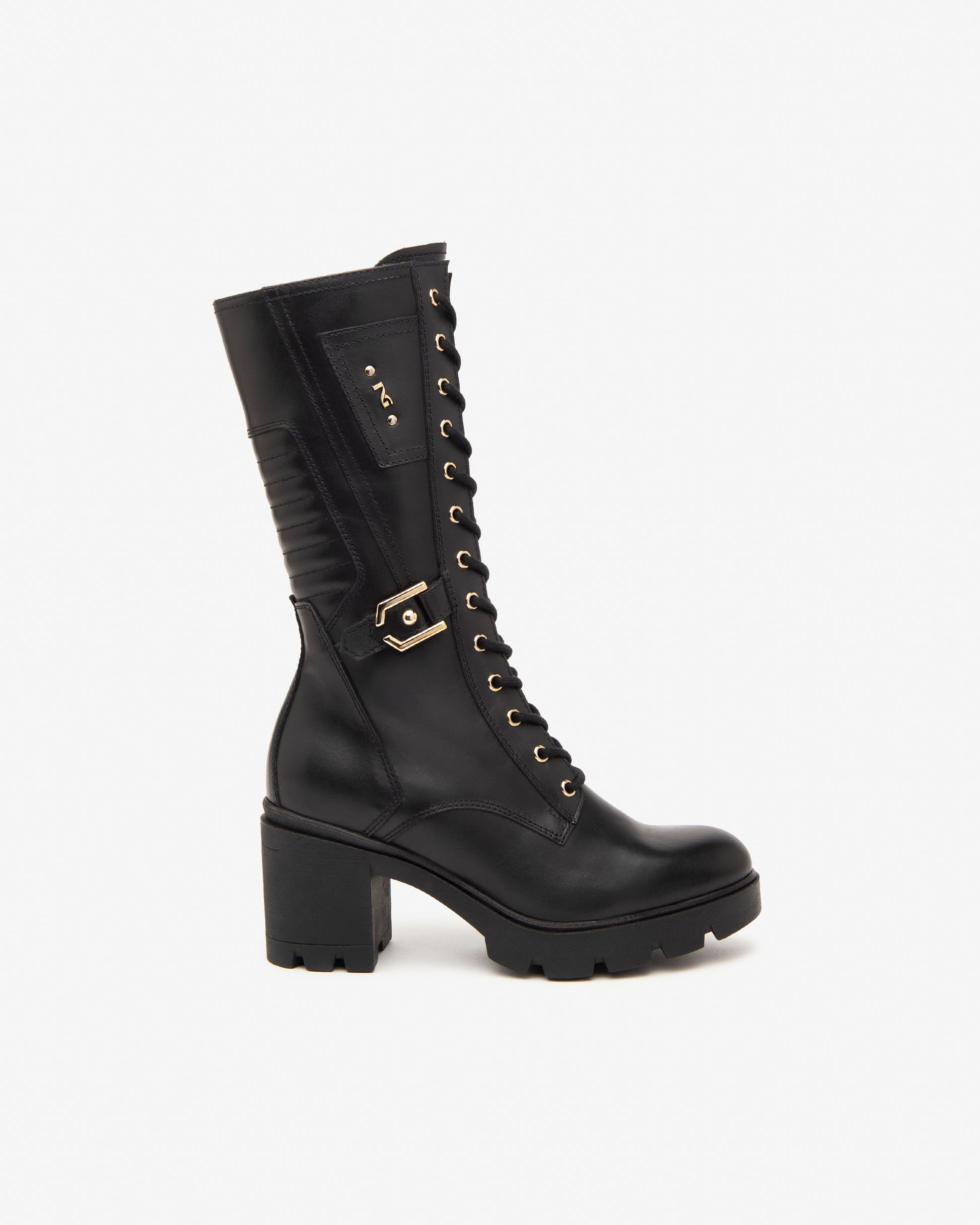 NeroGiardini I411903 chunky heel mid calf length biker boots with full length zip and adjustable lace up front.
