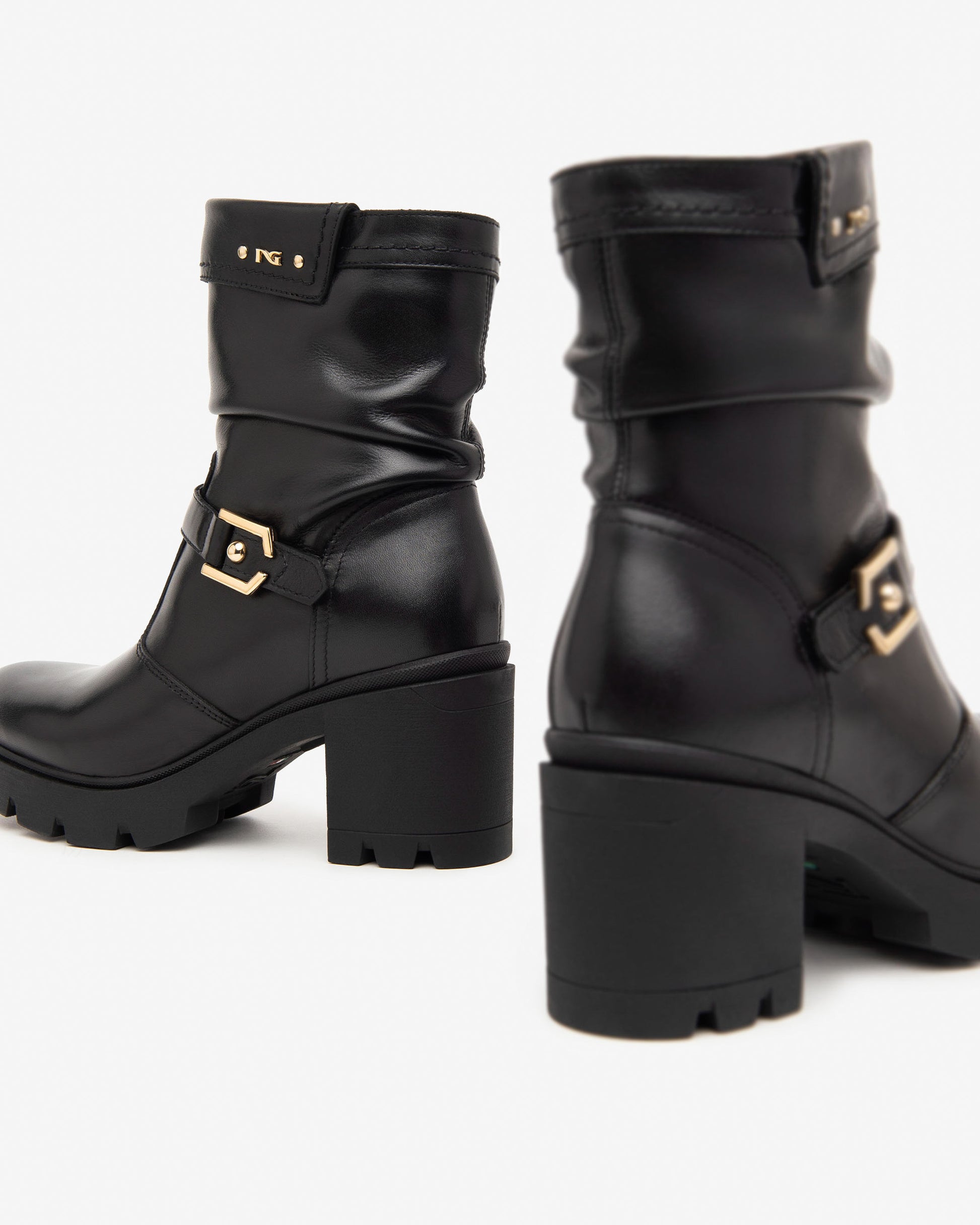 NeroGiardini soft leather biker boots with chunky heel. These beautiful Italian leather boots have a slouch top which looks equally good over leggins or with a dress. The taller 70mm block heel is made from a cushioned rubber which makes this boot very comfortable for such a height.