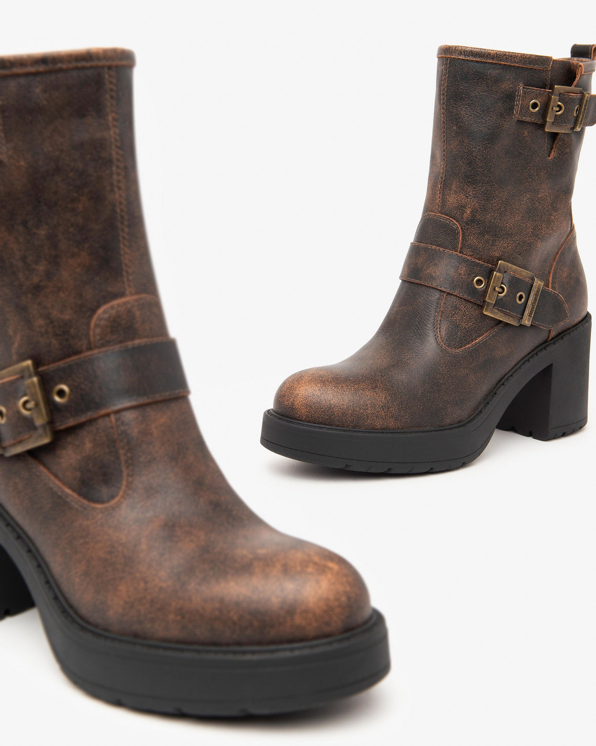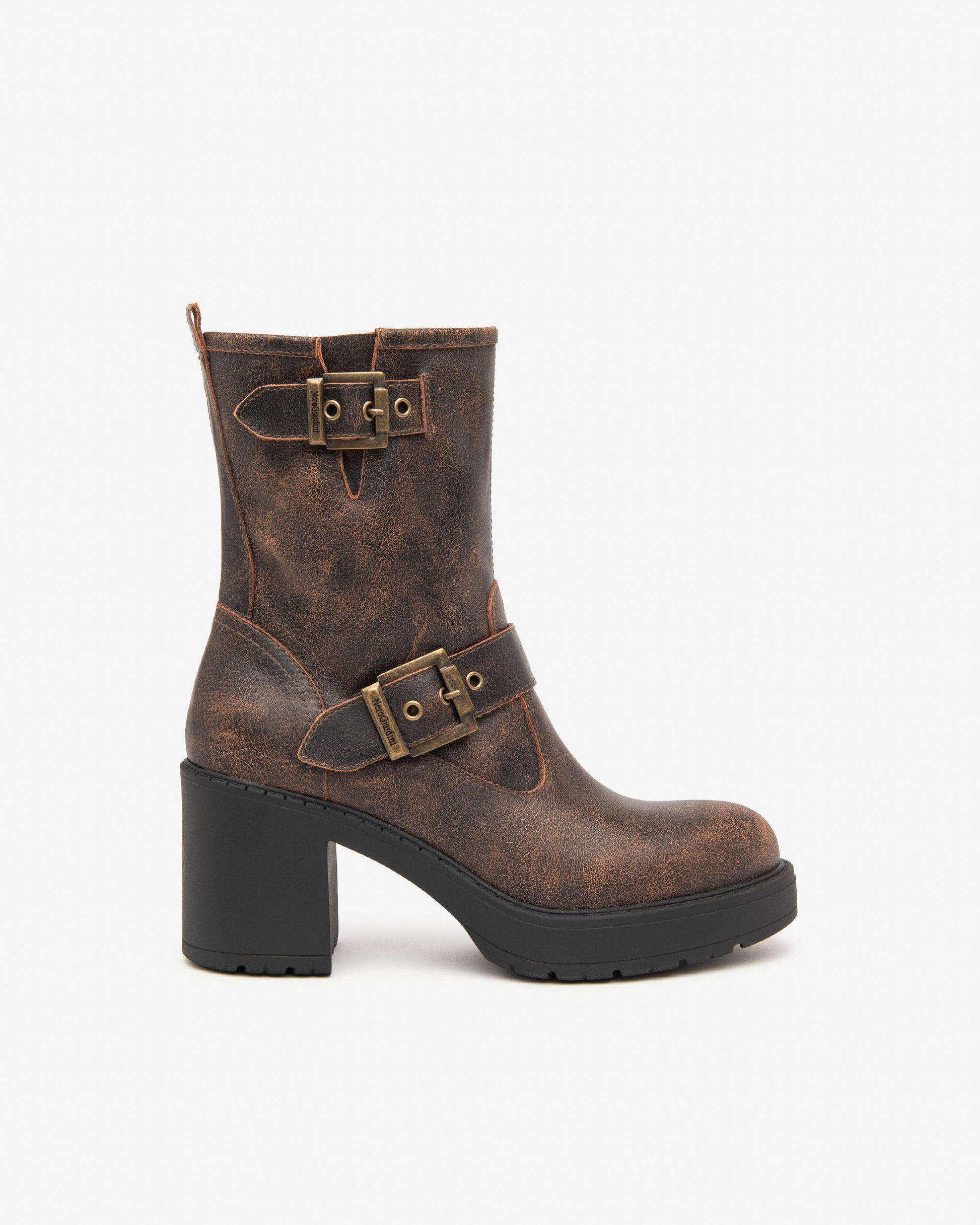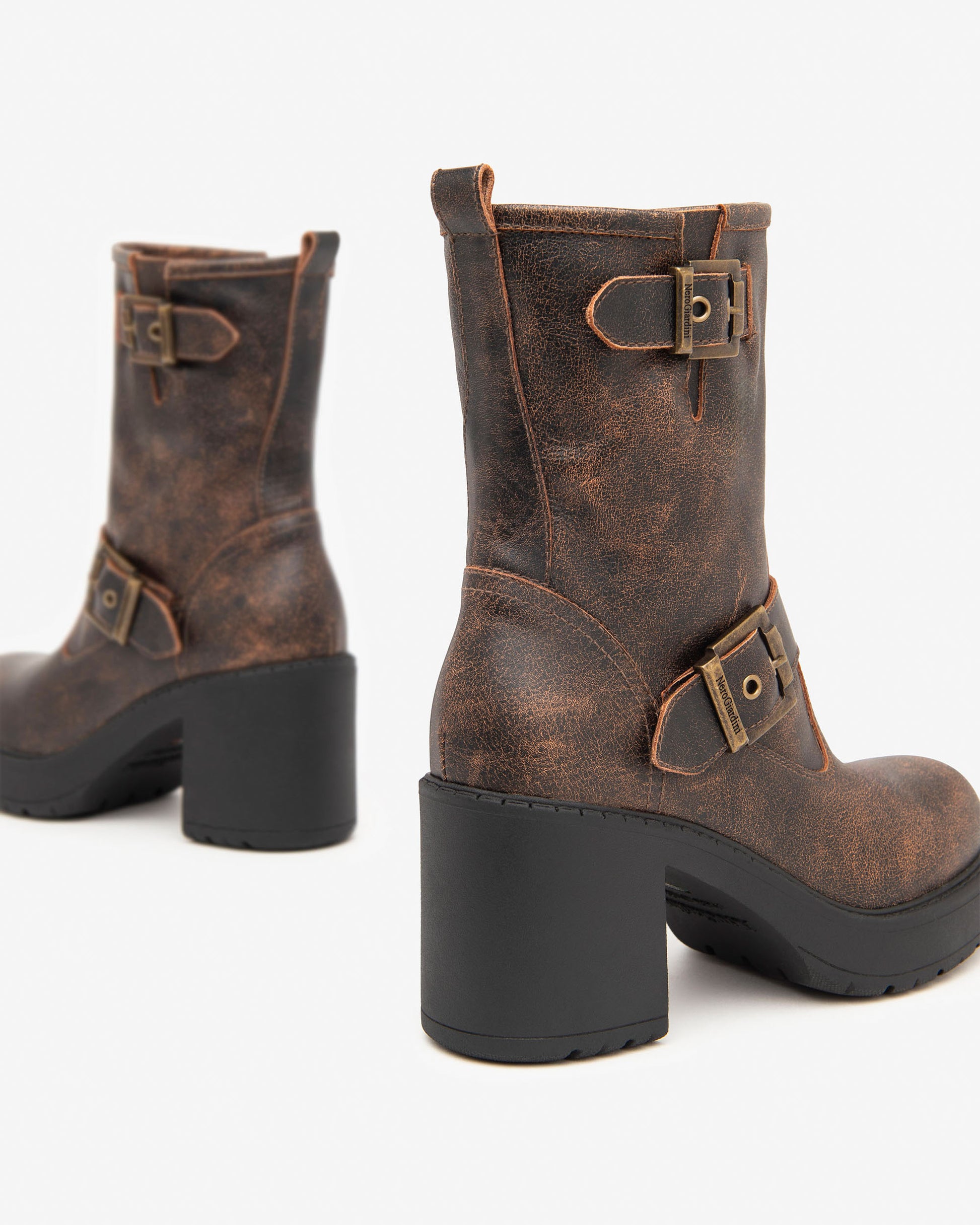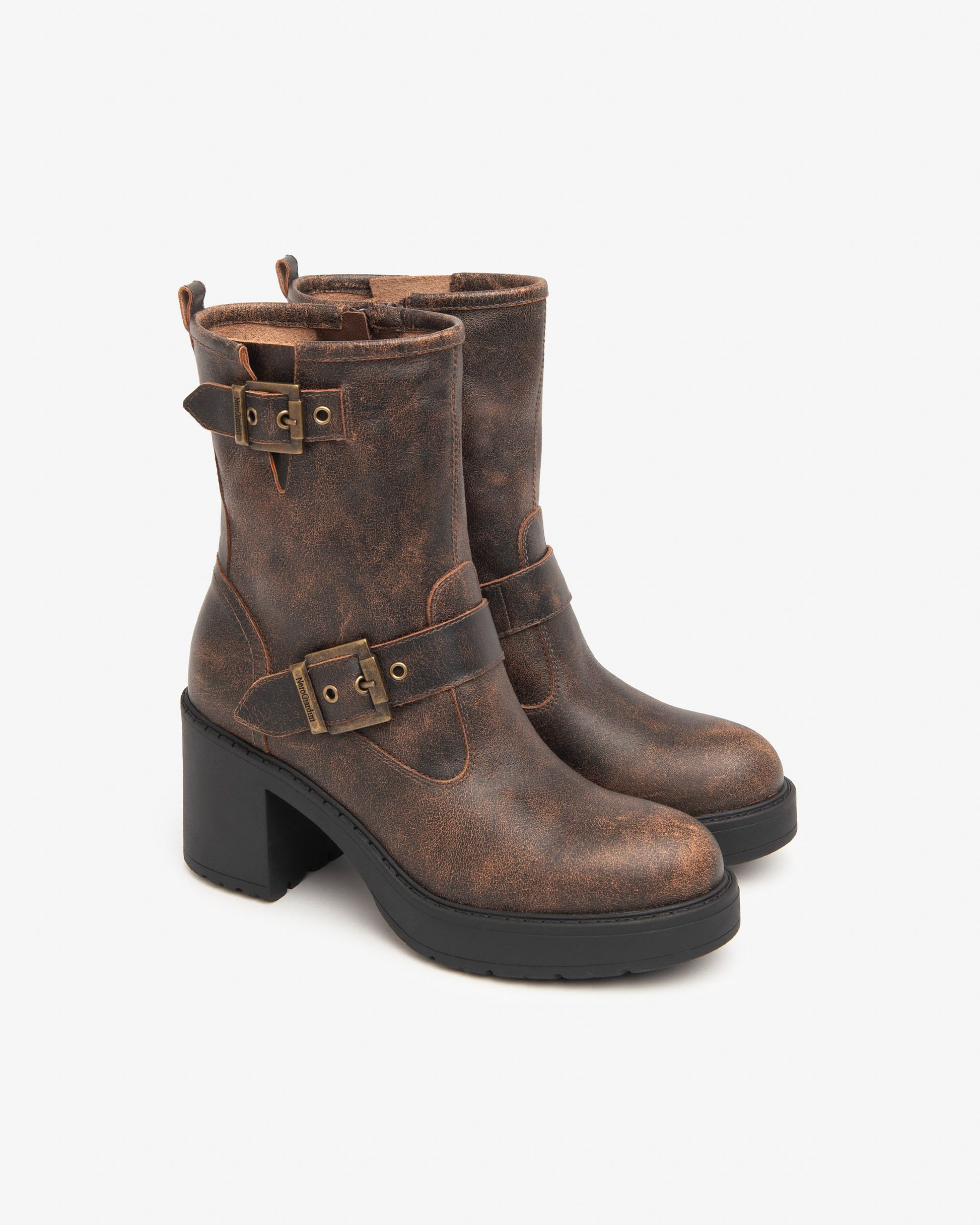 NeroGiardini distressed leather biker boots with chunky heel. These beautiful aged Italian leather boots look great with skinny jeans and with a chunky 70mm heel they are surprisingly comfortable for all day wear.