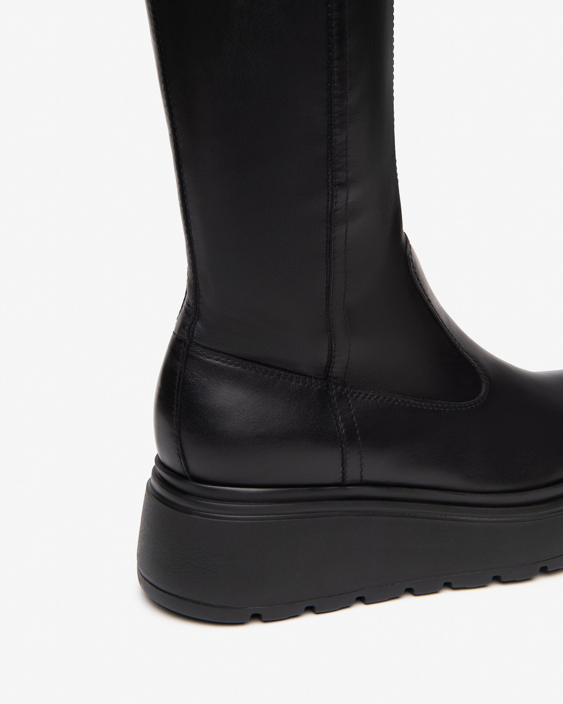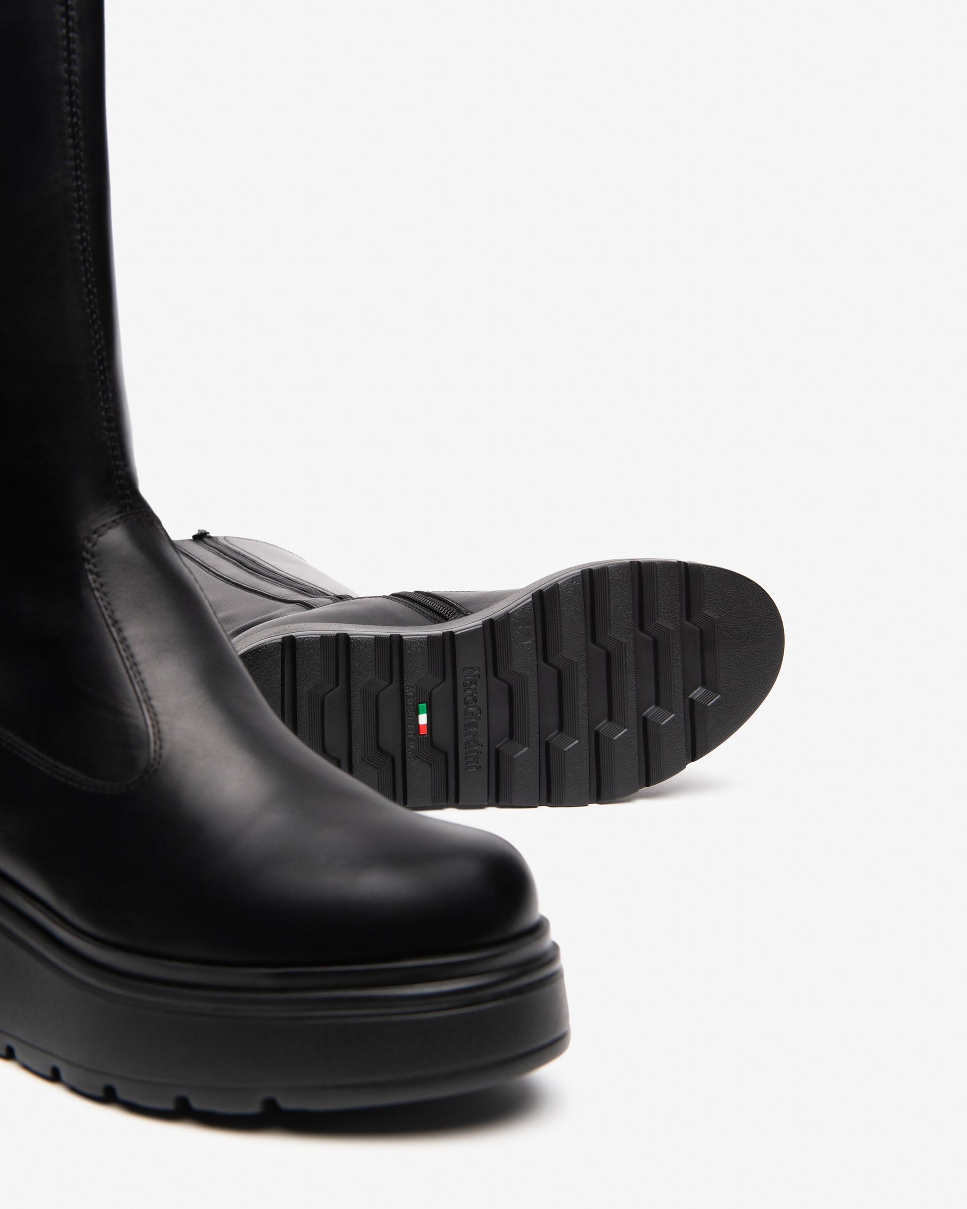 NeroGiardini Gori knee length Italian leather boots with simple clean lines and a stretch calf panel for a perfect fit. This contemporary look pairs well with leggins or a dress for a smart and practical winter look.