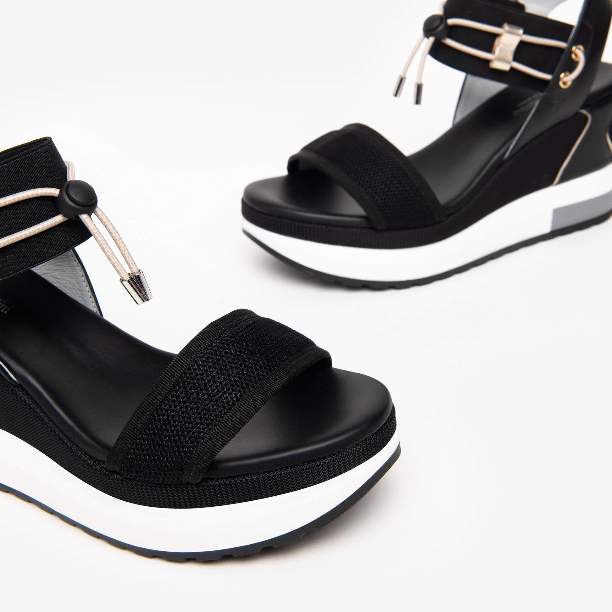 NeroGiardini tall 9 cm wedge heel sandal with a 3 cm platform sole provide instant height on those occasions when you want to be taller. These are beautiful on trend Italian leather sandals with a luxuriously cushioned leather footbed. Soft woven mesh front strap and elasticated ankle strap with bungee lace adjustment finished off with a soft deep heel strap detail.