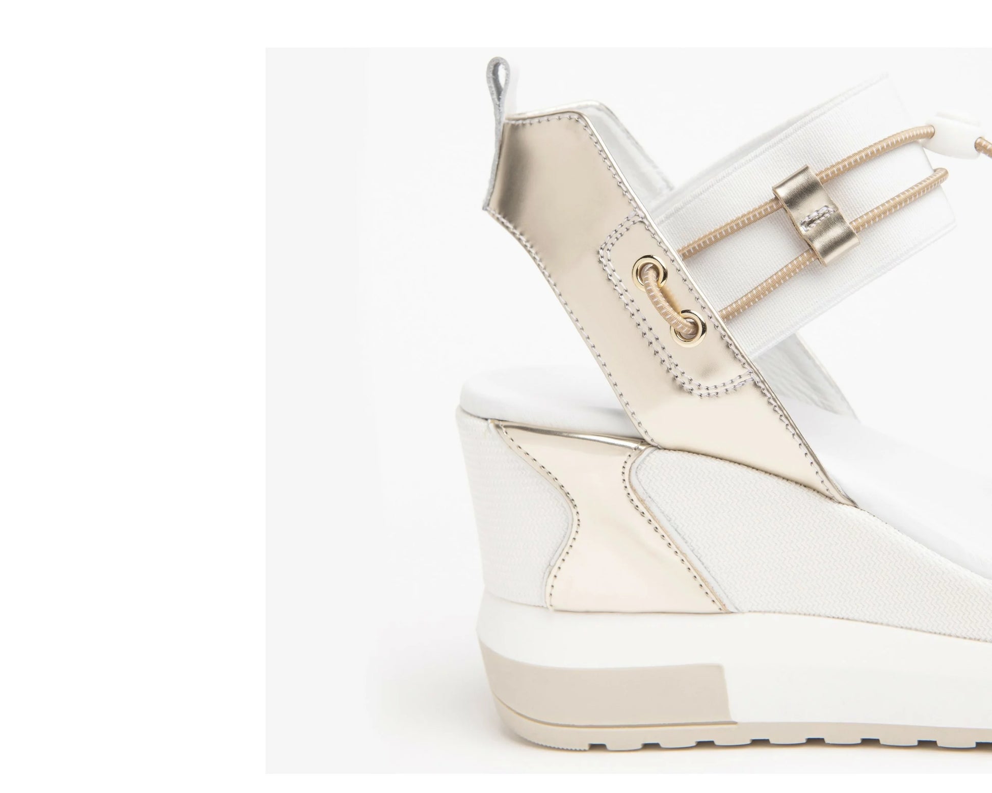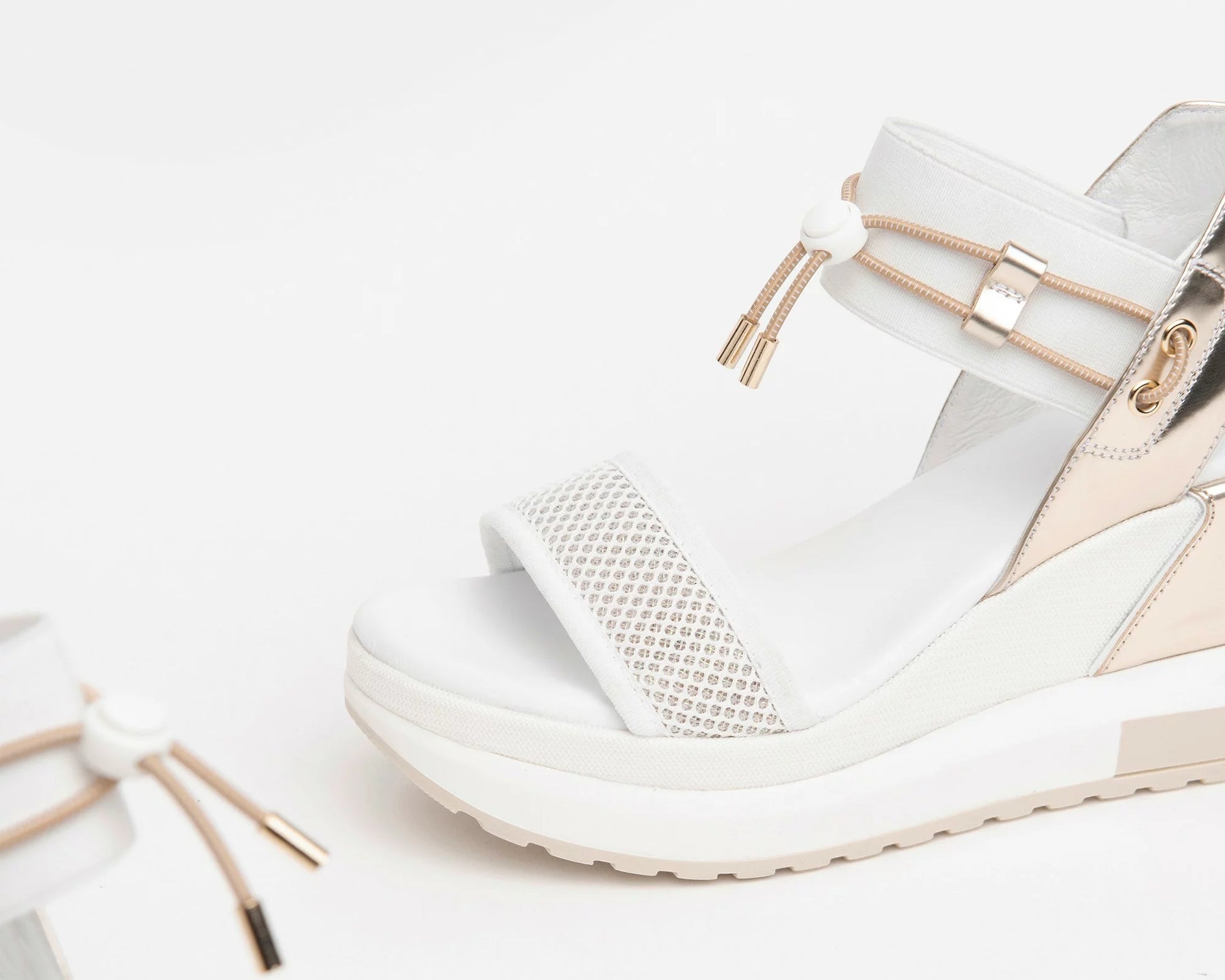 NeroGiardini tall 9 cm wedge heel sandal with a 3 cm platform sole provide instant height on those occasions when you want to be taller. These are beautiful on trend Italian leather sandals with a luxuriously cushioned leather footbed. Soft woven mesh front strap and elasticated ankle strap with bungee lace adjustment finished off with a soft deep heel strap detail.
