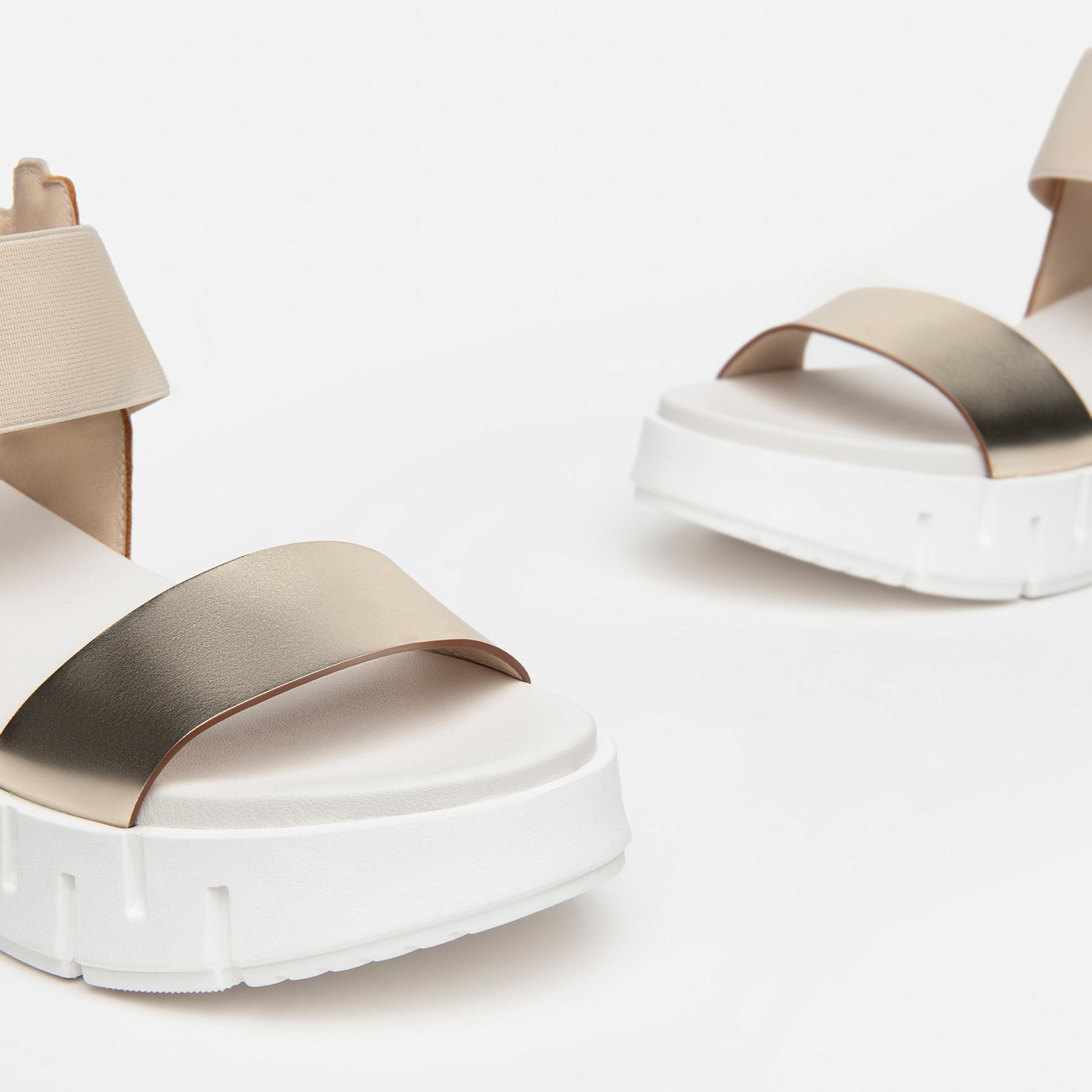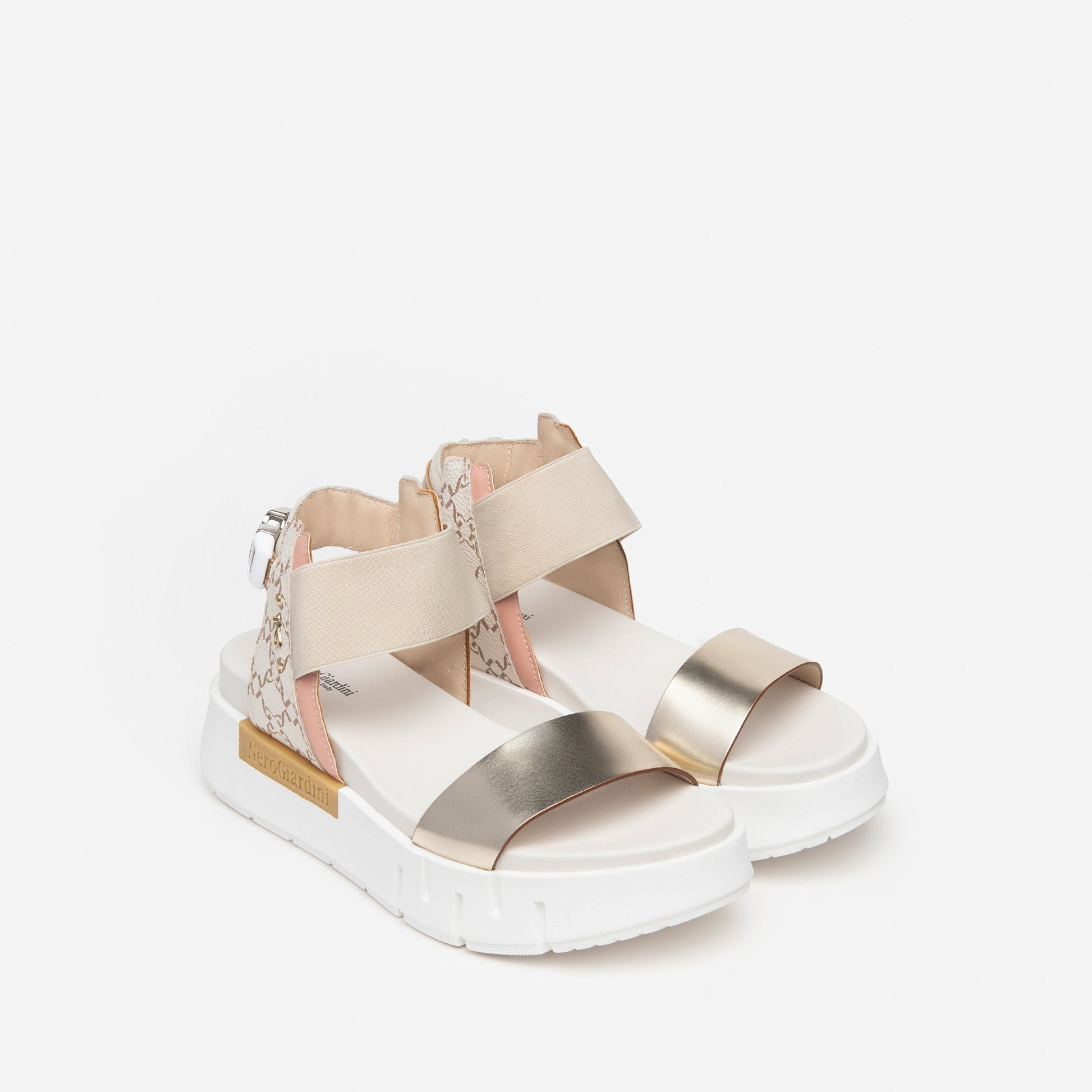 NeroGiardini 5.5 cm wedge heel sandal with a 3 cm platform sole provide instant height on those occasions when you want to be taller. These are beautiful on trend Italian leather sandals with a luxuriously cushioned leather footbed. Soft smooth gold front strap and elasticated pull on ankle strap
