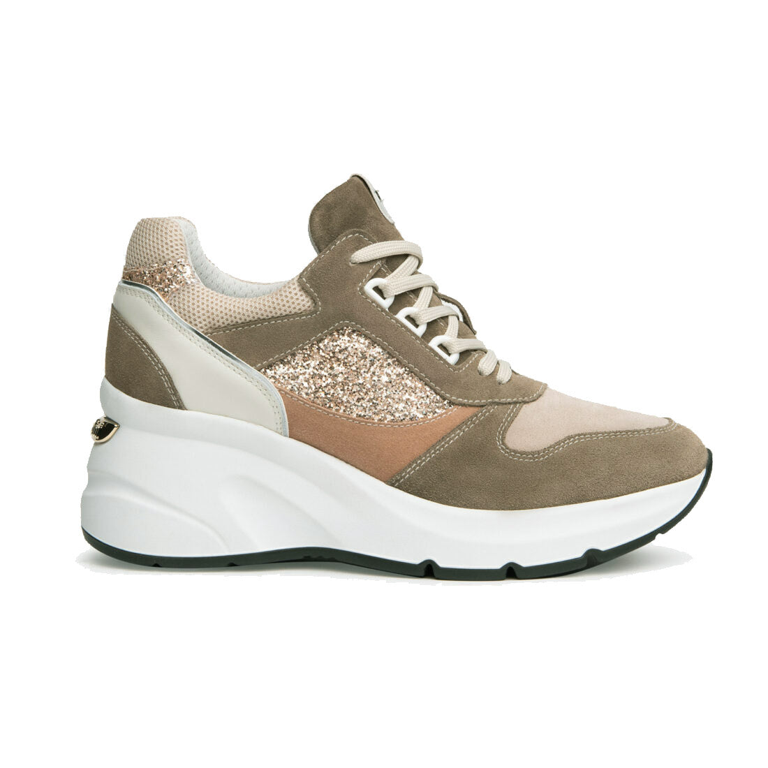 NeroGiardini wedge sneakers in a neutral combination of argilla, mink and dusky pink suede colours with sparkle side pannels and heel trim.
