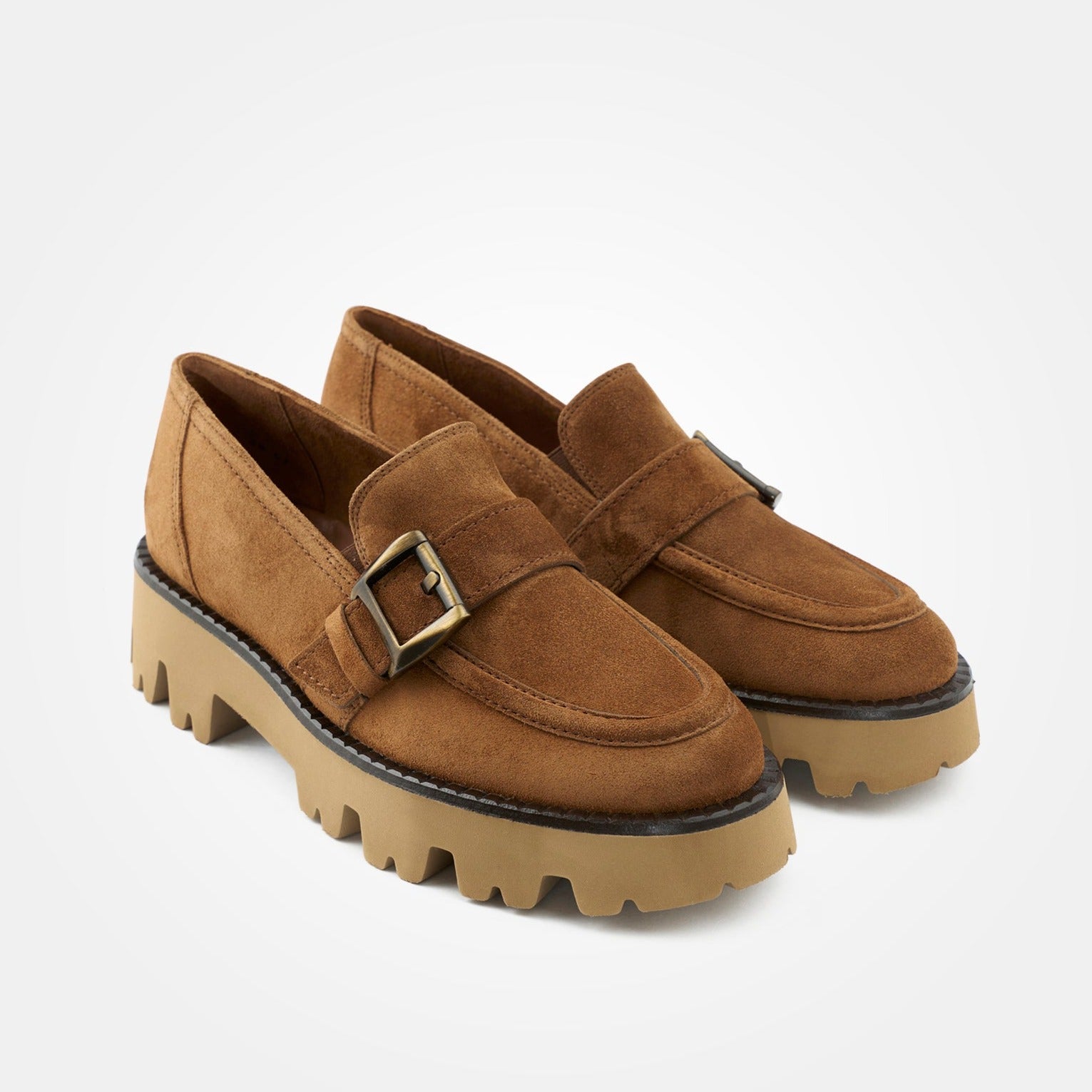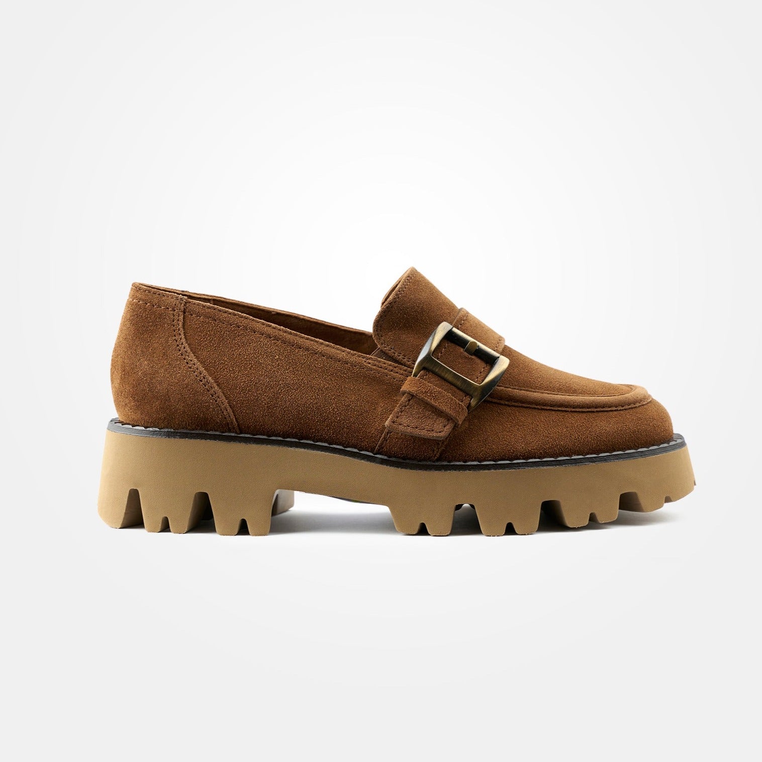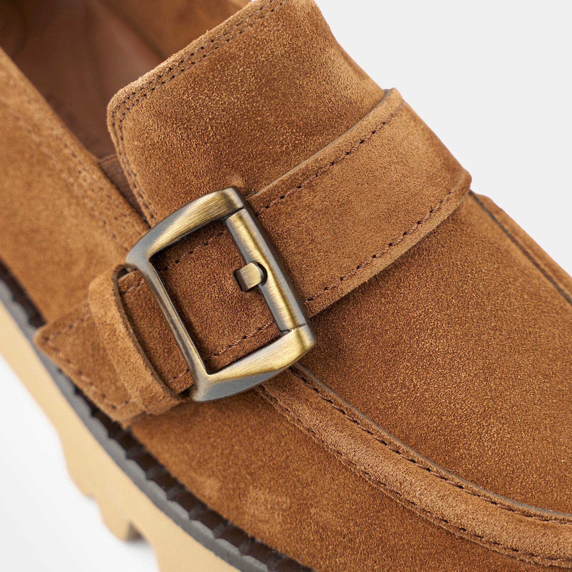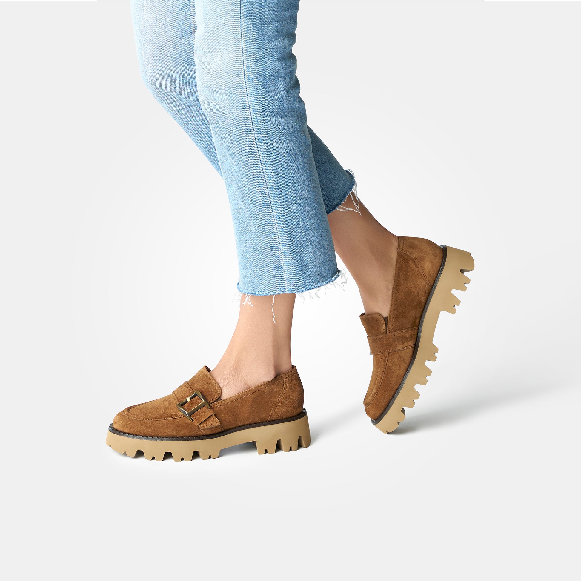 These Paul Green loafers are characterized by SUPER SOFT suede leather in a medium brown hue with an antique brass side buckle. Perfect for cropped trousers or a dress for a casual street style look. Paul Green shoes are distinguished by a combination of elegance and sportiness.
