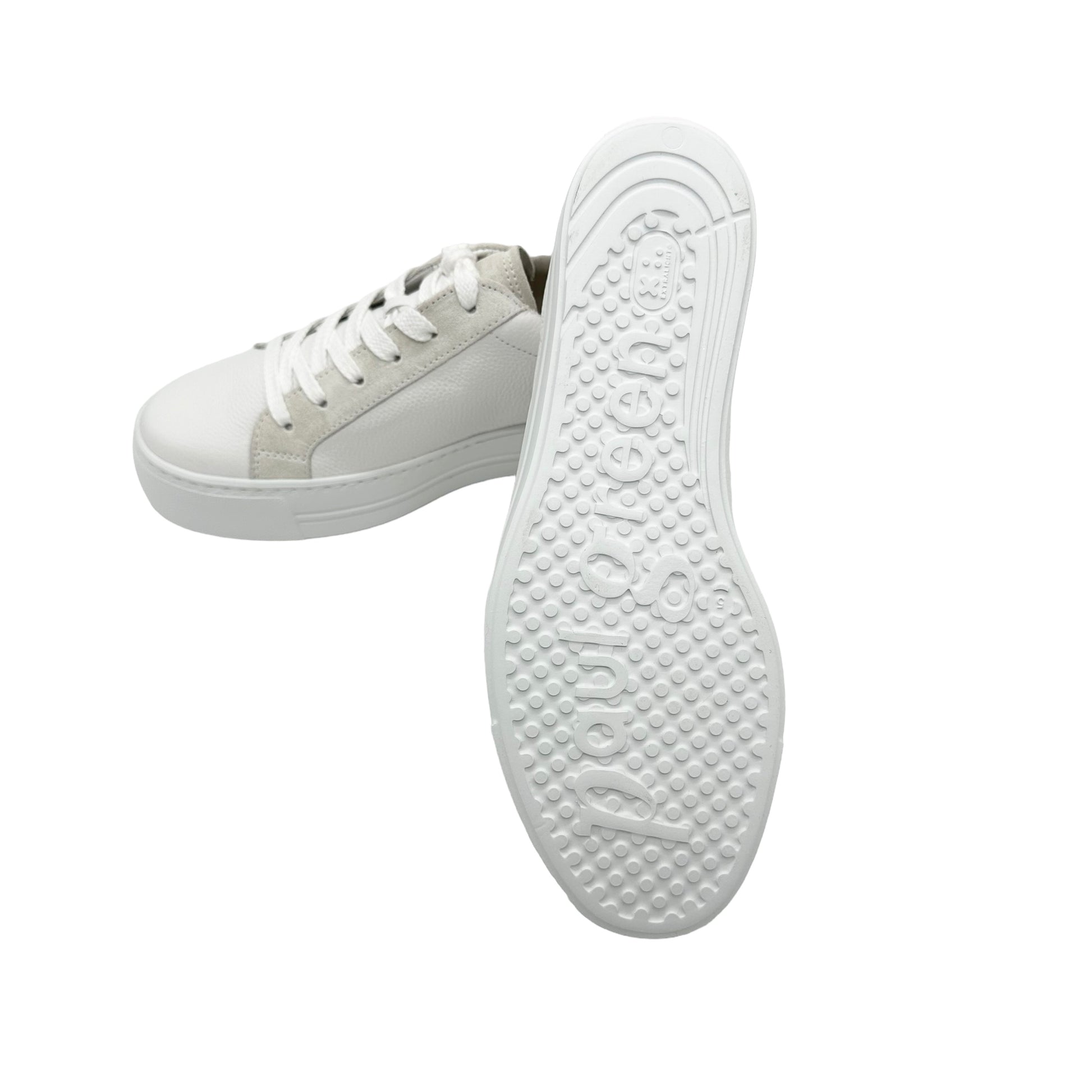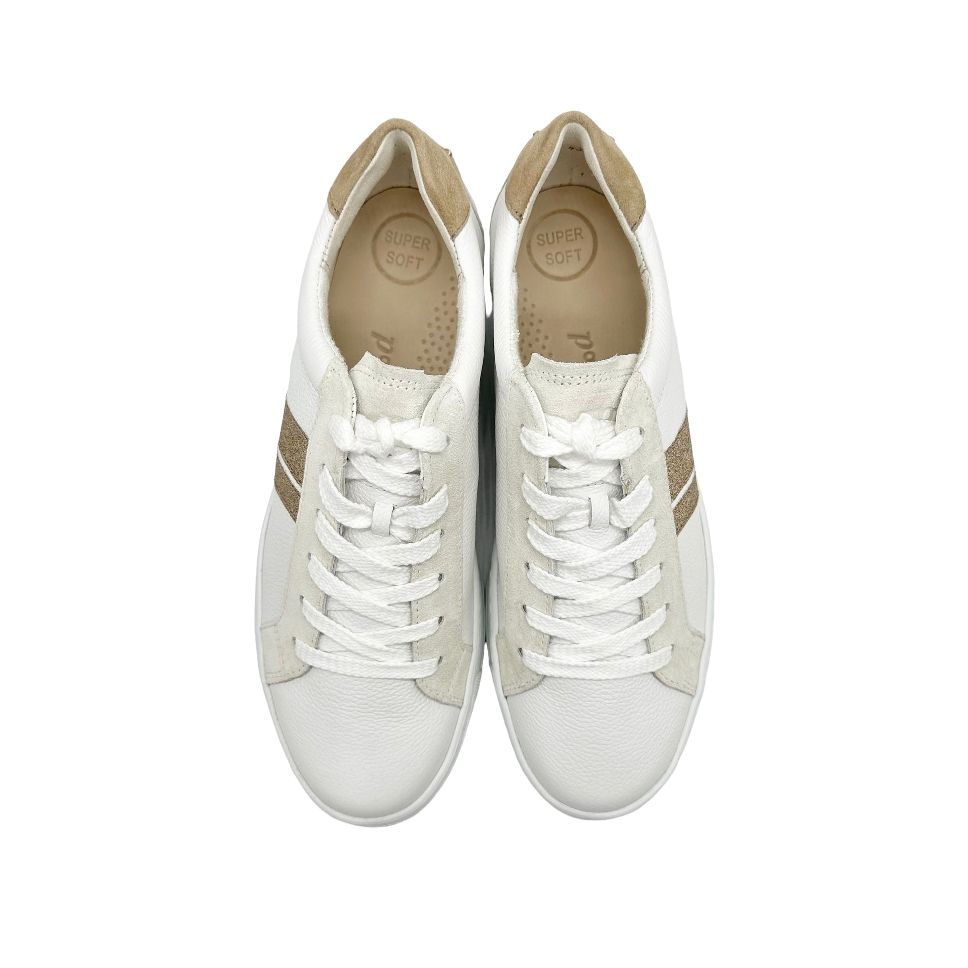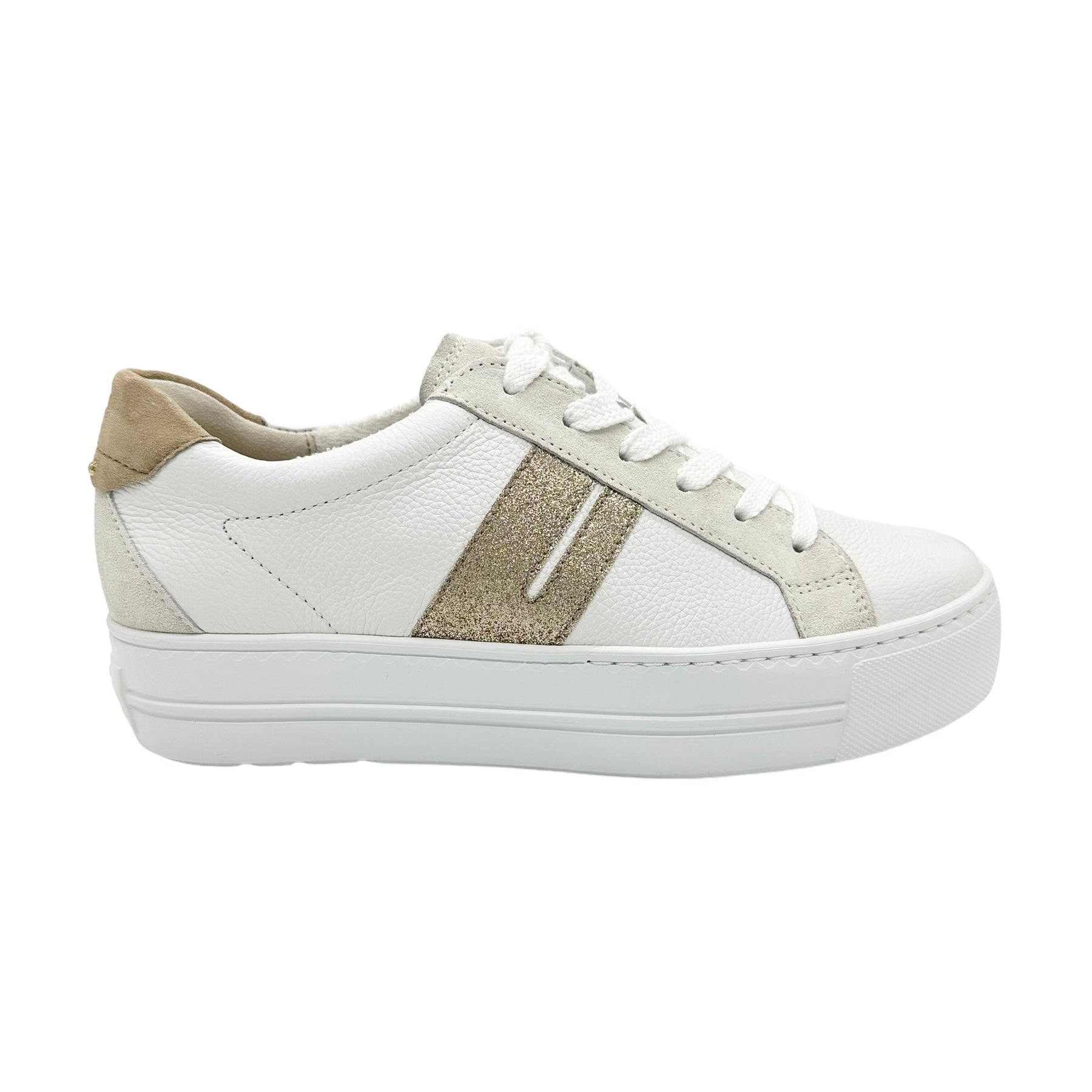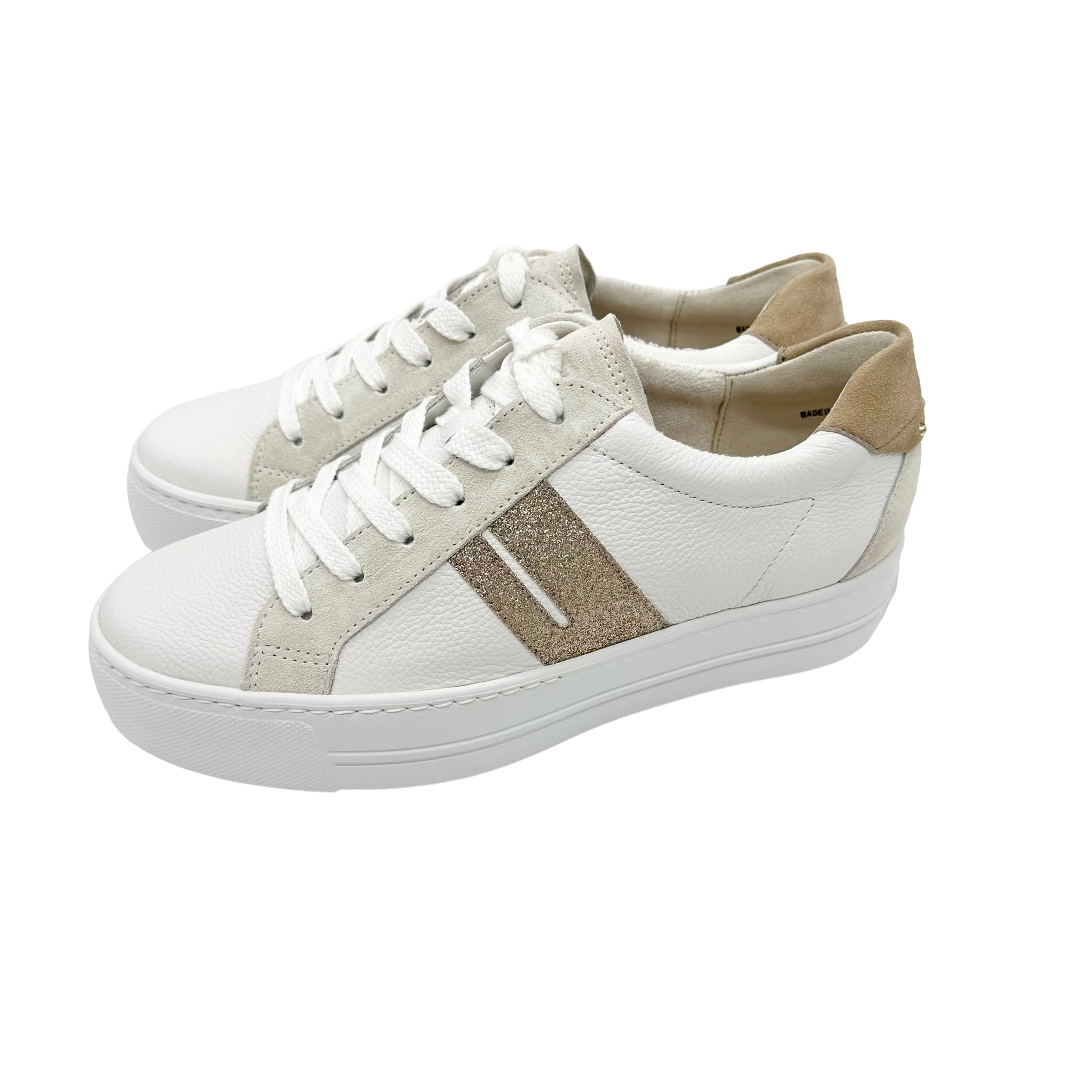 Paul Green super soft calf leather sneakers. These incredibly soft and lightweight sneakers showcase the luxury leathers from a master shoemaker. These cute mini platforms can be worn with a summer dress, skirts and shorts and your cut off jeans with ease. This model has discrete pastel toned suede padded heel and ankle cuff with gold studs. The retro glitter stripe adds a touch of sparkle and lifts the trainer into the realms of glamour, couple this with the outstanding comfort which will encourage you to wear them everyday. A winning combination that makes you wonder how you managed without your Paul Green shoes. Handmade in Austria using only the finest leathers for admirable quality and exclusive design.