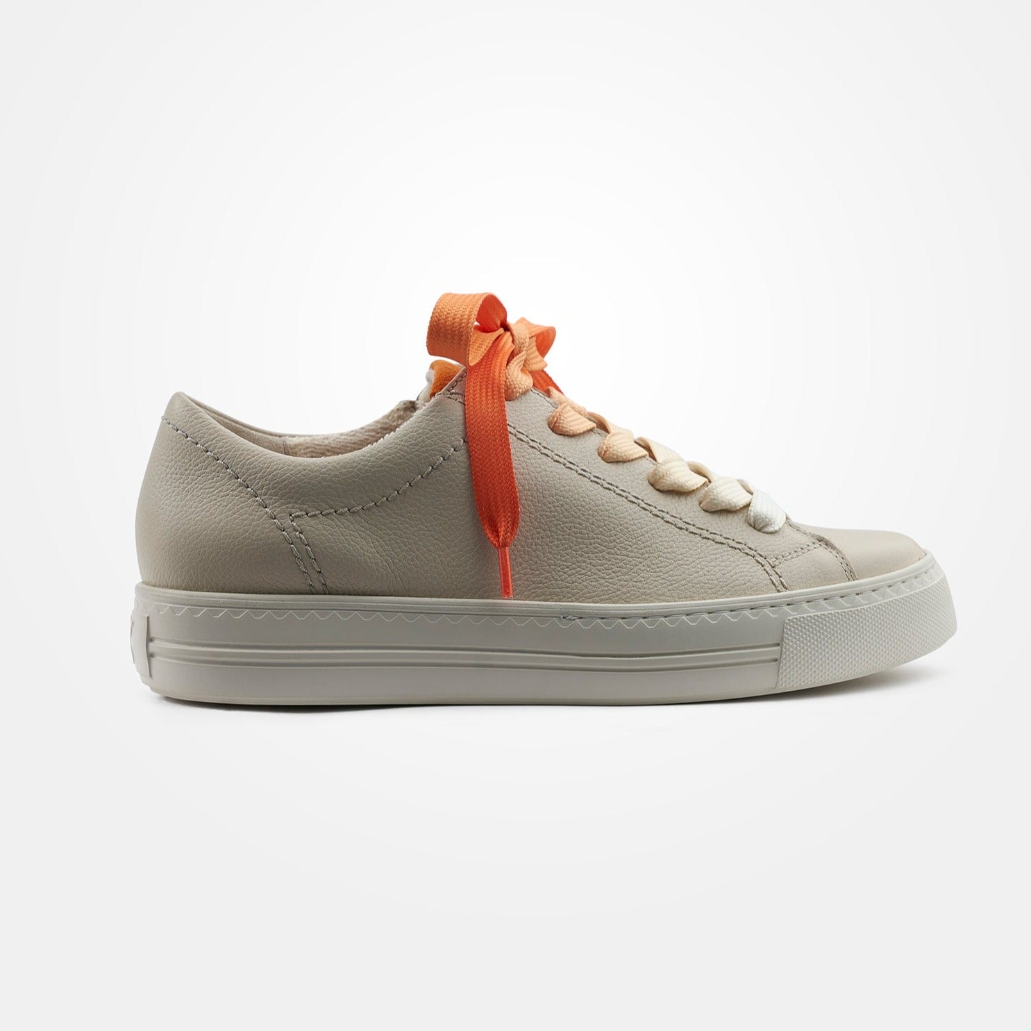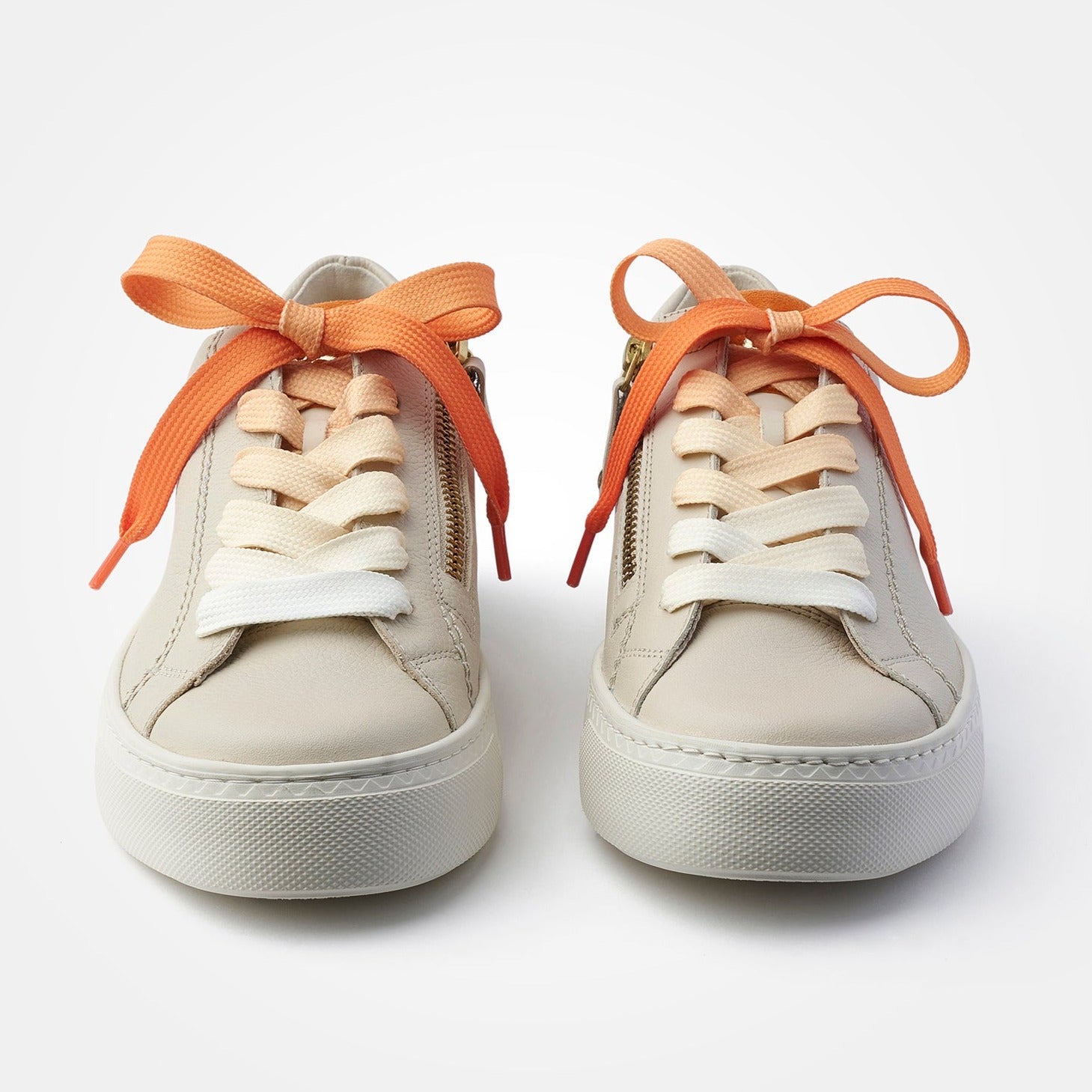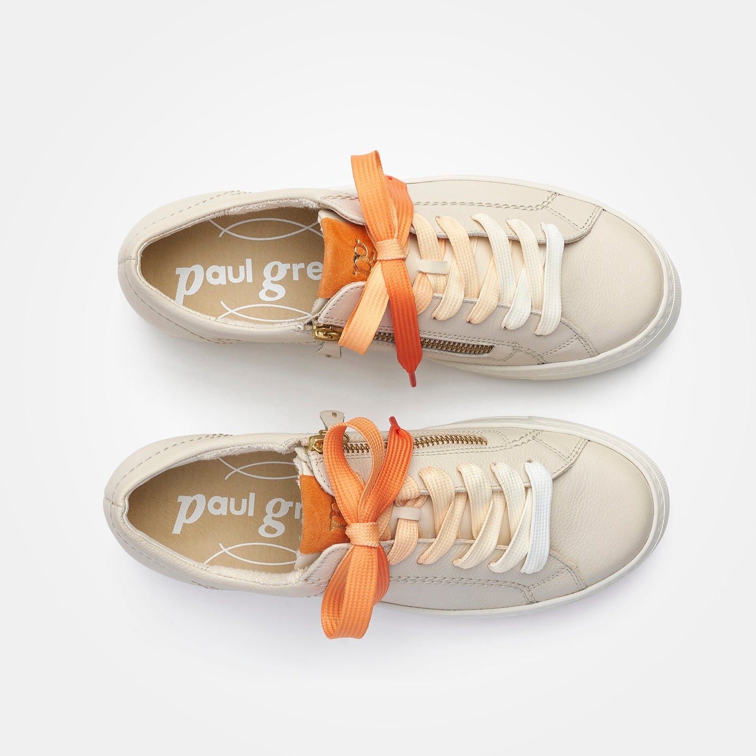 Paul Green super soft calf leather sneakers. These incredibly soft and lightweight sneakers showcase the luxury leathers from a master shoemaker. These cute mini platforms with a papaya ombre coloured lace can be worn with a dress, skirts and shorts and your cut off jeans with ease. This model has a side zip and a padded heel and ankle cuff. The outstanding comfort will encourage you to wear them everyday and you will wonder how you managed without them. Paul Green shoes are handmade in Austria using only the finest leathers for admirable quality and exclusive design.